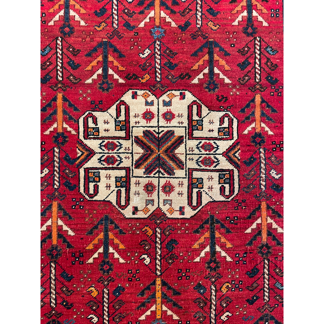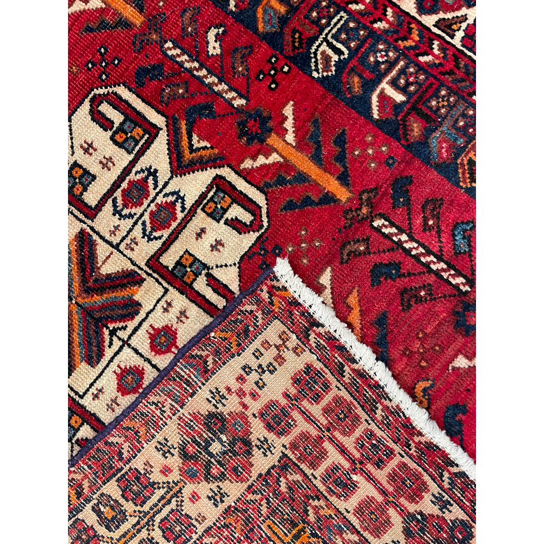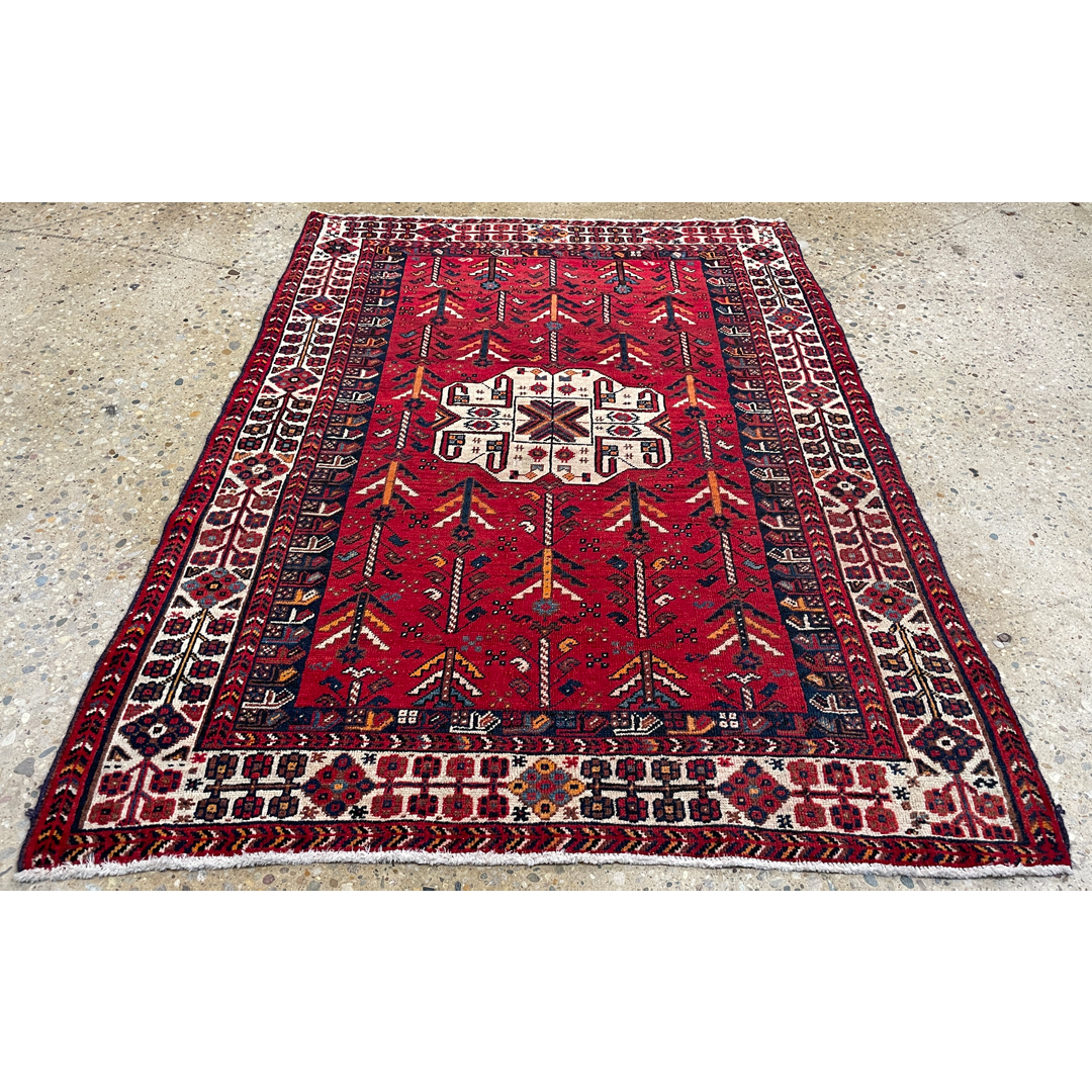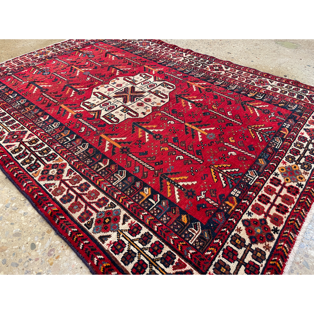 Add a touch of tribal character to your space with this sensible 3’10” x 5’2″ ft. antique Persian Shiraz rug. A genuine hand-knotted piece from the 1940s, this rug features a vibrant rust-red field decorated with a classic tribal repertoire. The design centers on a striking, ivory geometric medallion, surrounded by repeating rows of stylized cypress trees and abstract motifs in shades of deep indigo, sage, and cream. Framed by multiple geometric borders filled with rosette and vine patterns, this durable wool rug offers an authentic nomadic aesthetic perfect for adding warmth and history to an entryway, kitchen, or reading nook.