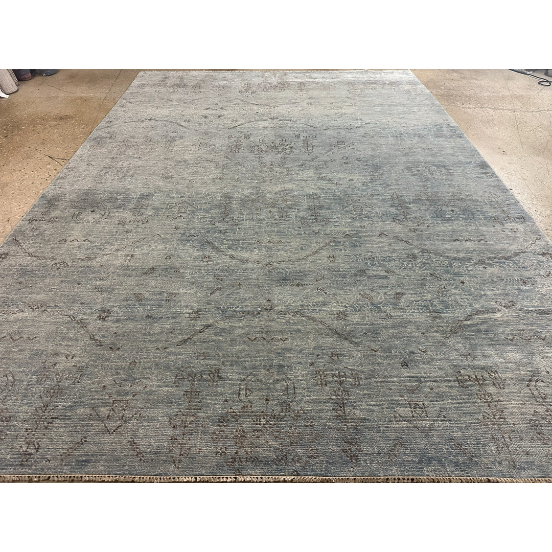 Embrace the serene and subtle beauty of this 9’11” x 13’9″ ft. modern rug. Its unique design features large-scale, wavy or scalloped bands that flow across the field, creating a sense of gentle, organic movement. This contemporary pattern is layered over a heavily distressed or “erased” background of traditional motifs, all rendered in a tranquil, monochromatic palette of muted blue-gray and silvery tones. A soft, elegant sheen enhances the rug’s texture, making it a sophisticated and calming foundation for any spacious living room, master bedroom, or dining area.