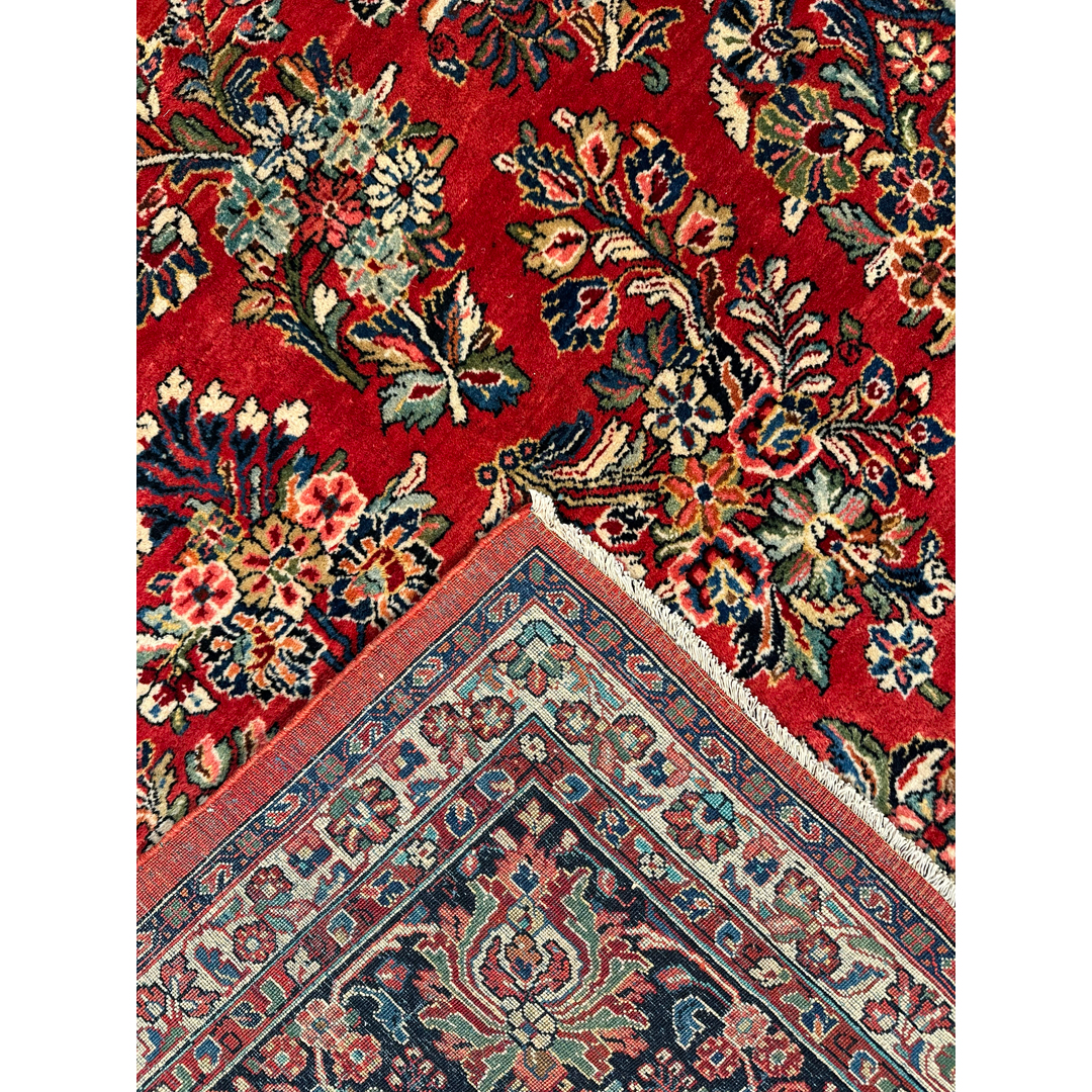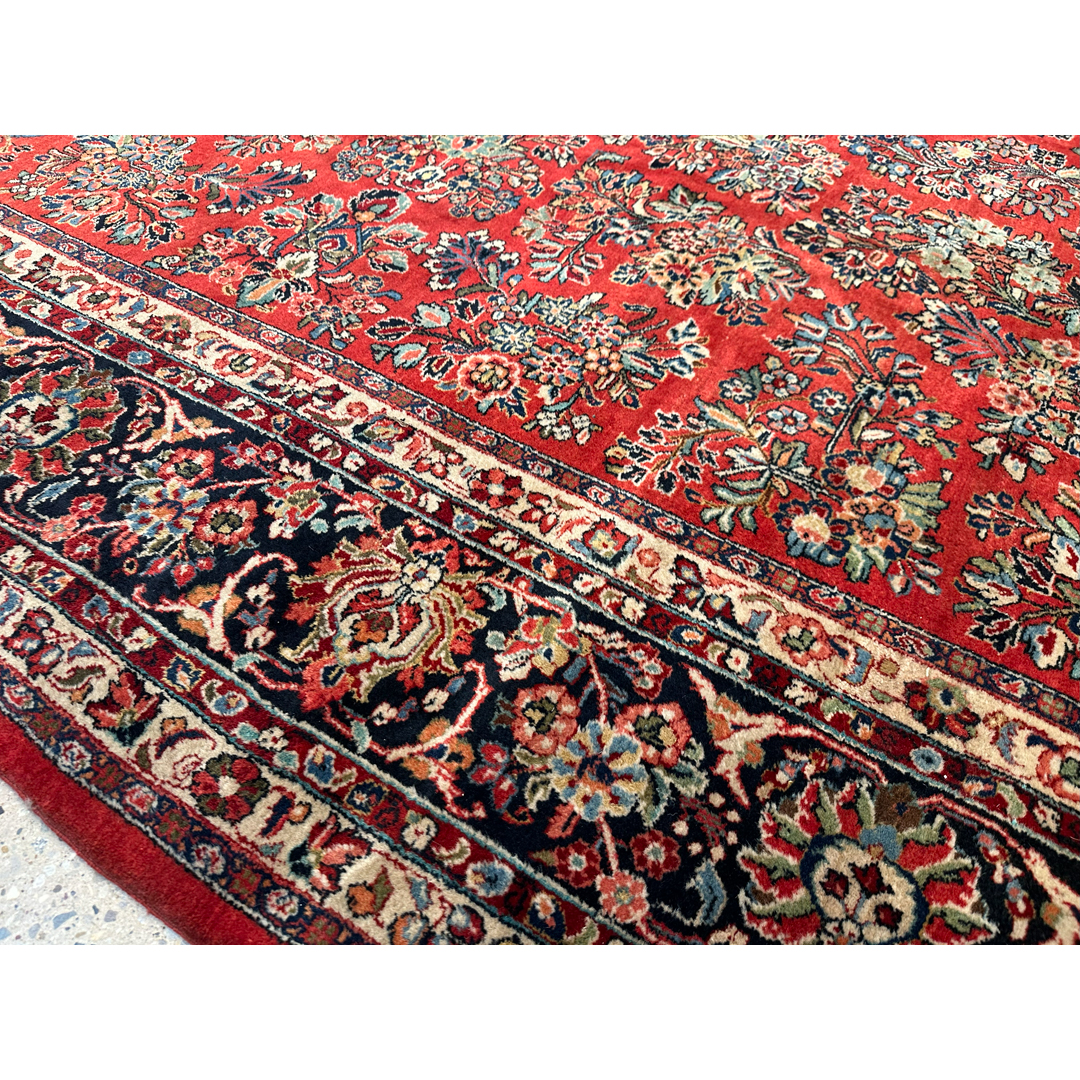 Anchor your grandest space in a sea of opulent color with the Sexy Sarouk, a magnificent antique Persian rug hand-knotted in the 1930s. Measuring a generous 10’5″ x 13’7″ ft., this oversized 10×14 area rug showcases a breathtaking, all-over “millefleur” (thousand flowers) design. A vibrant, jewel-toned ruby red field provides a stunning, luminous canvas for the dense and intricate symphony of floral sprays, bouquets, and scrolling vines, rendered in a rich palette of deep indigo, soft blues, greens, and creamy ivory. Framed by a stately, wide border in a contrasting dark navy, this rug is a masterpiece of 1930s Persian artistry. Its dense, plush wool pile is a testament to its heirloom quality, making it the ultimate foundation for a formal living room, a grand dining hall, or a stately library.