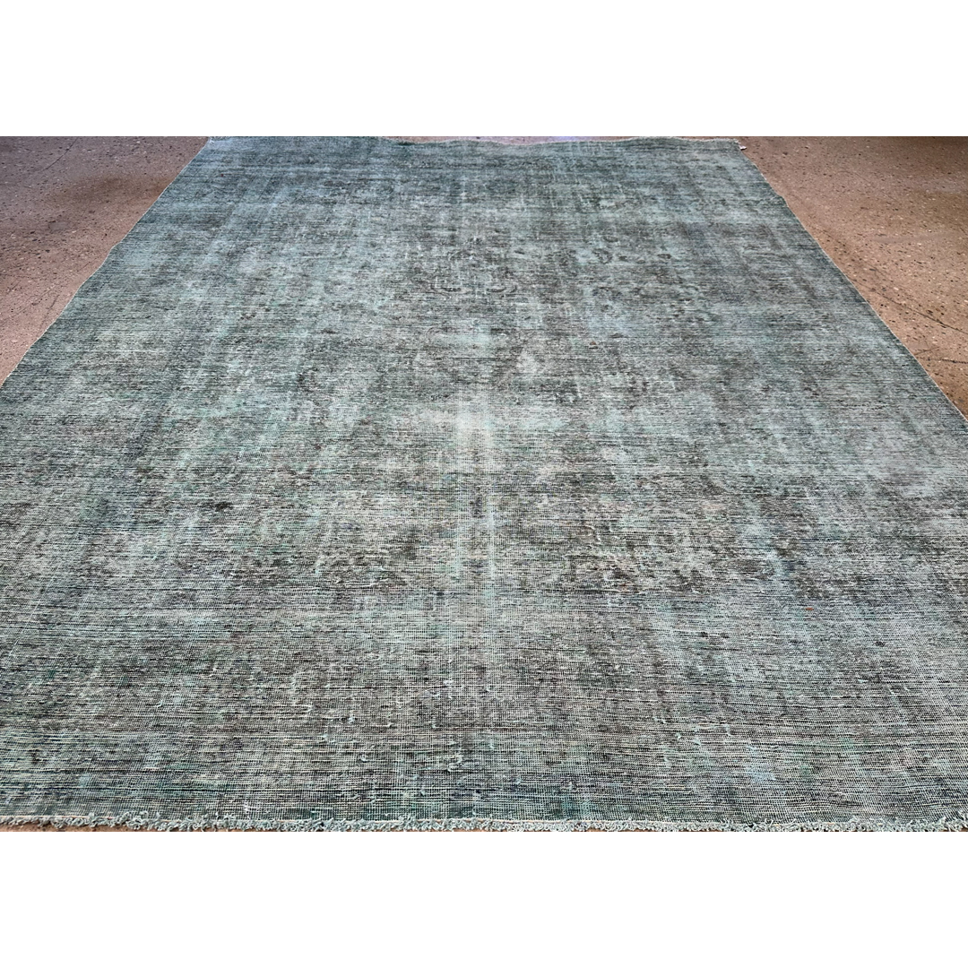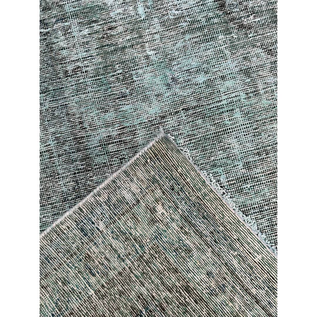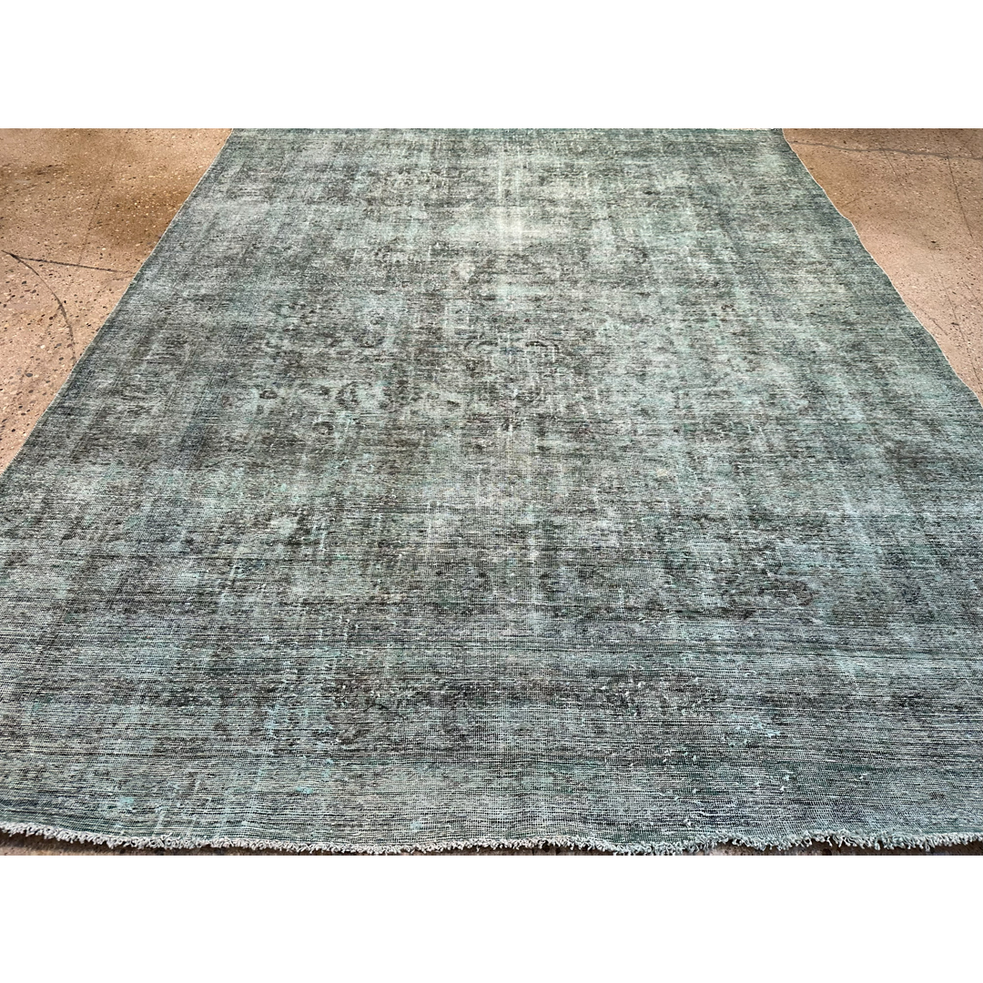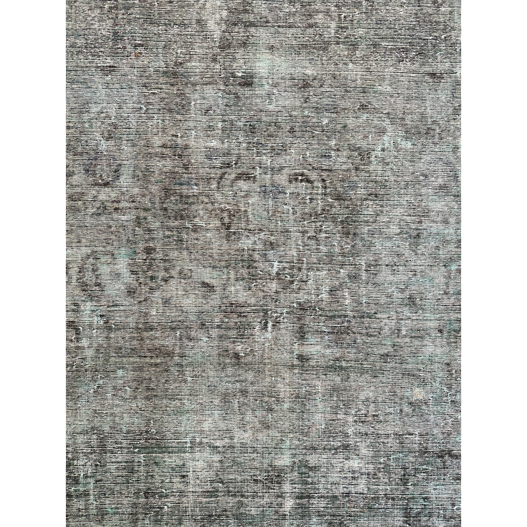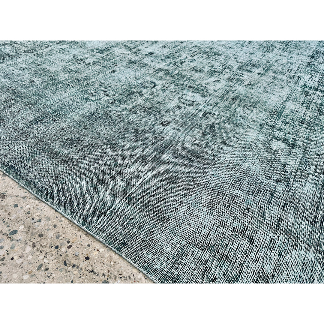 This captivating vintage Persian Tabriz rug is a masterful study in the highly coveted overdyed, “erased” aesthetic. Originally woven with the incredibly dense, intricate classical patterns characteristic of master Tabriz artisans, this piece has undergone a transformative expert distressing and overdyeing process. The original formal composition has been brilliantly stripped back, leaving behind a subtle, ghost-like textural watermark that beautifully bridges the gap between centuries of old-world craftsmanship and edgy, contemporary minimalism. The dramatic overdyeing process has saturated the premium wool pile in a breathtaking, moody palette of deep teal, oxidized aqua, stormy slate gray, and rich charcoal.
