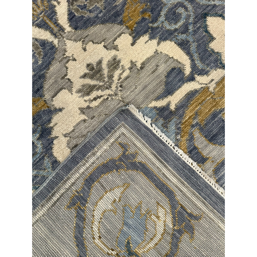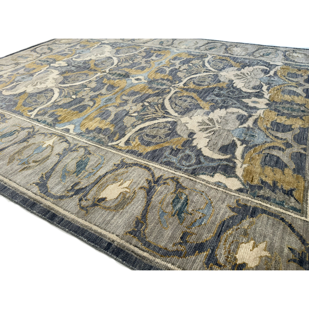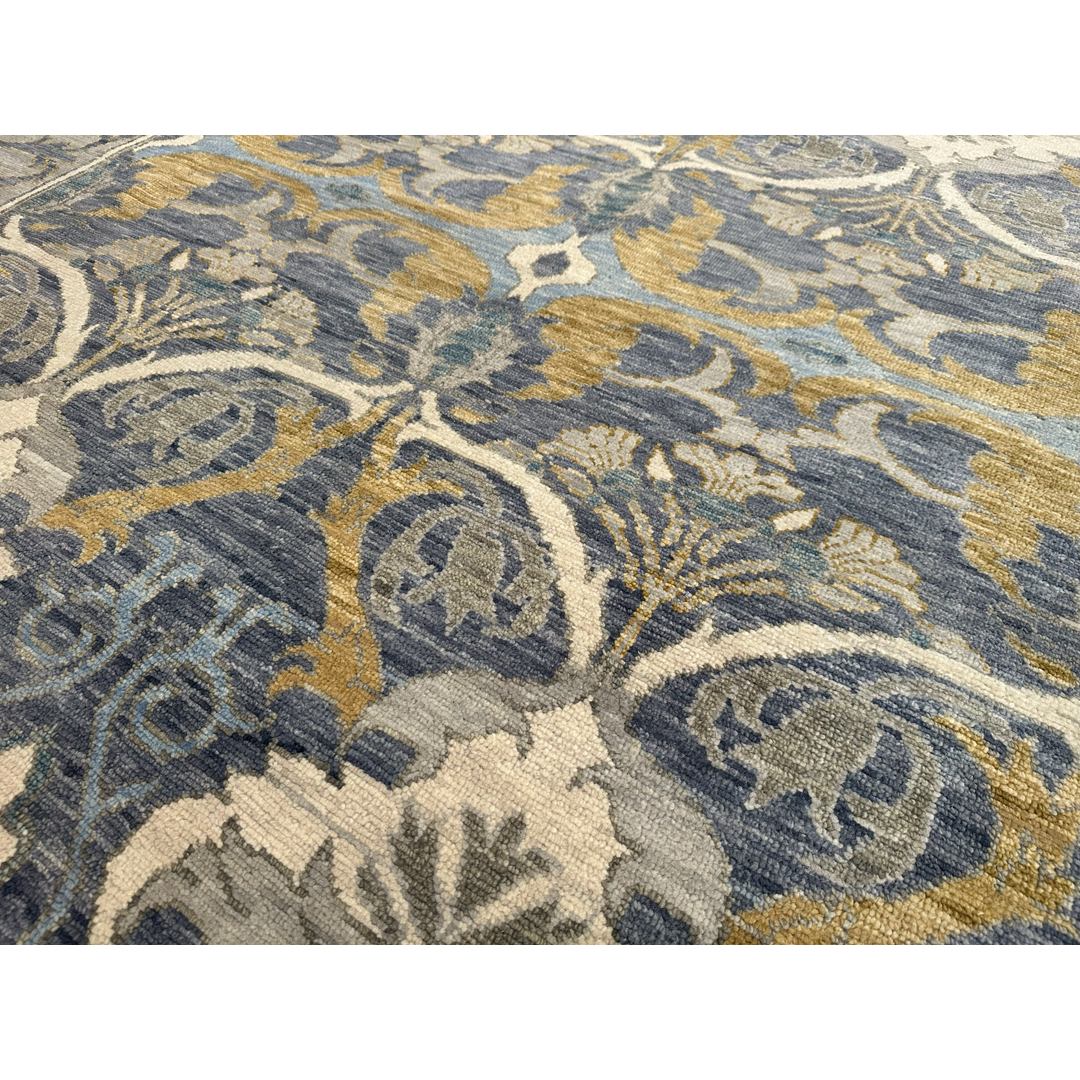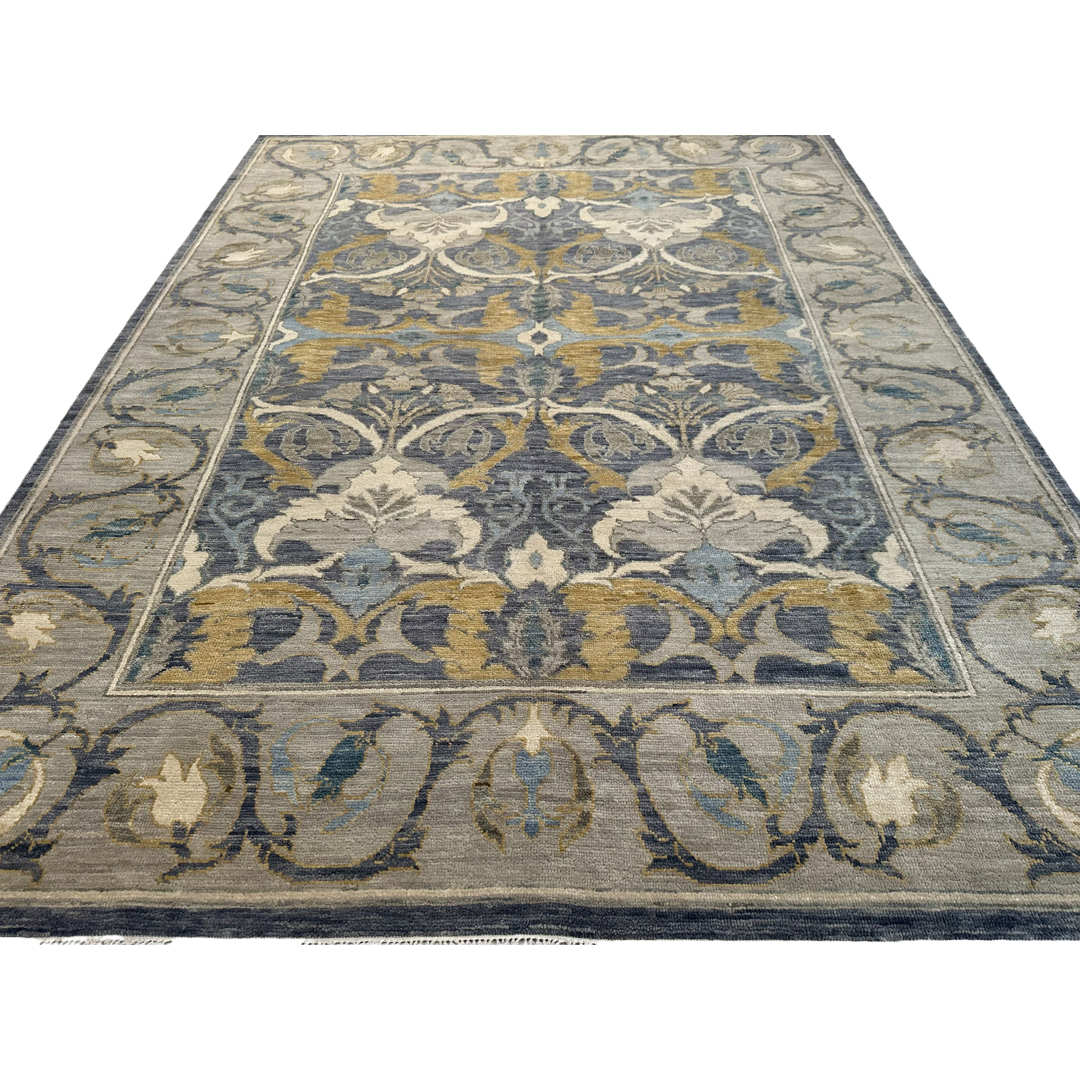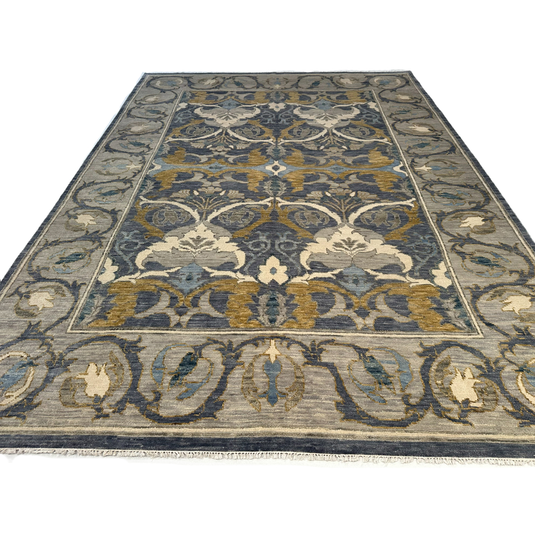 This exquisite hand-knotted Indian rug offers a sophisticated, transitional interpretation of classic William Morris and Arts & Crafts design principles. The grand, sweeping composition features a bold, mirrored damask pattern of large-scale acanthus leaves, stylized lotus palmettes, and scrolling botanical vines. Rendered in an elegant, muted palette, the intricate motifs of warm gold, soft icy blue, and crisp ivory pop beautifully against a deeply saturated, charcoal-blue central field. The dramatic interior is perfectly framed by a wide, contrasting border of heathered greige, adorned with continuous, undulating charcoal vines that mirror the fluidity of the central pattern.