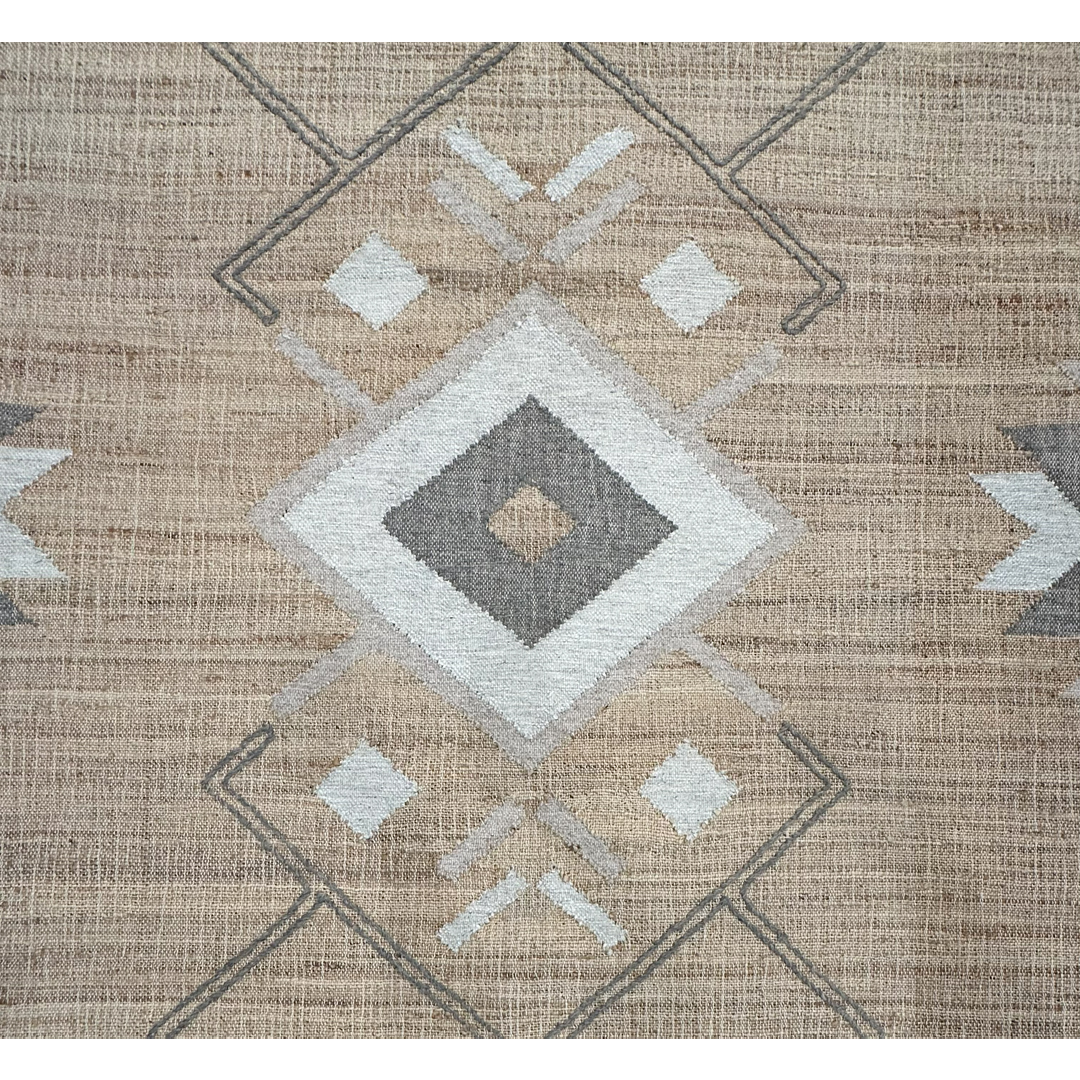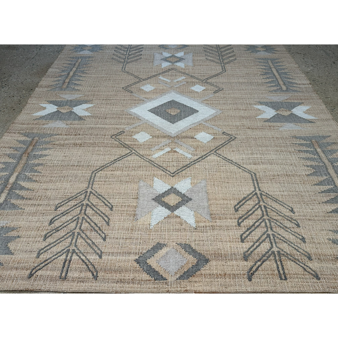 This flatweave rug features a striking tribal-inspired geometric composition. The design centers on a large diamond medallion flanked by stylized arrows and serrated geometric forms in ivory, charcoal, and soft grey. Woven from a blend of natural jute and wool, the rug offers a rich, organic texture with a neutral tan field that emphasizes its handcrafted architectural lines. The durable flatweave construction and earthy palette make it an ideal choice for high-traffic areas, providing a sophisticated southwestern or global-modern aesthetic to any interior.