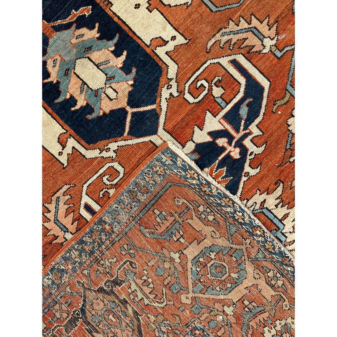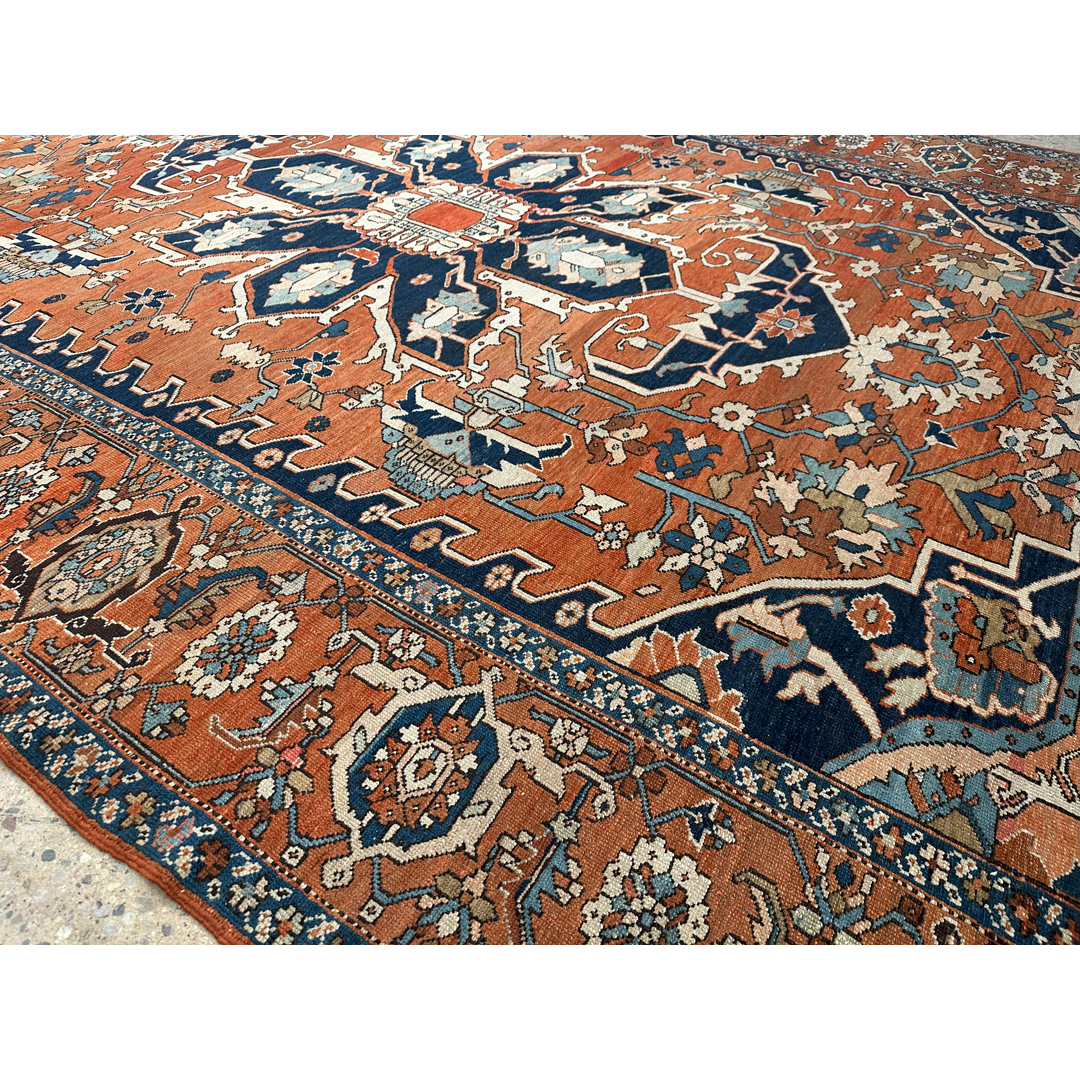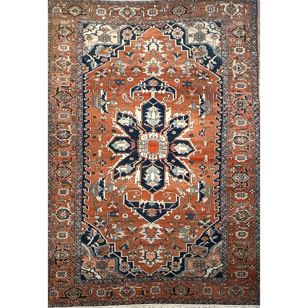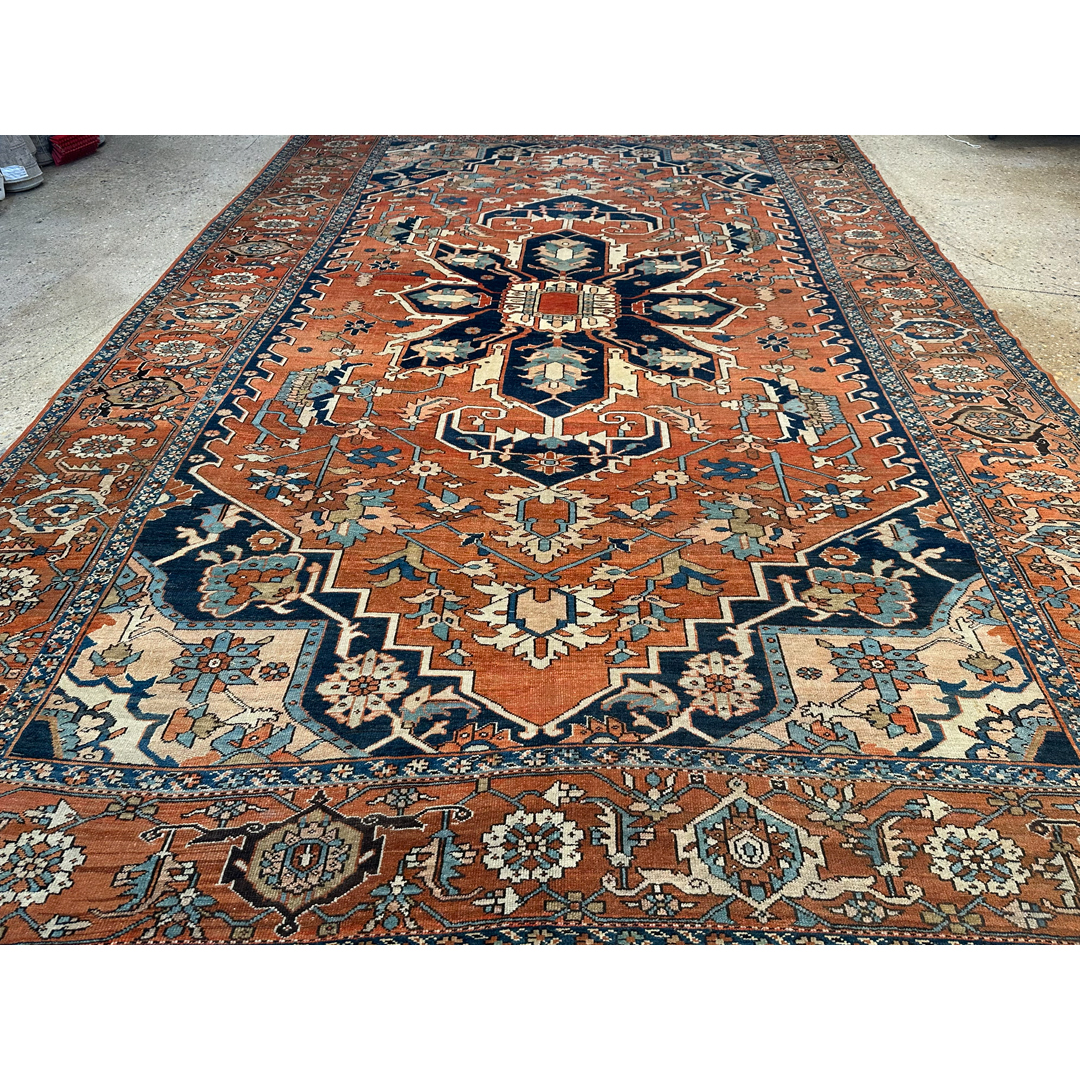 Command the room with the geometric grandeur of this special 10’1″ x 14’6″ ft. antique Persian Serapi rug. Hand-knotted in the 1890s, this collector-level piece features a rich, open terracotta rust field that immediately warms the space. The design is dominated by a massive, multi-layered geometric medallion rendered in striking shades of midnight indigo, ivory, and soft slate blue. Distinctive ivory corner spandrels frame the field, providing a bright contrast and highlighting the bold angularity of the central motif. Encircled by a wide border featuring the classic turtle or samovar vine pattern, this rug offers the crisp, open design and distinct coloration that defines the sought-after Serapi aesthetic, making it a perfect centerpiece for a grand estate living room or library.