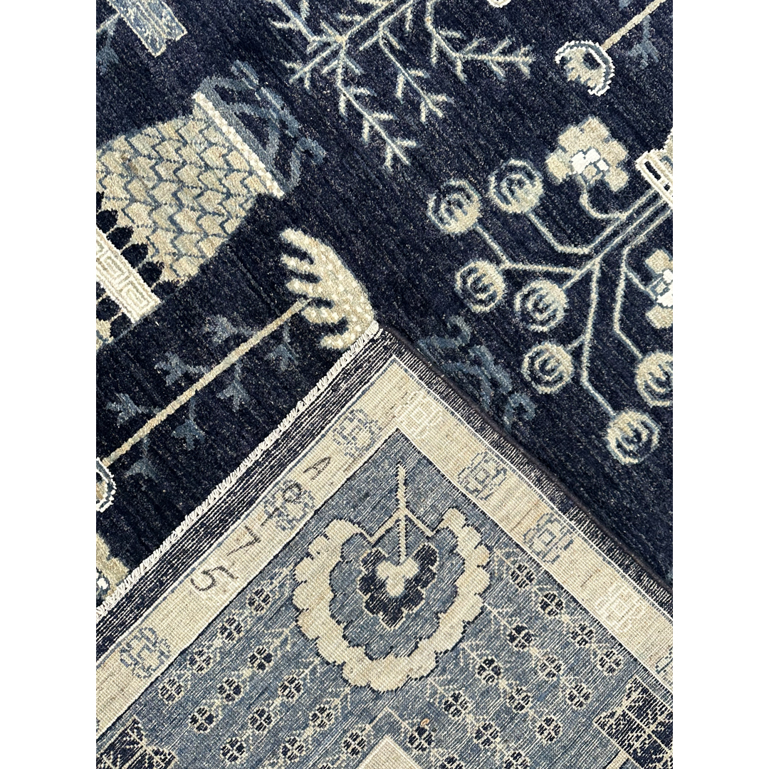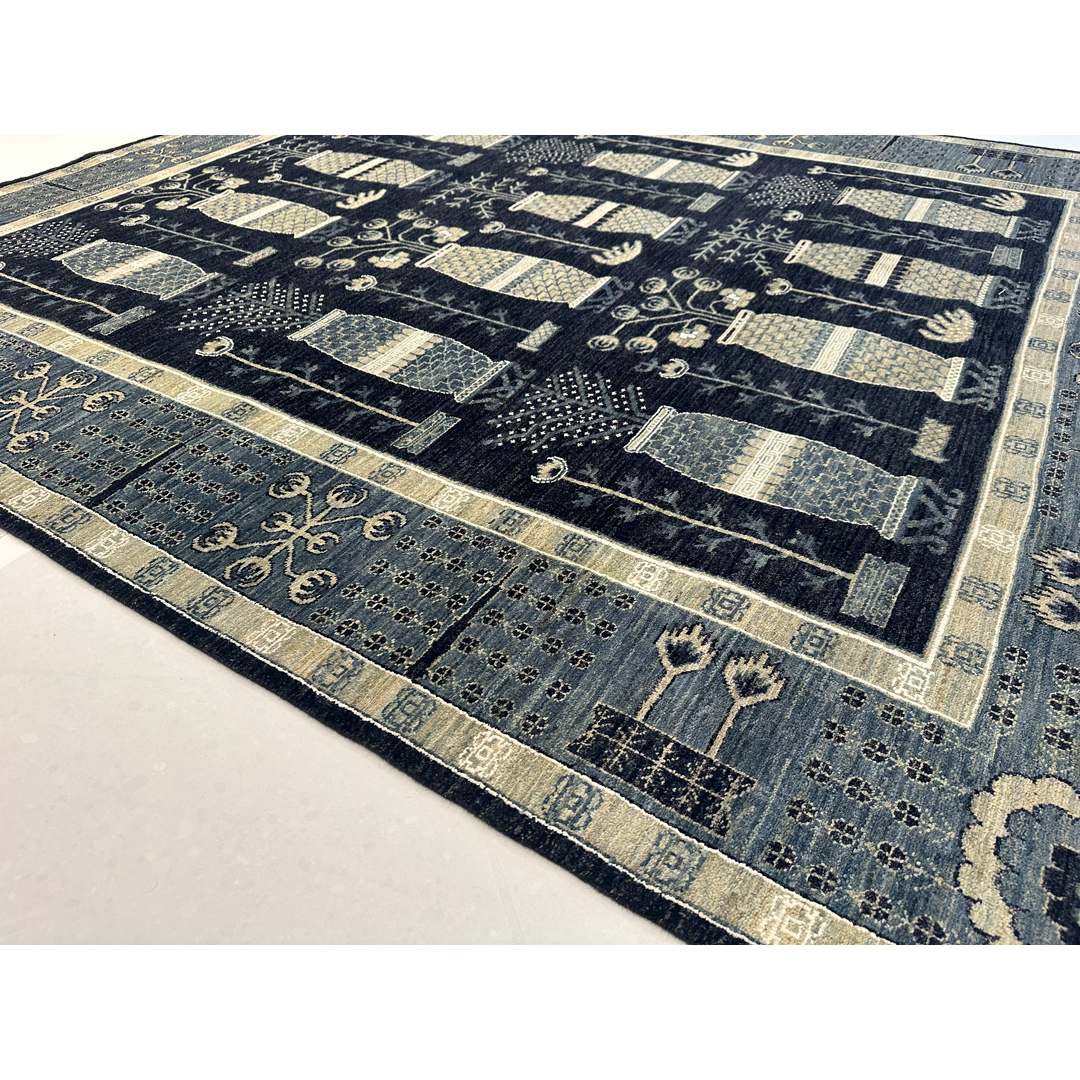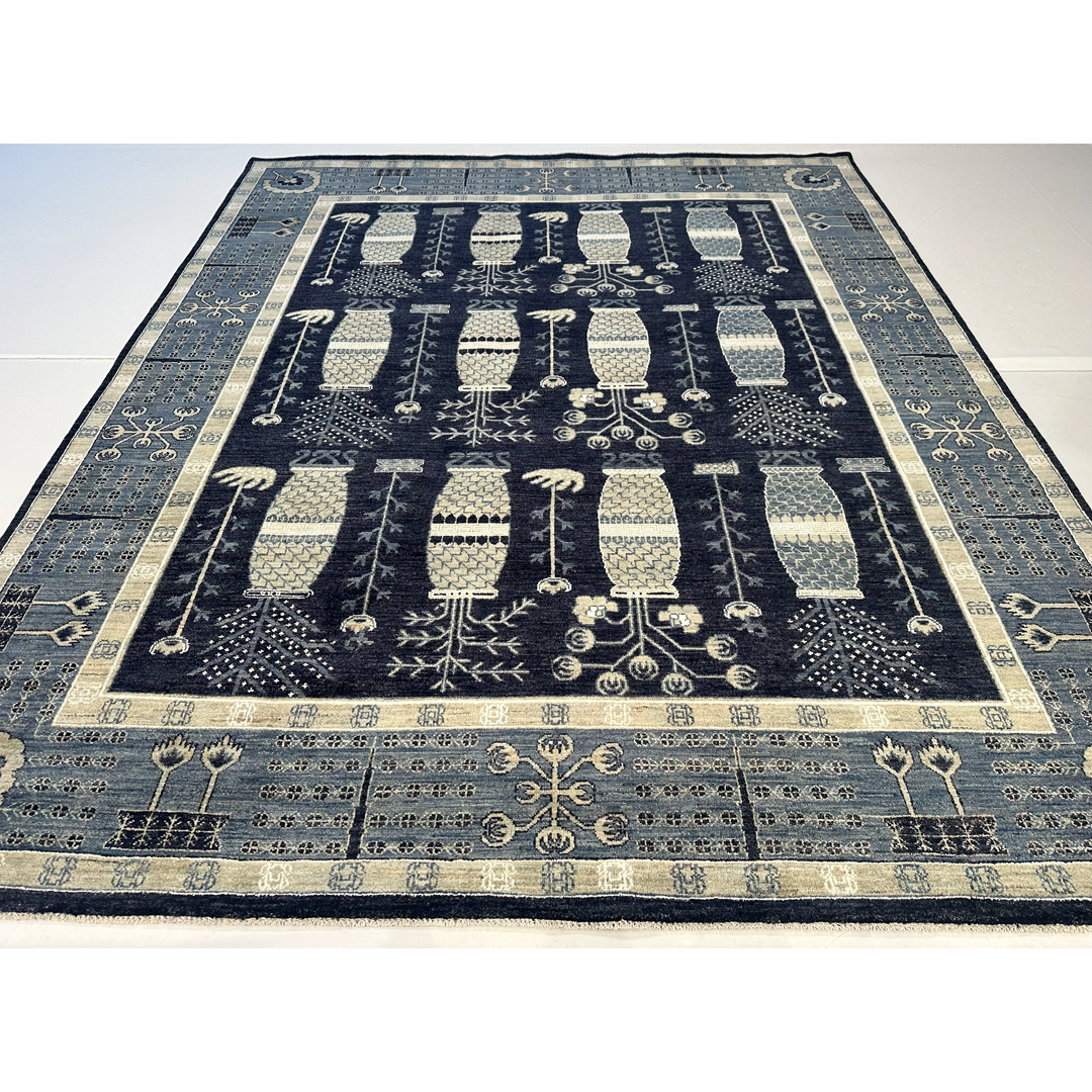 This striking hand-knotted Afghan rug offers a bold, transitional interpretation of classic Central Asian Samarkand and Khotan weaving traditions. The highly structured, graphic composition is defined by a mesmerizing grid of repeating vase motifs, each holding stylized “Tree of Life” or pomegranate branches. Rendered in crisp ivory, warm taupe, and soft grey, these ancient geometric botanical elements pop with breathtaking clarity against a deeply saturated, midnight navy-black field.