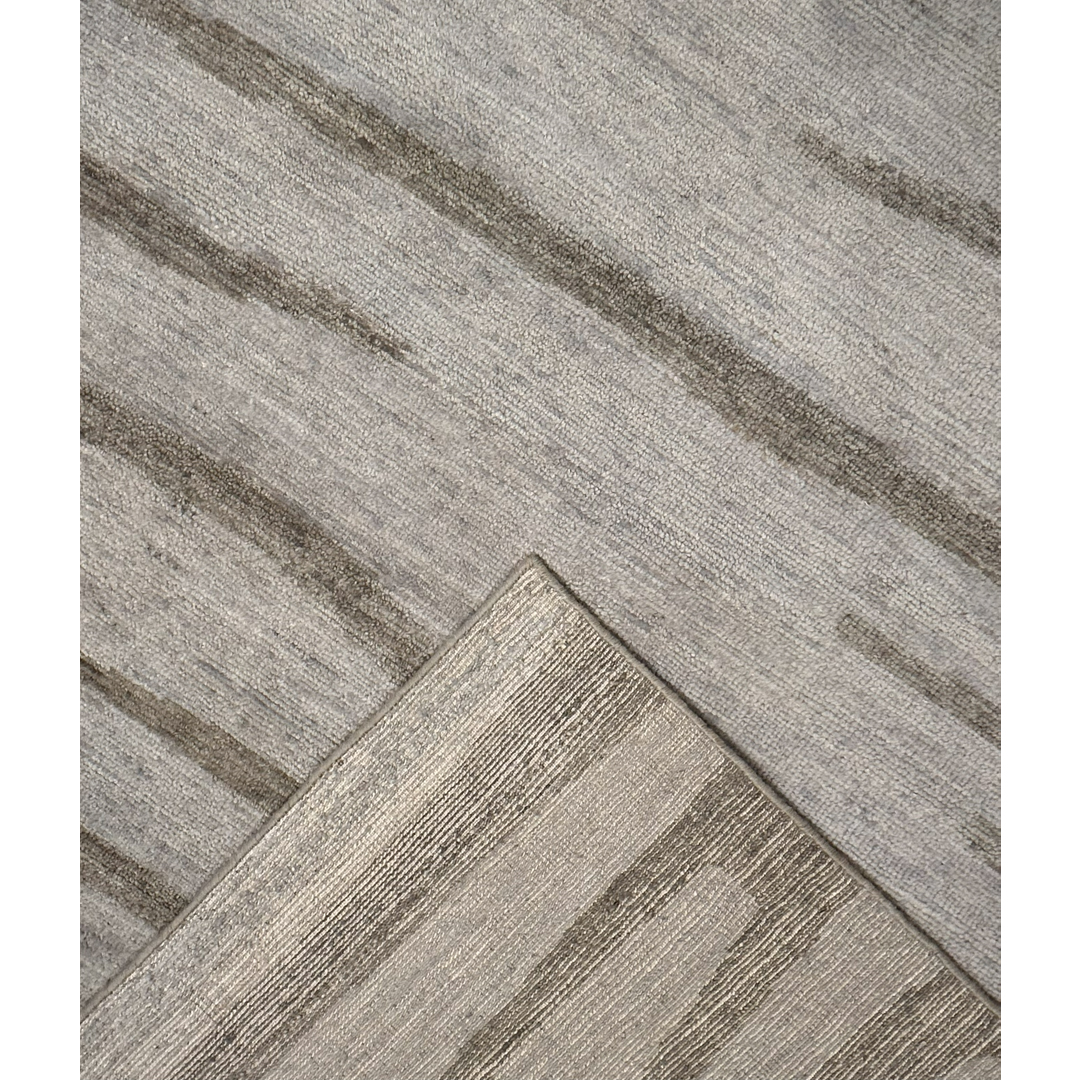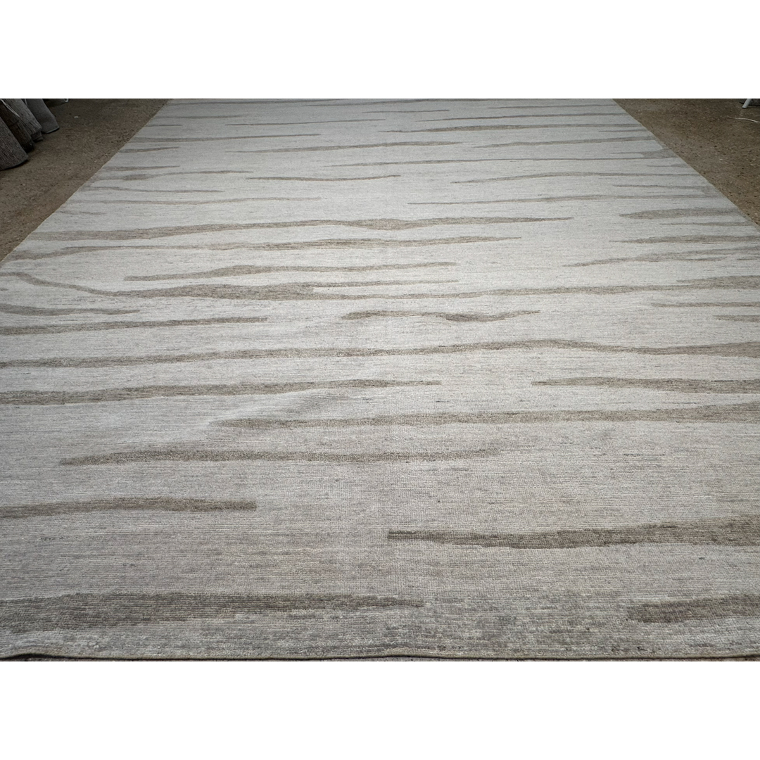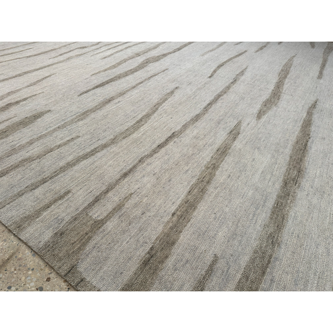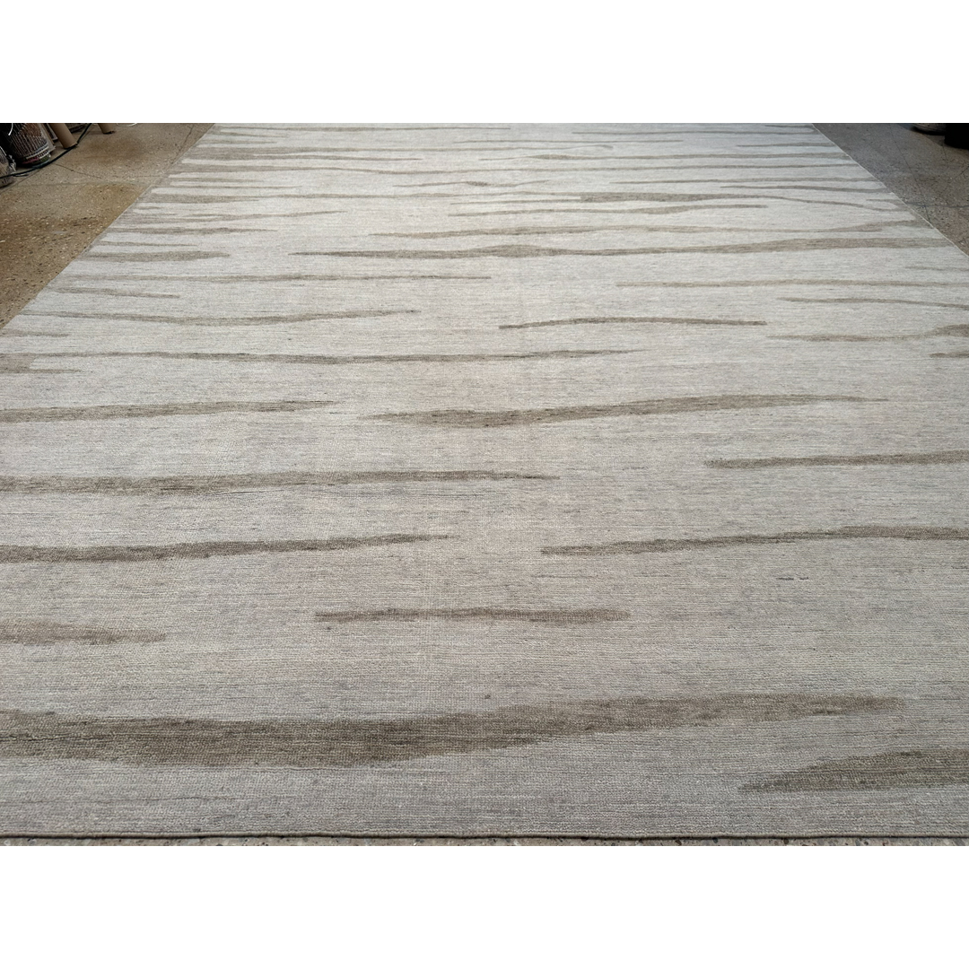 Transform your home with the modern sophistication of this stunning 12′ x 15′ ft. abstract area rug. Hand-knotted using high-quality wool, this piece features a luminous ivory and cream background that provides a bright and airy foundation for the room. The design is defined by organic, horizontal striations and ripple-like patterns rendered in soft shades of taupe and warm grey, evoking the natural beauty of sand dunes or flowing water. This contemporary composition offers a dynamic sense of movement while maintaining a neutral and versatile color palette. Its grand scale and plush texture make it an exceptional choice for anchoring a spacious great room, a modern loft, or an open-concept living area seeking a touch of artistic flair.