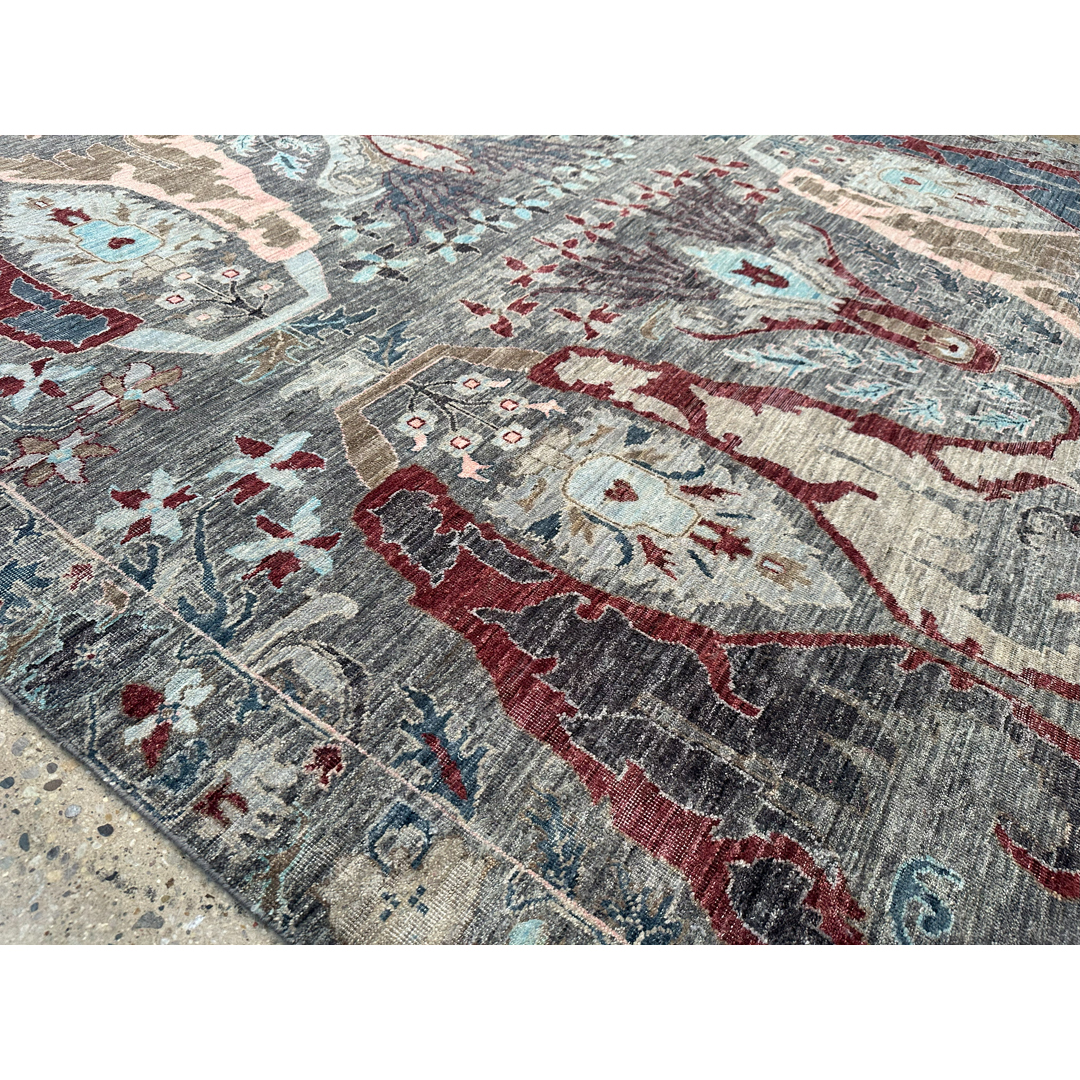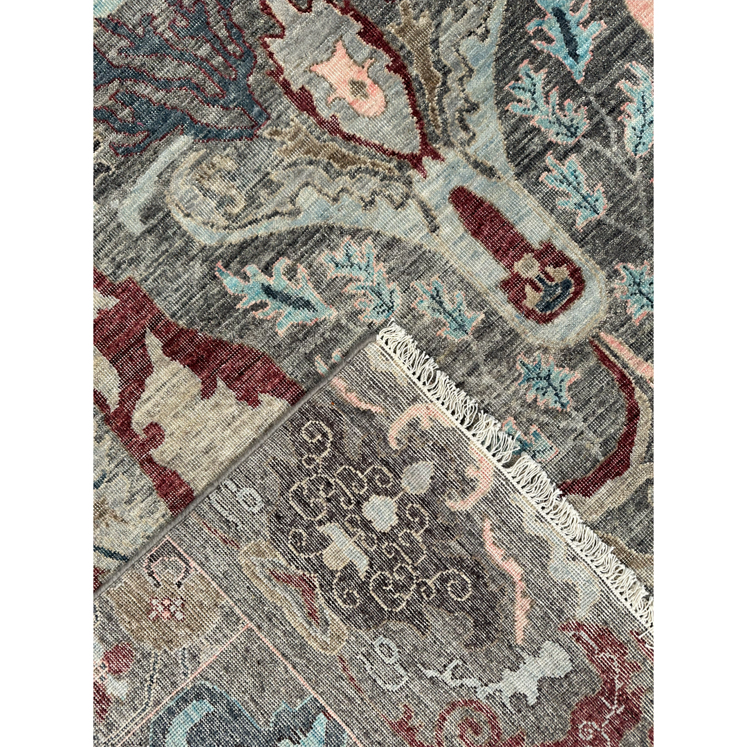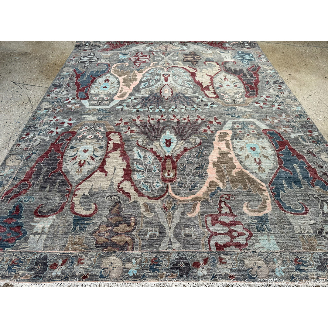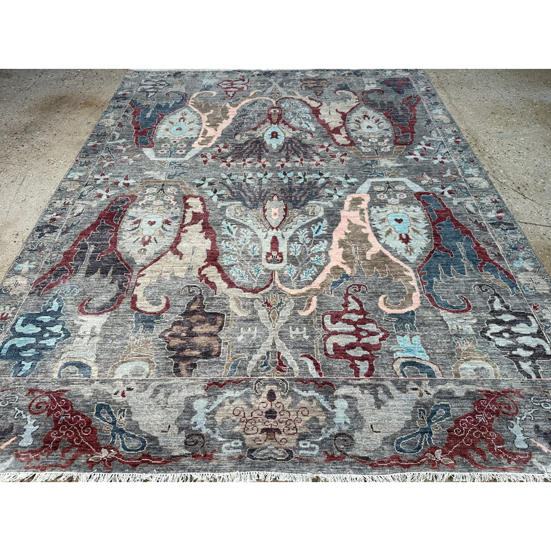 Introduce a captivating, artistic spirit into your home with this stunning transitional rug. Measuring 8’1″ x 10’2″ ft., this 8×10 area rug features a striking, symmetrical pattern of large-scale, abstract floral and damask-like motifs. A sophisticated, multi-tonal gray field provides a modern and versatile backdrop for the bold, contemporary color palette, which includes vibrant pops of deep burgundy, rich teal, soft peach, and warm brown. Expertly crafted with a plush pile, this rug feels luxurious underfoot and is the perfect centerpiece to anchor a chic living room, a creative office, or a stylish dining area, masterfully blending traditional inspiration with a bold, modern edge. Contains wool and pure silk.