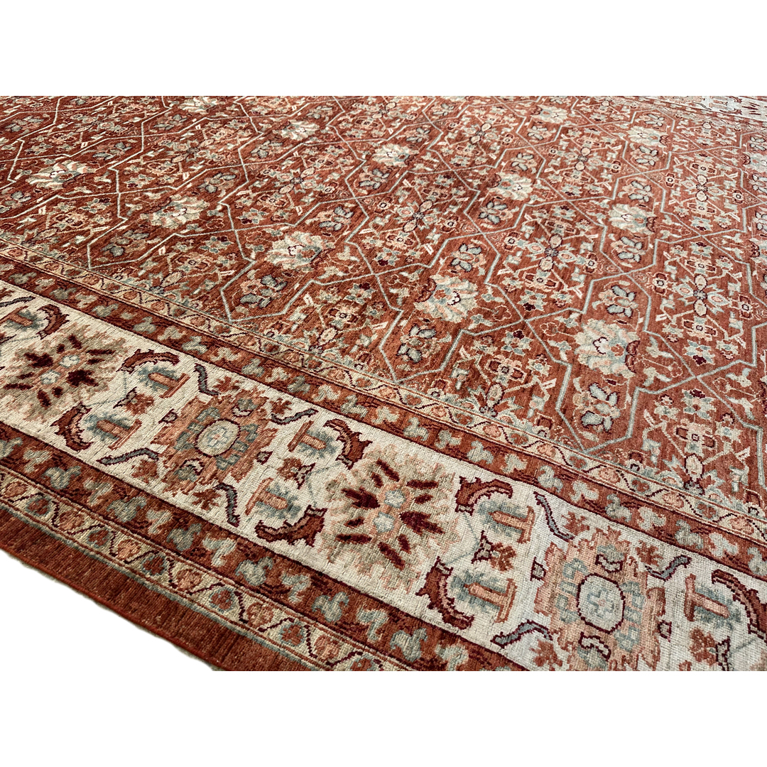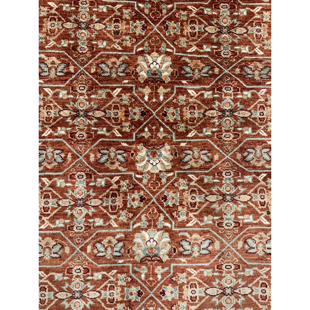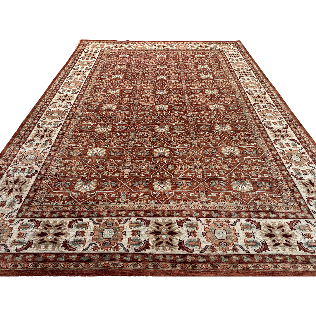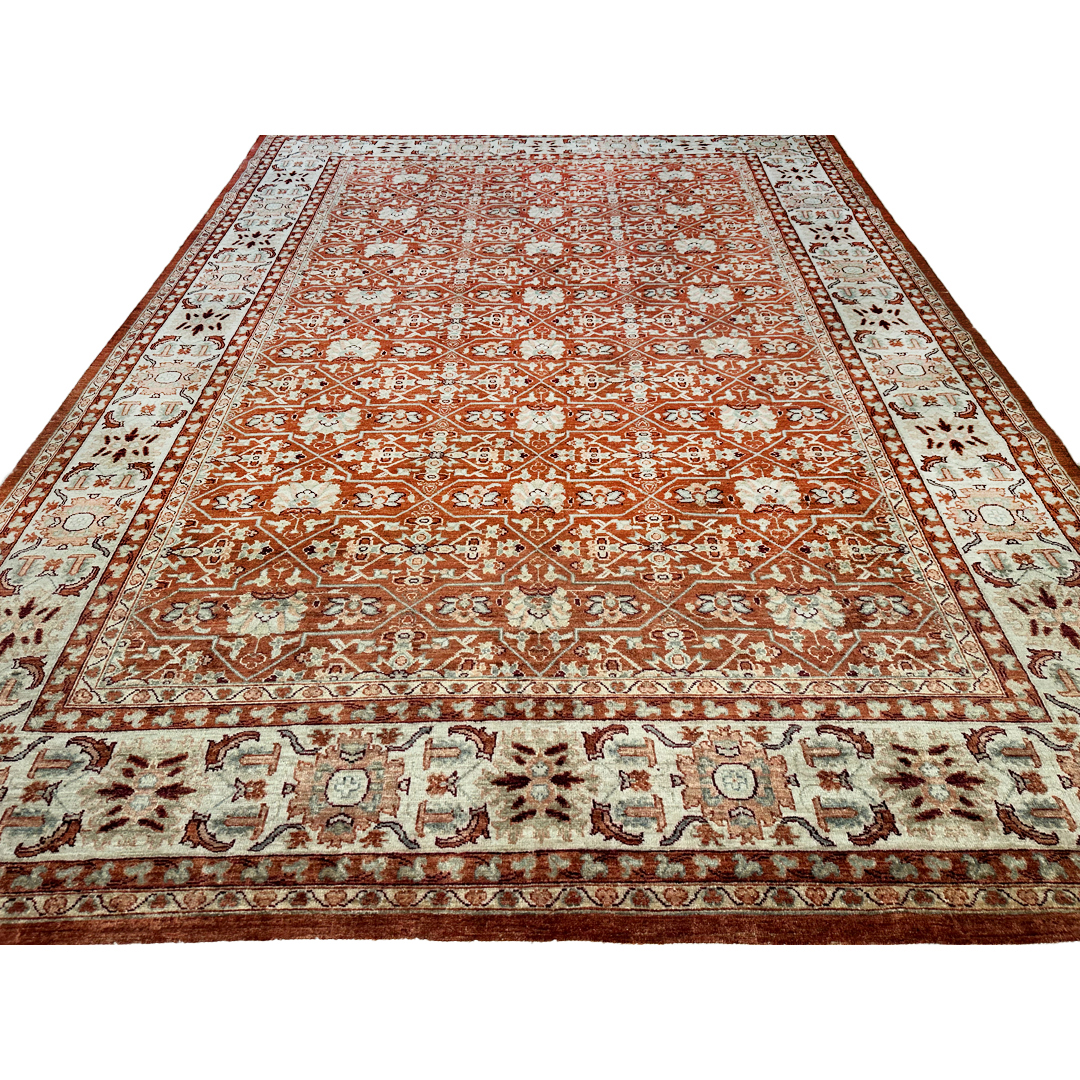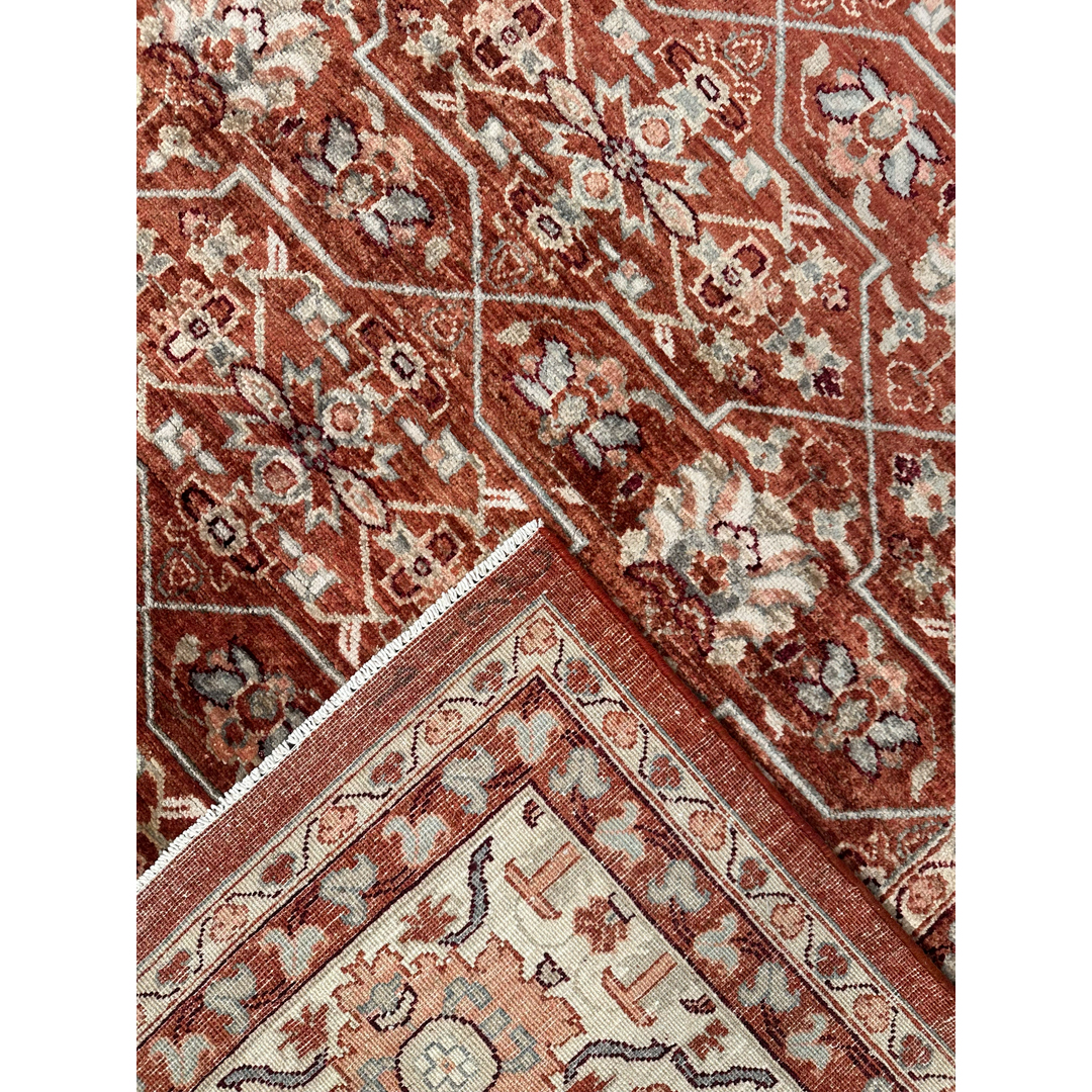 This exquisite hand-knotted Pakistani rug offers a transitional take on classic Peshawar design. The meticulously structured composition features a captivating, all-over geometric trellis pattern stretching across a deeply saturated, warm rust-red field. Within this intricate lattice framework, stylized botanical palmettes, delicate rosettes, and scrolling vines bloom in soft shades of ivory, sage, and charcoal, creating a stunning and continuous visual rhythm. The bold terracotta center is beautifully framed by a wide, contrasting border in luminous ivory, adorned with repeating geometric flora that perfectly balances the interior field. Masterfully woven with premium wool, this piece boasts the signature soft, luxurious finish that makes Peshawar rugs so highly coveted.