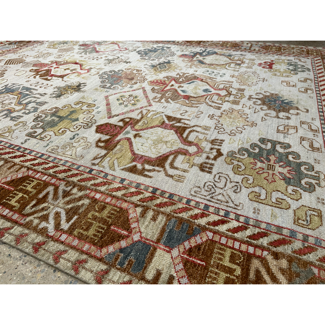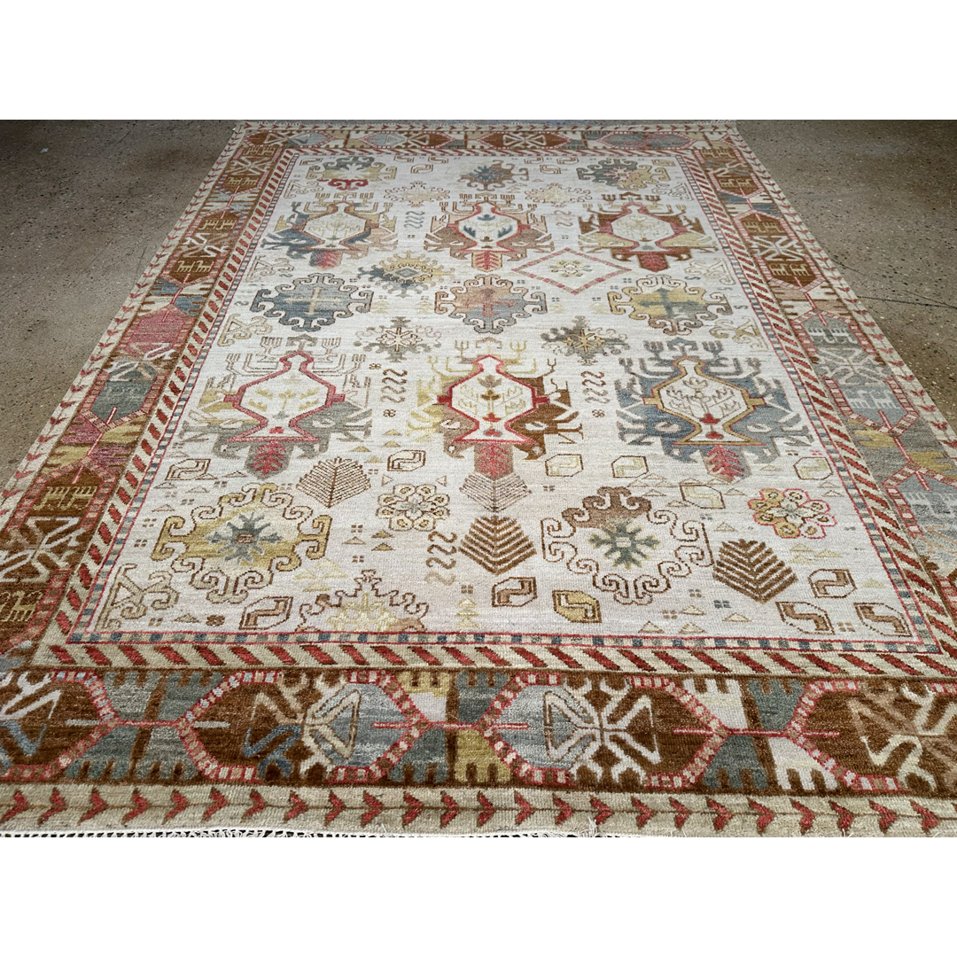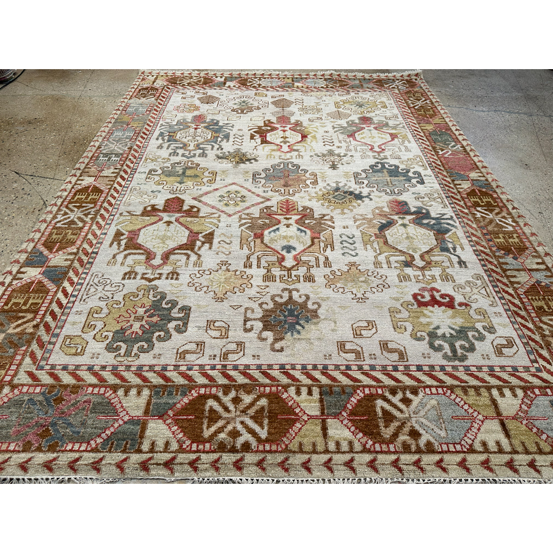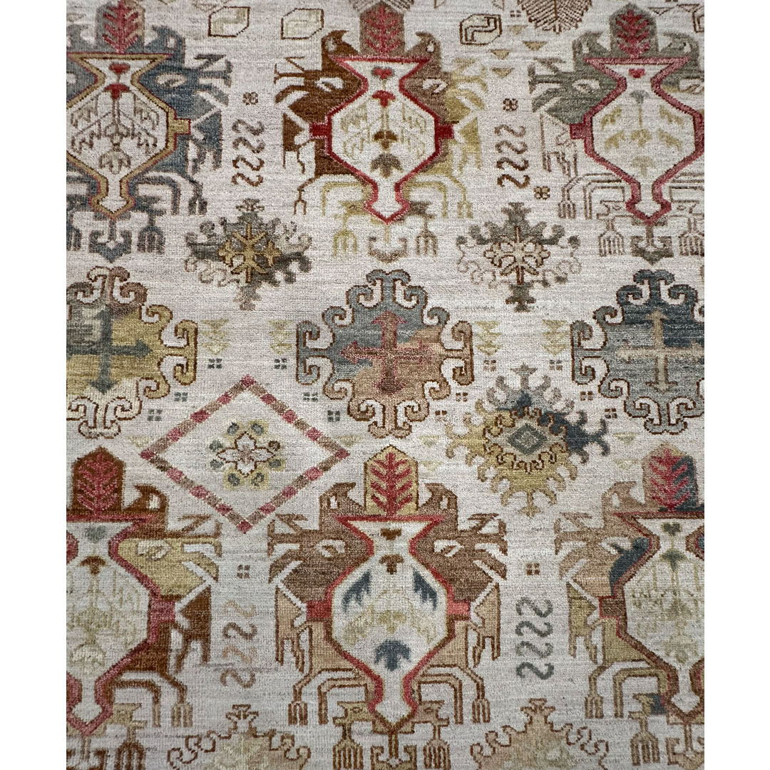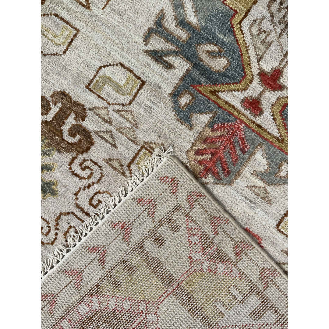 Bring warmth and artisan character into your home with this striking hand-knotted area rug from India, inspired by classic Oushak and tribal motifs. A softly antiqued ivory ground sets a calm backdrop for a series of expressive medallions and geometric symbols that feel storied yet approachable. Layers of earthy terracotta, muted olive, weathered blue, and warm sand create gentle contrast, giving the rug depth without overpowering the room. Woven with a dense, resilient pile, this rug offers lasting comfort underfoot and stands up beautifully in everyday living spaces. Its relaxed palette and heritage-inspired patterning pair effortlessly with wood tones, natural textiles, and both rustic and contemporary furnishings, making it a versatile anchor for living rooms, bedrooms, or dining areas that crave texture, personality, and timeless style.