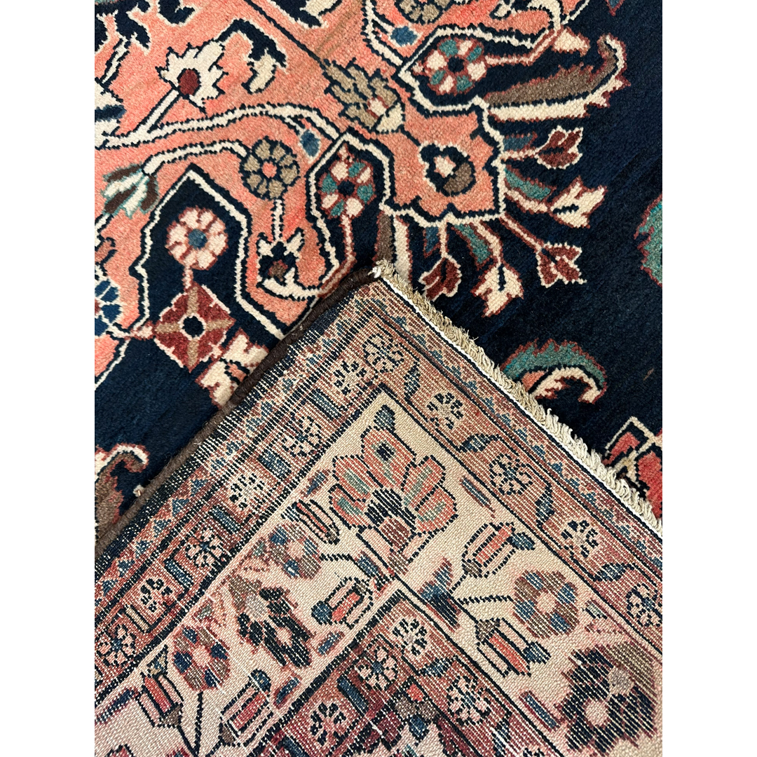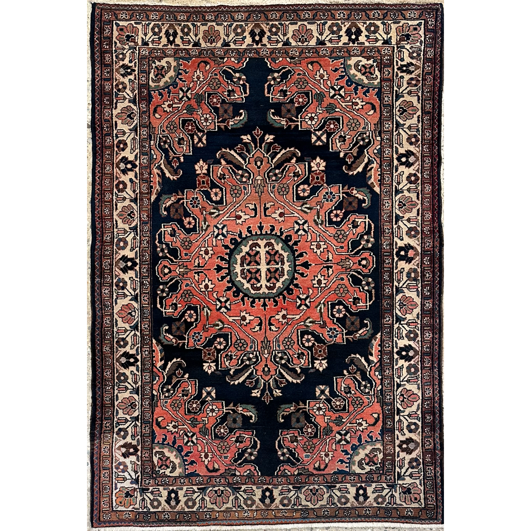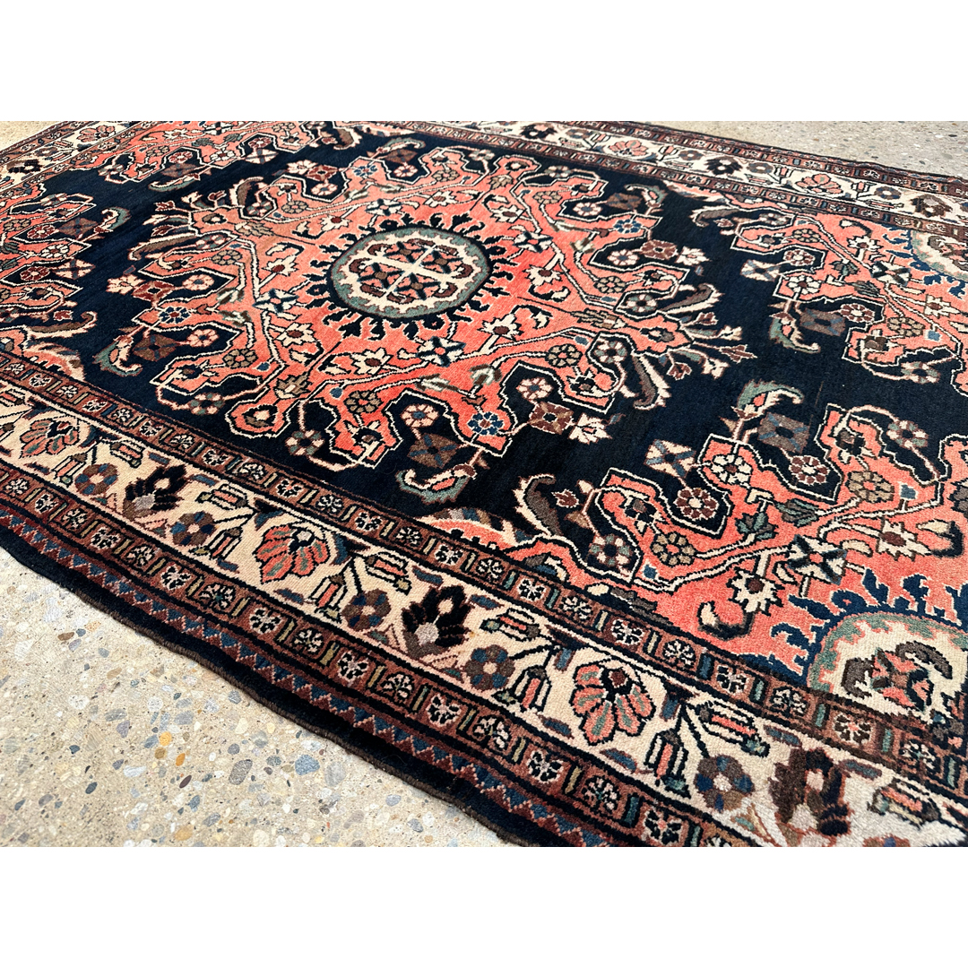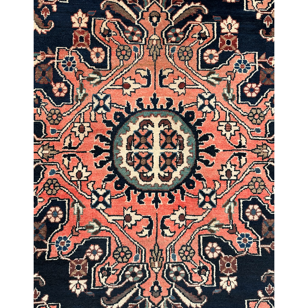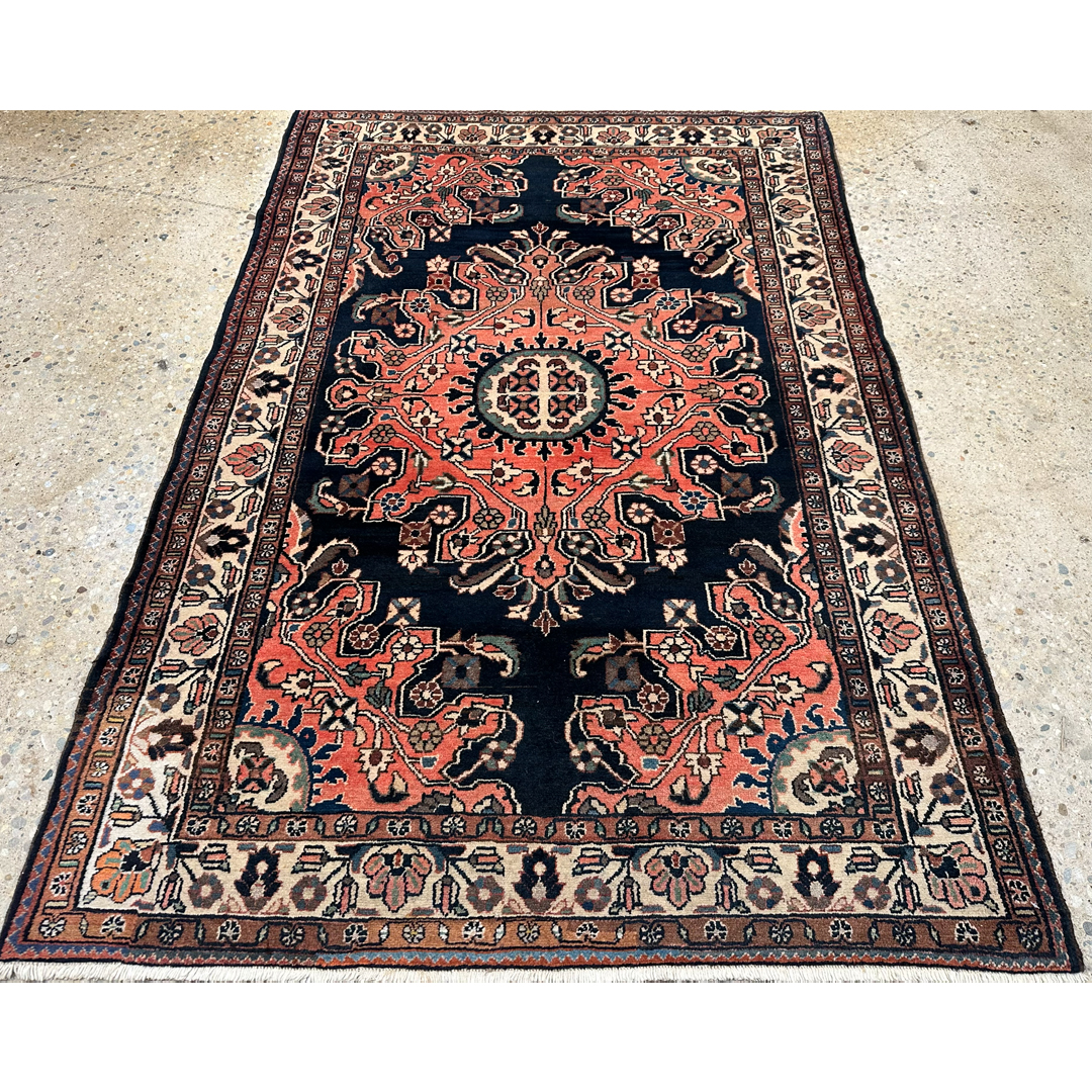 Add a touch of historic grandeur to your home with this terrific 4’7″ x 6’8″ ft. antique Persian Malayer rug, a genuine Tafresh piece from the 1910s. Expertly hand-knotted, this rug features a stunning high-contrast design centered around a radiant, large-scale medallion in warm rust and salmon tones. This central motif floats atop a deep midnight blue field, which is anchored by matching corner spandrels and filled with stylized floral vines. Framed by a detailed ivory border with delicate floral tracery, this durable antique rug offers a sophisticated and timeless foundation for a study, entryway, or living area.