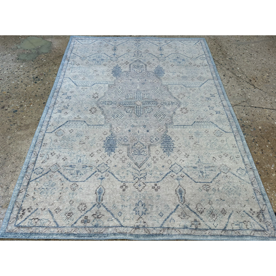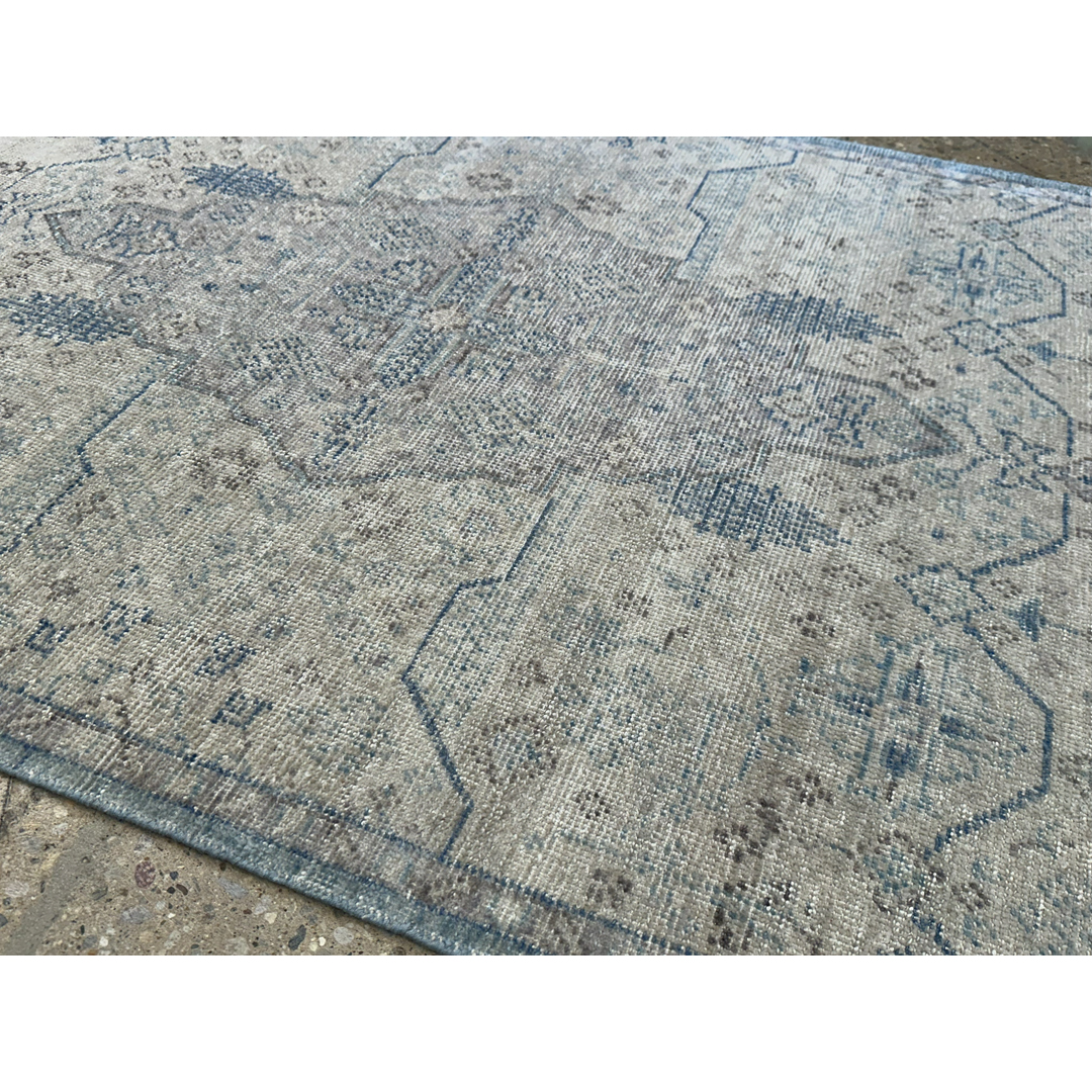 Create a sophisticated and serene foundation for your room with this terrific 4′ x 6′ ft. distressed vintage rug. Expertly hand-knotted and treated to achieve a modern aesthetic, this piece features a luminous, monochromatic palette of soft taupe, silvery-grey, and oyster white. The heavily distressed pile reveals ghost-like traces of a traditional geometric medallion and border pattern, offering a textured, abstract look that hints at its history without overwhelming the decor. This versatile, low-contrast rug is the perfect neutral anchor for a variety of interior styles, from modern farmhouse to industrial chic, adding understated elegance to a living room, bedroom, or private study.