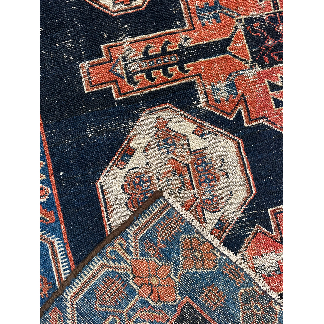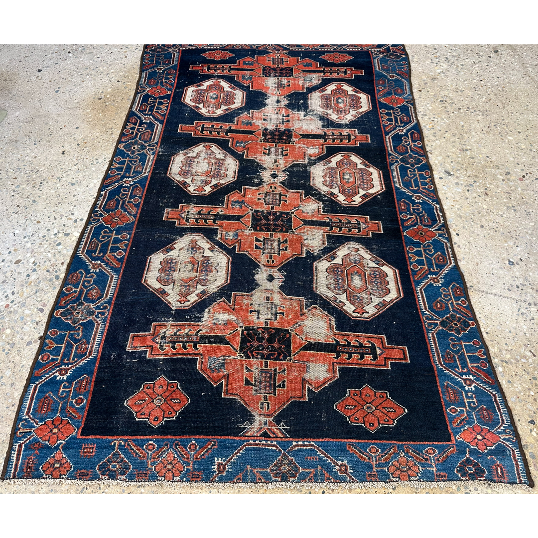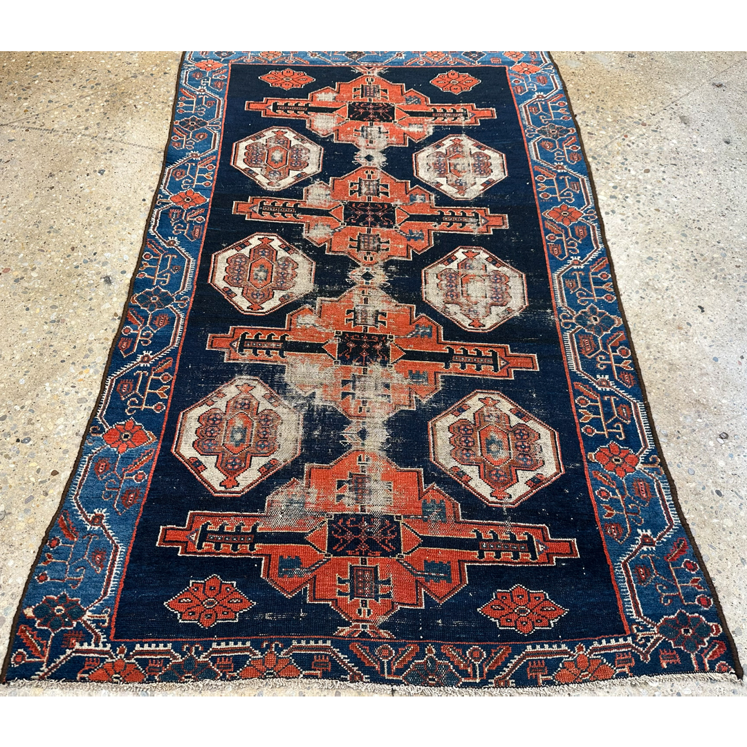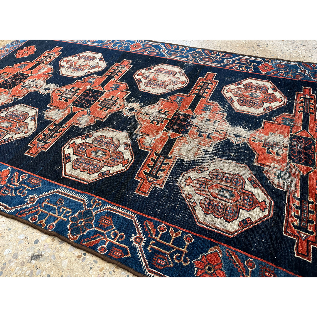 This antique Hamadan area rug utilizes a bold, geometric layout to provide a decorative yet grounded foundation for your space. The design features a prominent central pole of stepped medallions surrounded by stylized tribal motifs characteristic of classic Persian village weaving. A structured border frames the central field with repeating geometric elements. Hand-knotted with an even, low pile, this durable rug exhibits authentic vintage wear and fading. The color palette features a deep midnight blue background, powerfully accented by these traditional geometric motifs in rust-orange and soft ivory, all framed by a vibrant cobalt blue border. This piece provides a sophisticated, lived-in texture that integrates seamlessly with both natural wood furniture and neutral upholstery.
