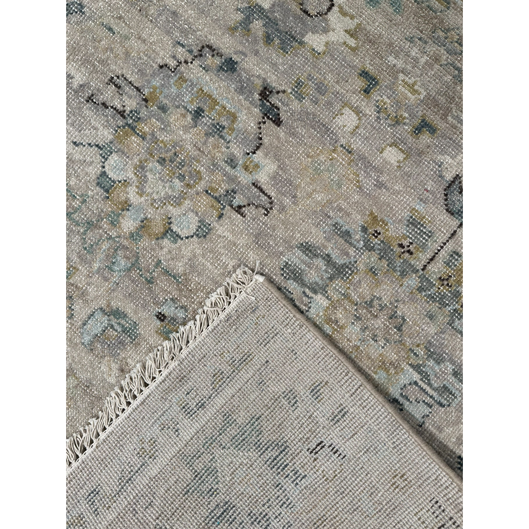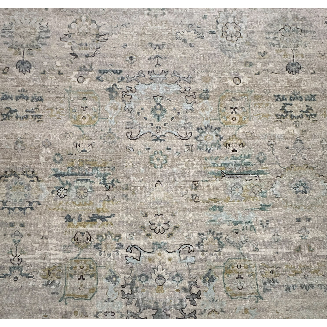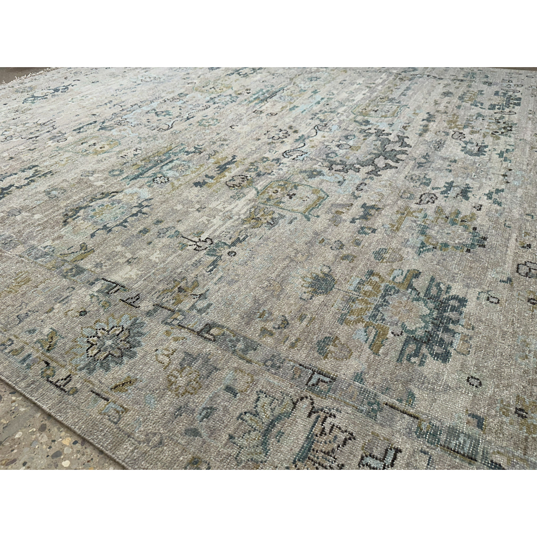 This large-scale area rug utilizes a transitional design across its 9’2″ by 11’11” footprint. The central field features a luminous greige and light silver background, accented by traditional botanical motifs in slate blue, muted teal, and touches of charcoal. An intricately detailed multi-band border frames the main field, cleanly containing the interior geometry. Though newly constructed, the rug has been purposefully sheared and finished to create a sophisticated zero-pile, distressed texture. This strategic design choice softens the classic pattern into a beautiful tone-on-tone neutral while ensuring the piece provides a smooth, flat surface that effortlessly accommodates heavy furniture and daily household foot traffic.