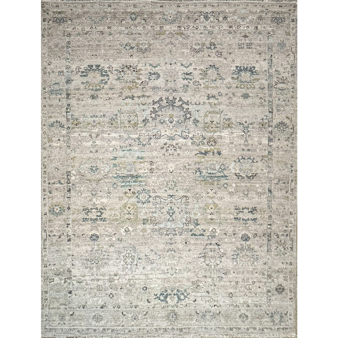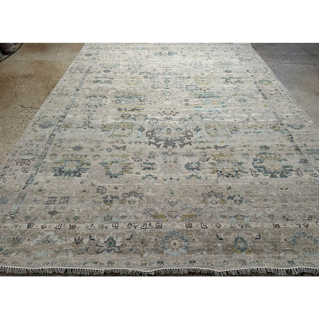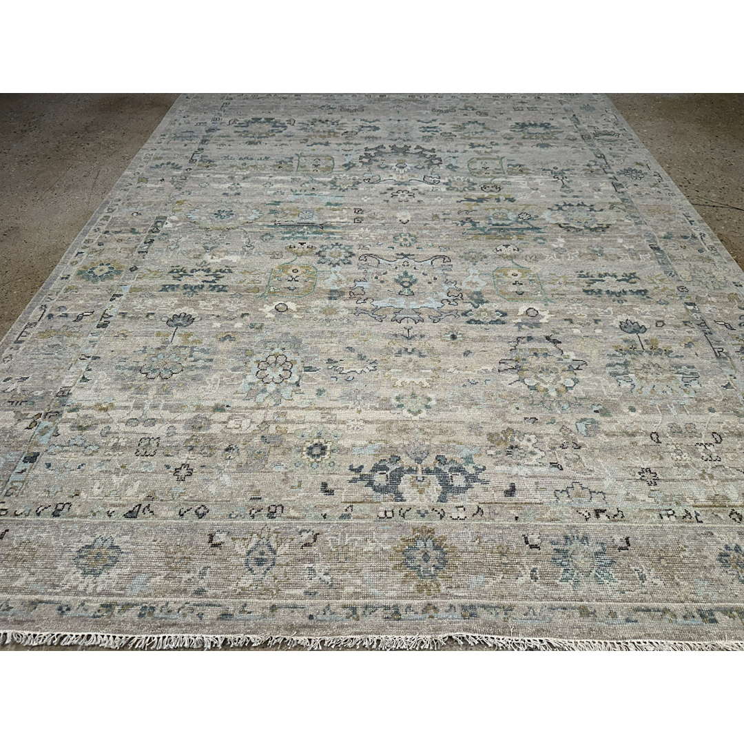 This large-scale area rug utilizes a transitional design across its 9’2″ by 11’11” footprint. The central field features a luminous greige and light silver background, accented by traditional botanical motifs in slate blue, muted teal, and touches of charcoal. An intricately detailed multi-band border frames the main field, cleanly containing the interior geometry. Though newly constructed, the rug has been purposefully sheared and finished to create a sophisticated zero-pile, distressed texture. This strategic design choice softens the classic pattern into a beautiful tone-on-tone neutral while ensuring the piece provides a smooth, flat surface that effortlessly accommodates heavy furniture and daily household foot traffic.