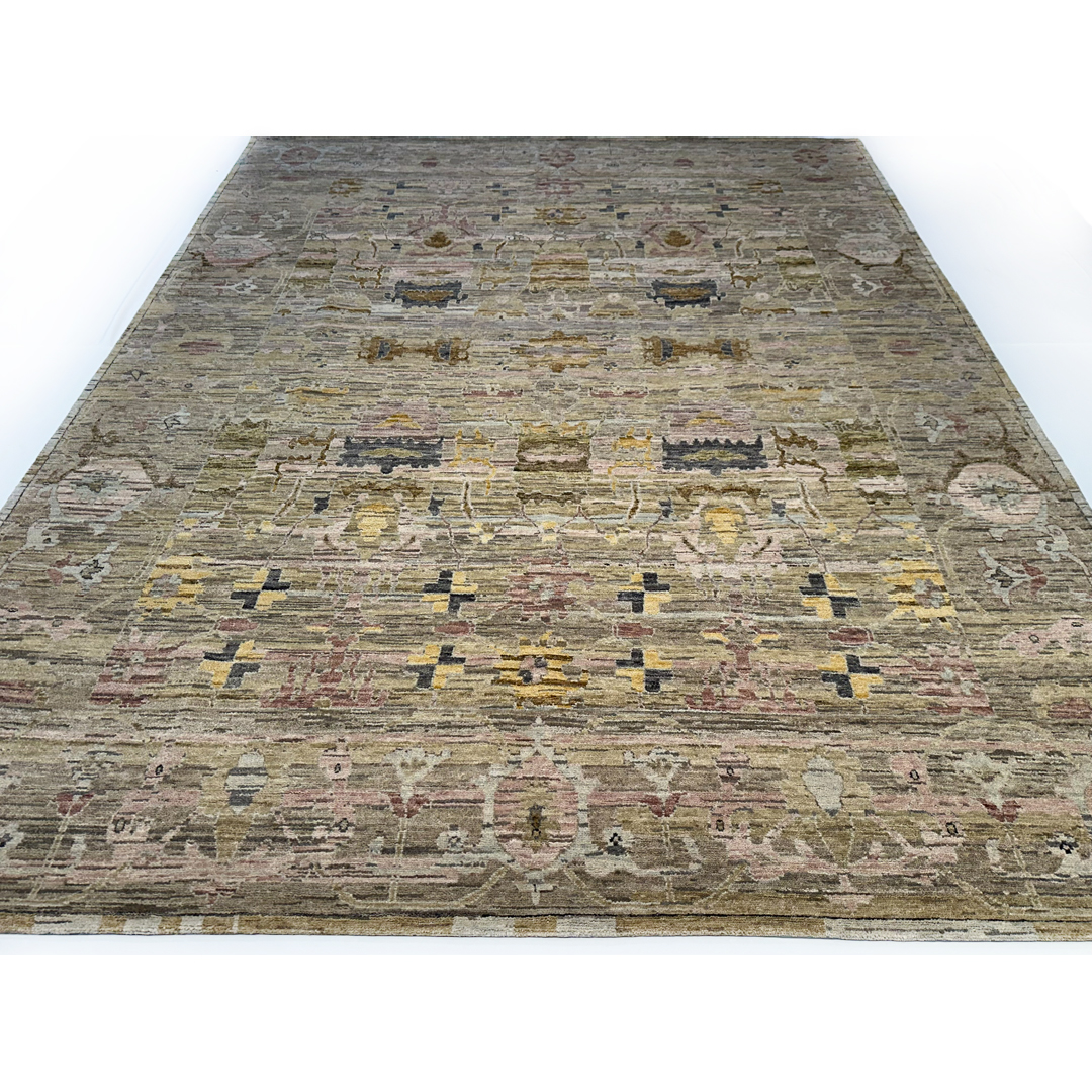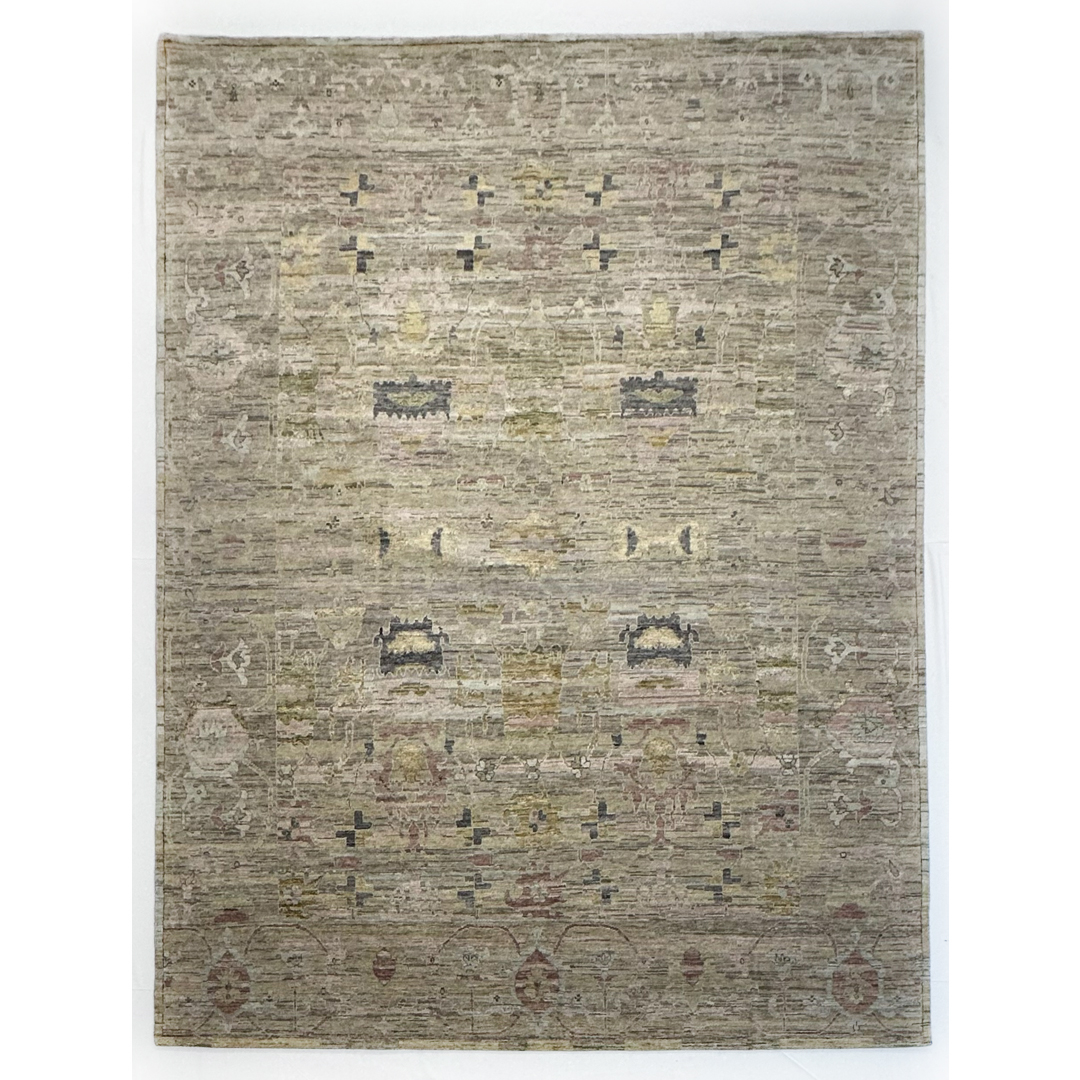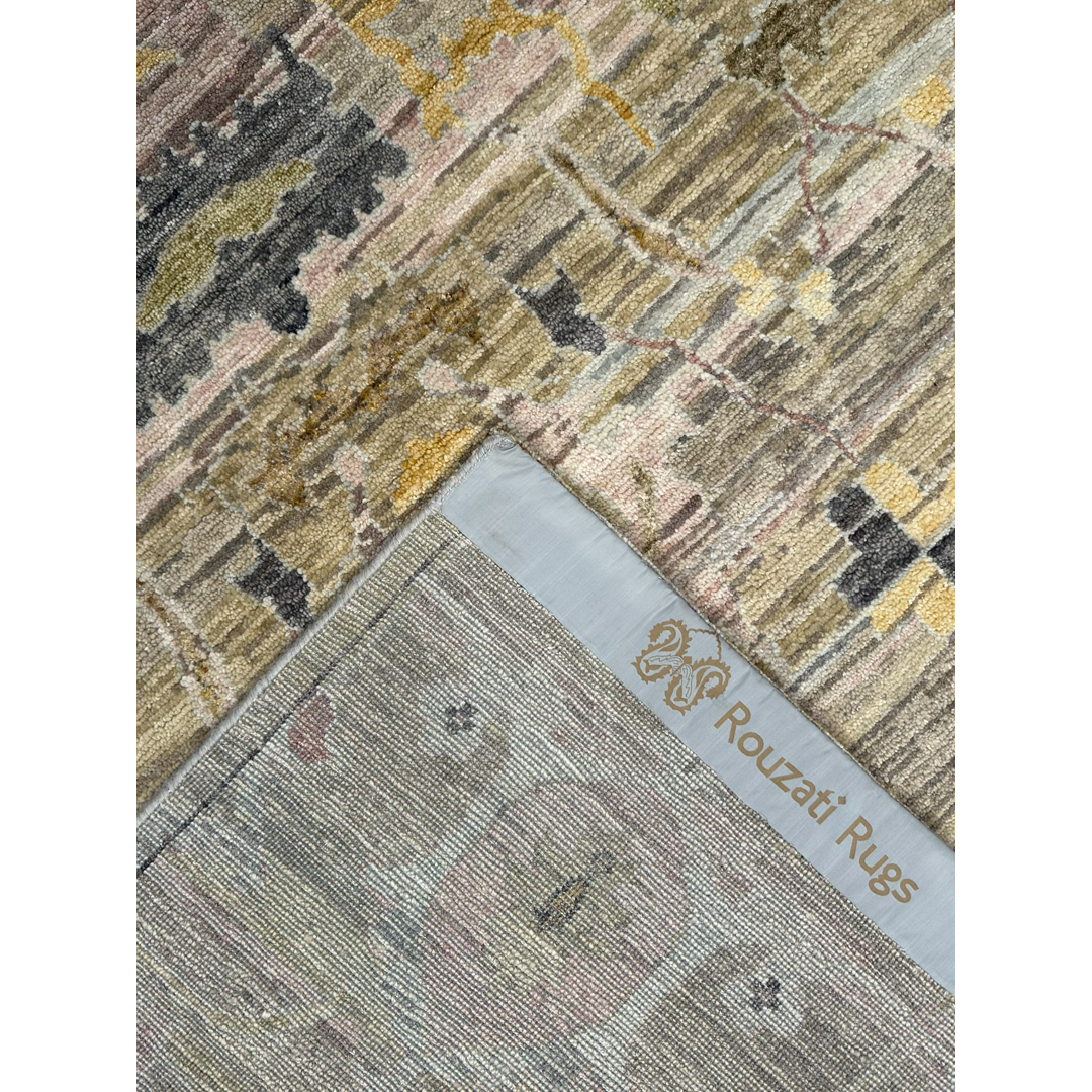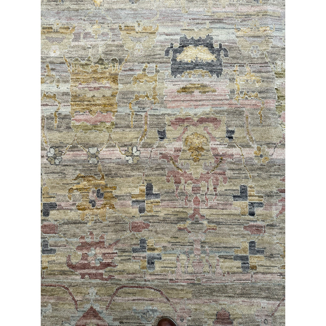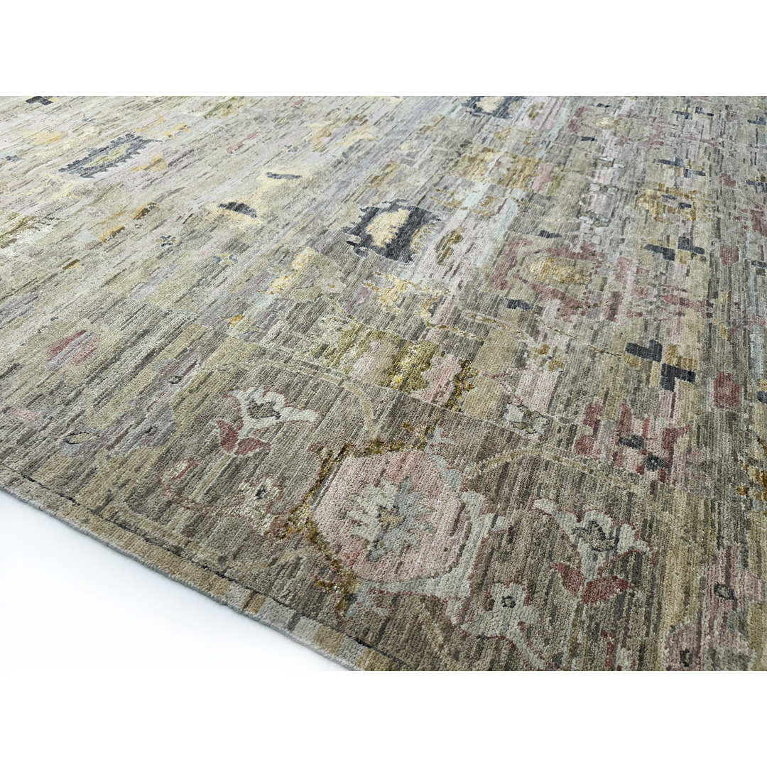 This beautiful hand-knotted Indian rug offers a sophisticated, contemporary approach to the highly coveted, classic Oushak aesthetic. The composition features a beautifully abstracted, modernized array of traditional botanical motifs and geometric palmettes that appear to float organically across the canvas. Woven in a serene, exceptionally muted palette, the heathered greige and soft taupe background is delicately illuminated by subtle, dreamy accents of muted blush, soft gold, sage green, and faded charcoal.