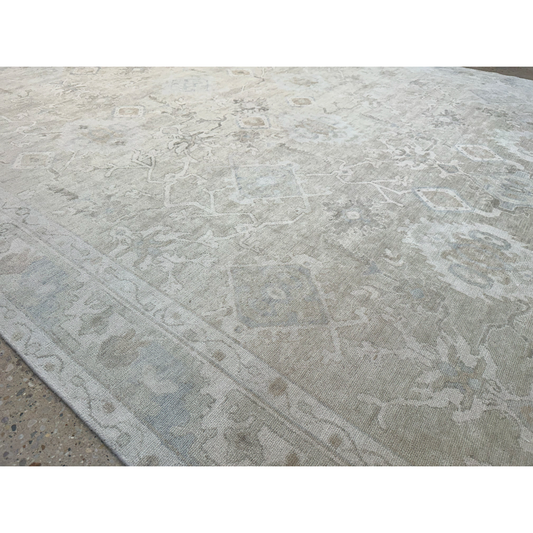 This hand-knotted Indian rug offers a masterful study in understated elegance, featuring a high-end transitional interpretation of the classic Turkish Oushak aesthetic. The design is characterized by an expansive, open-field arrangement of oversized geometric palmettes, stylized floral sprays, and small diamond medallions. Rendered in a sophisticated, monochromatic palette of ivory, cream, and soft sand, the motifs appear to float across the field with a ghostly, ethereal quality. Woven with premium, lustrous wool, the rug exhibits a delicate “abrash” and a low-sheared pile that creates a luminous, light-reflective surface. The composition is framed by a subtle, tonal primary border of repeating botanical florets, providing just enough structure to ground the airy design. Its grand 9′ x 12′ ft. scale and serene neutral palette make it a versatile foundation for a minimalist penthouse, a coastal-inspired estate, or a sophisticated master suite seeking a touch of tranquil luxury.