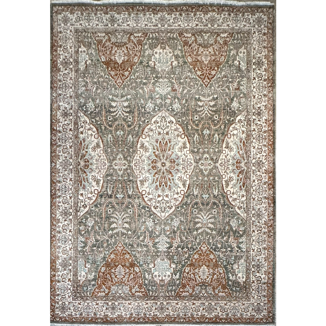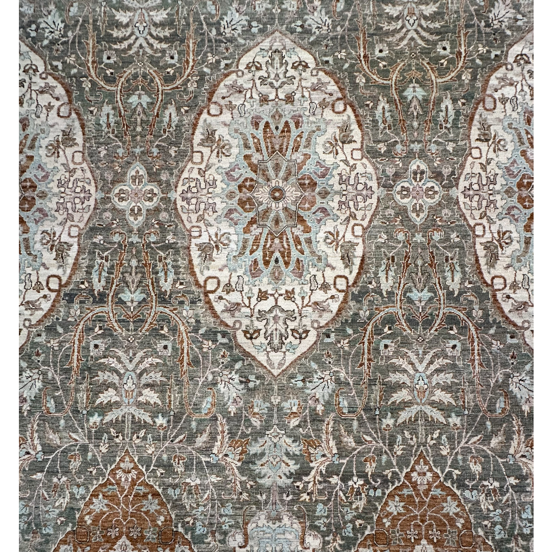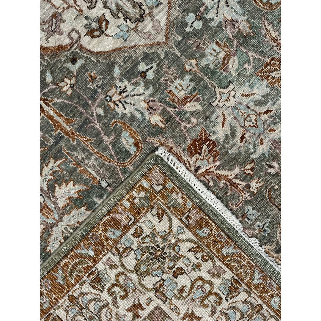 Anchor your formal living space with the refined elegance of this terrific 9’11” x 14’1″ ft. transitional Persian Tabriz design rug. The hand-knotted pile woven in Pakistan features a sophisticated heathered taupe and grey field that provides a neutral, grounding backdrop for the intricate classical artistry. A lobed central medallion rendered in warm rust and cream anchors the composition, perfectly coordinated with the ornate corner spandrels. The expansive field is densely packed with scrolling vines and Shah Abbas palmettes, while a wide ivory border filled with floral meanders frames the piece with timeless structure. This majestic rug offers a stately presence ideal for a grand library, dining hall, or executive suite.