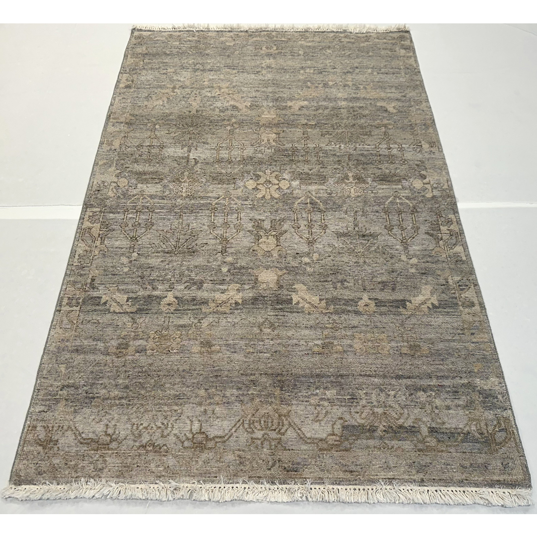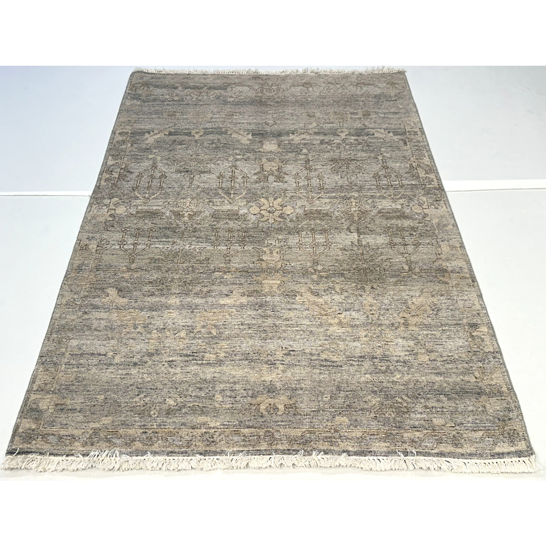 The rug is defined by a dramatic horizontal strie effect, where bands of varying color intensity mimic the natural weathering of a prized antique. This intentional fading beautifully blurs the lines between the central field and the border, resulting in a cohesive, minimalist canvas that feels incredibly contemporary while retaining its historic soul. With its versatile 4’1″ x 6’2″ ft. dimensions, this piece is a brilliant accent foundation, perfectly scaled to bring a quiet touch of luxury to any space.
