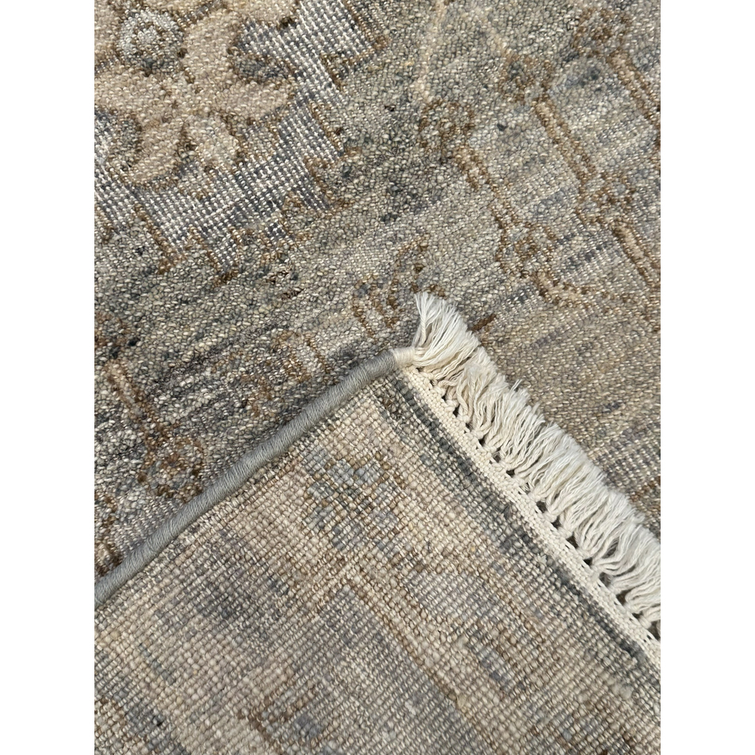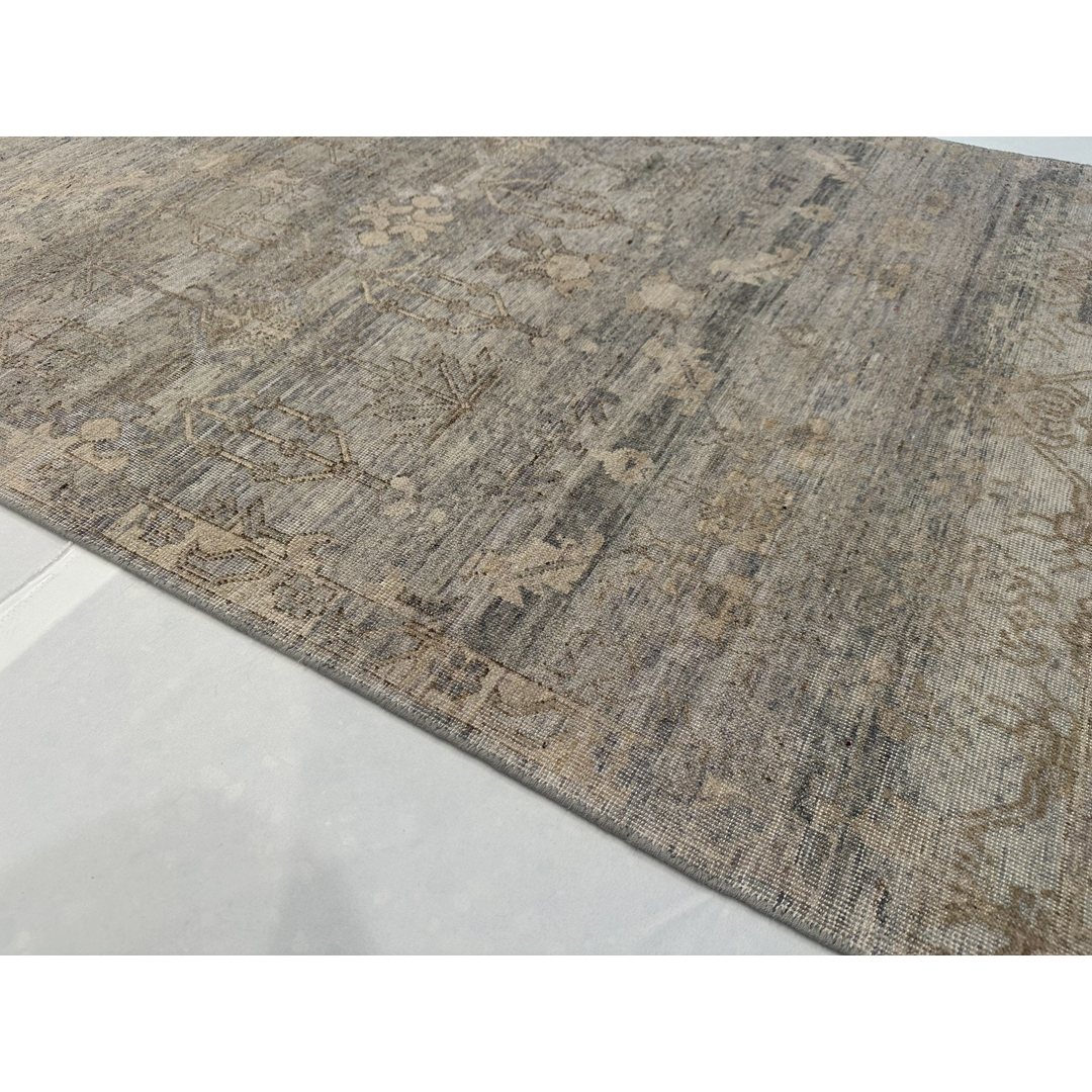 This captivating hand-knotted Indian rug perfectly captures the essence of modern transitional design, offering a distressed interpretation of a classic Persian Tabriz. The original, intricate floral motifs and scrolling vines have been masterfully woven with a high-low pile, leaving behind a beautifully textured imprint. Rendered in a highly sophisticated, cool-toned palette of slate blue, heathered grey, and soft taupe, the traditional pattern is softened into a deeply organic, abstract landscape.