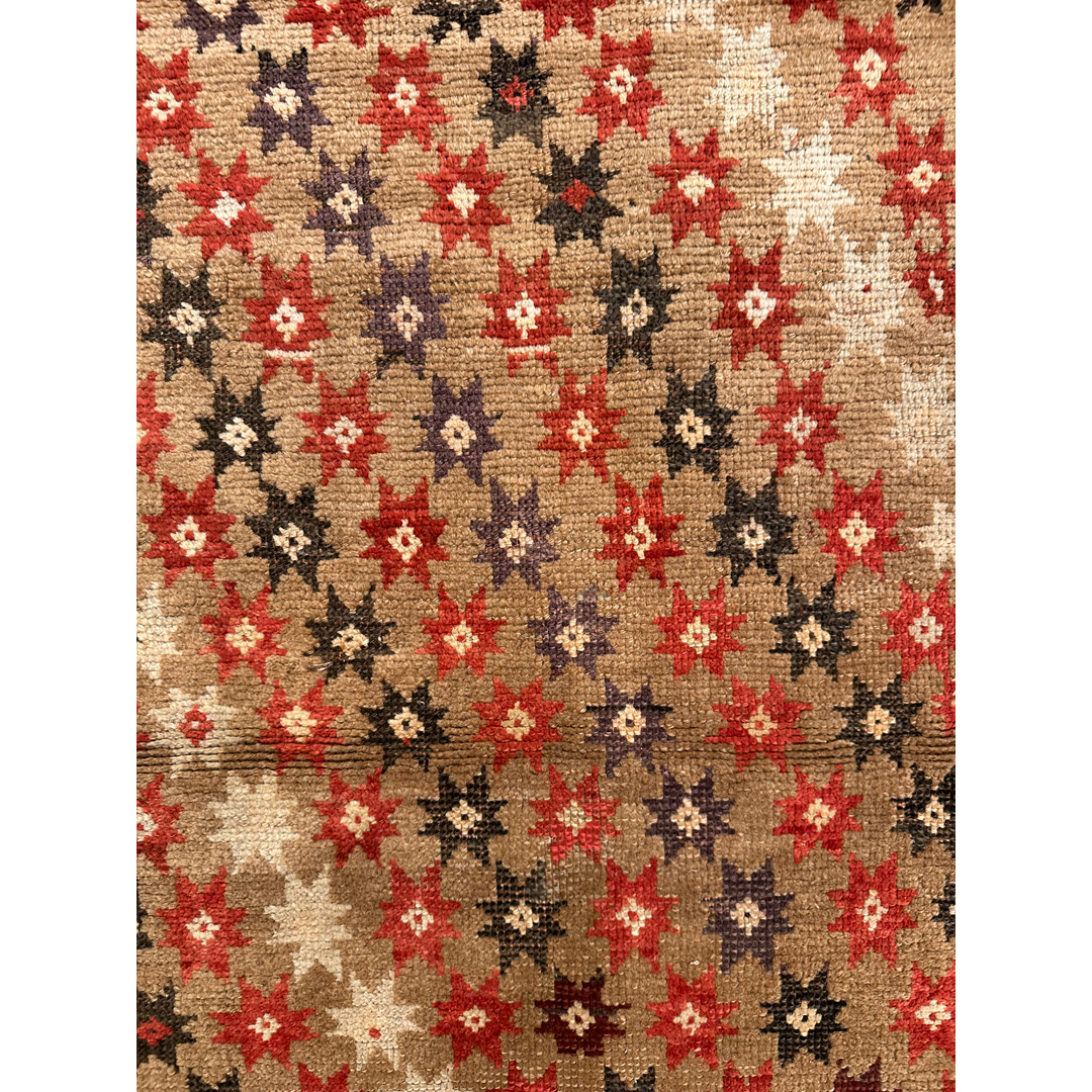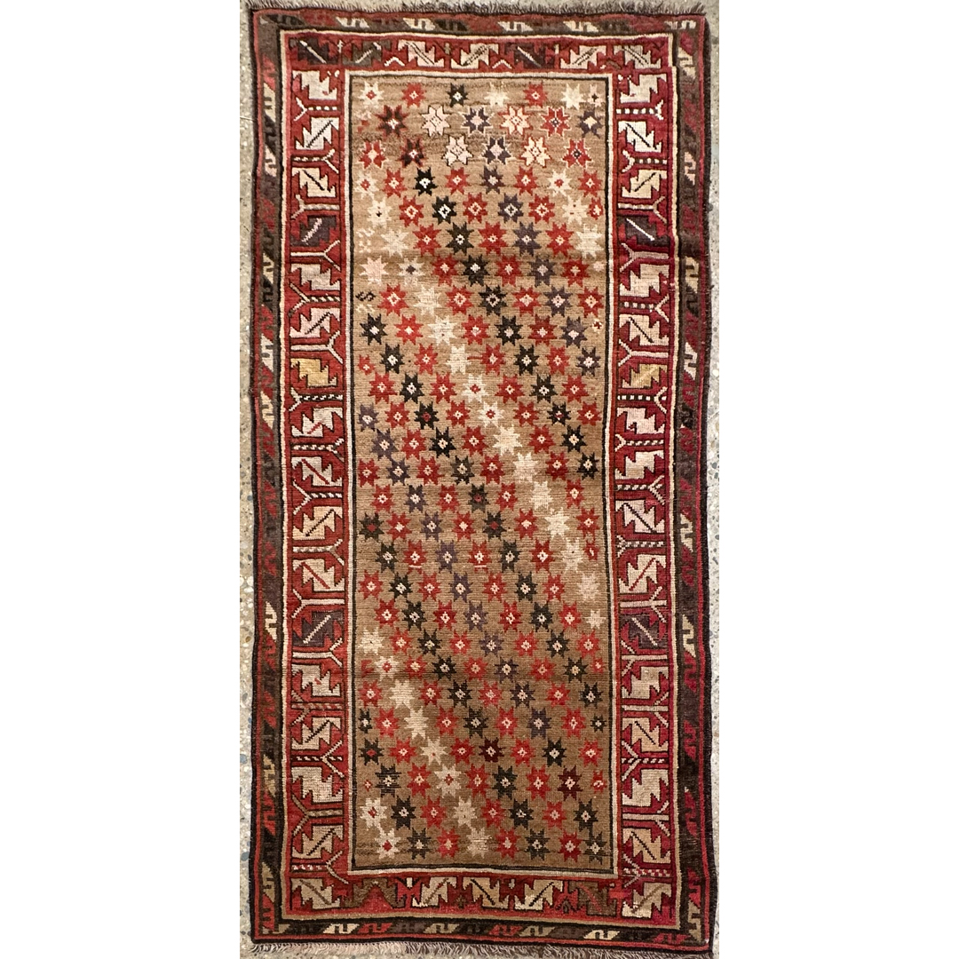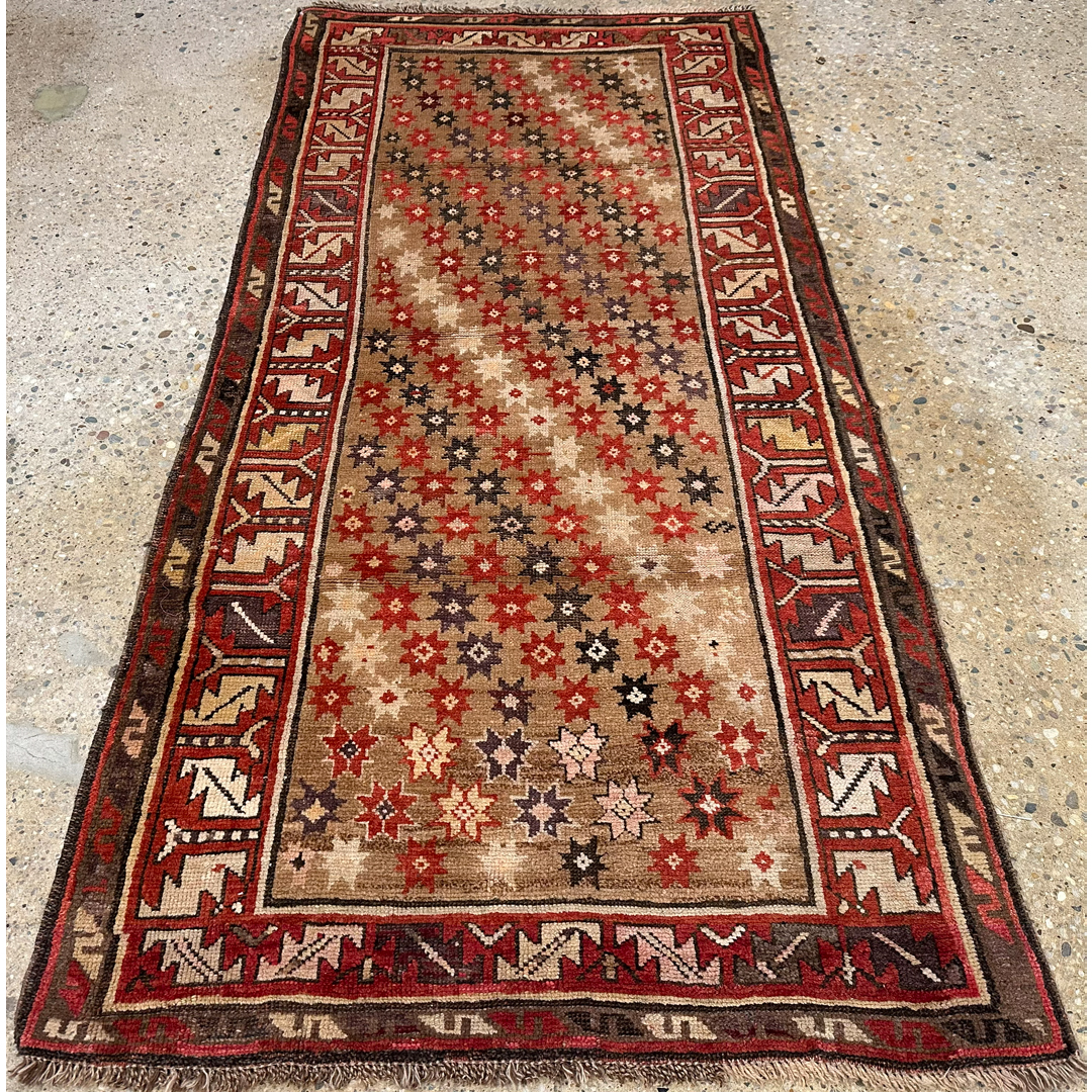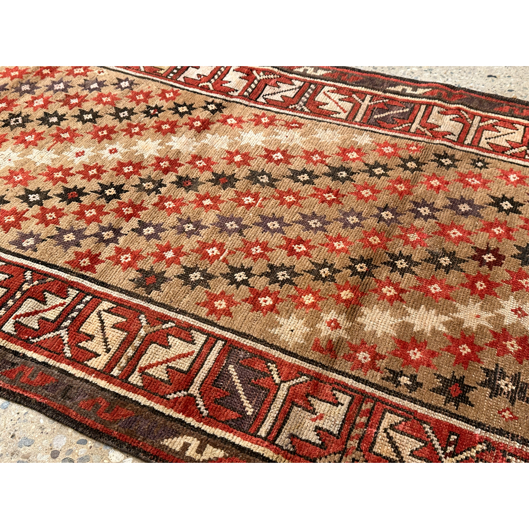 Bring a piece of history to your home with this terrific 3’6″ x 7’2″ ft. antique Caucasian runner. Hand-knotted in the 1880s, this rare collector’s piece features a natural camel hair field that provides a warm, earthy foundation for the vibrant tribal artistry. The design is characterized by diagonal rows of geometric star motifs and rosettes, rendered in contrasting shades of rust red, espresso brown, and ivory, creating a dynamic sense of movement along the runner’s length. A striking geometric border filled with a reciprocal latch-hook pattern on a red ground frames the composition, adding a bold and structured finish. This durable and authentic weaving is perfectly suited for adding rustic charm to a hallway, entryway, or galley kitchen.