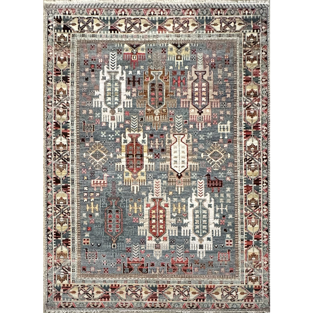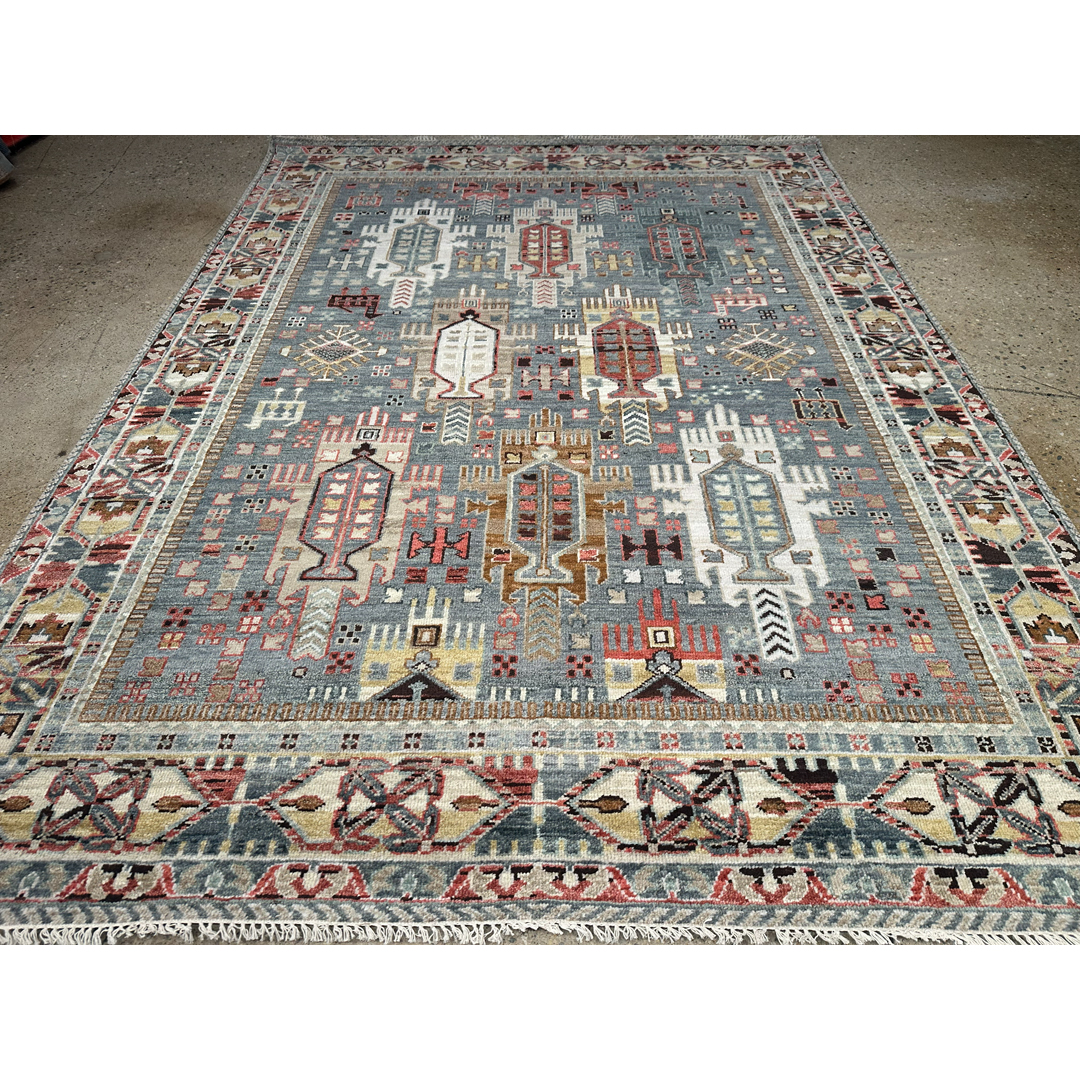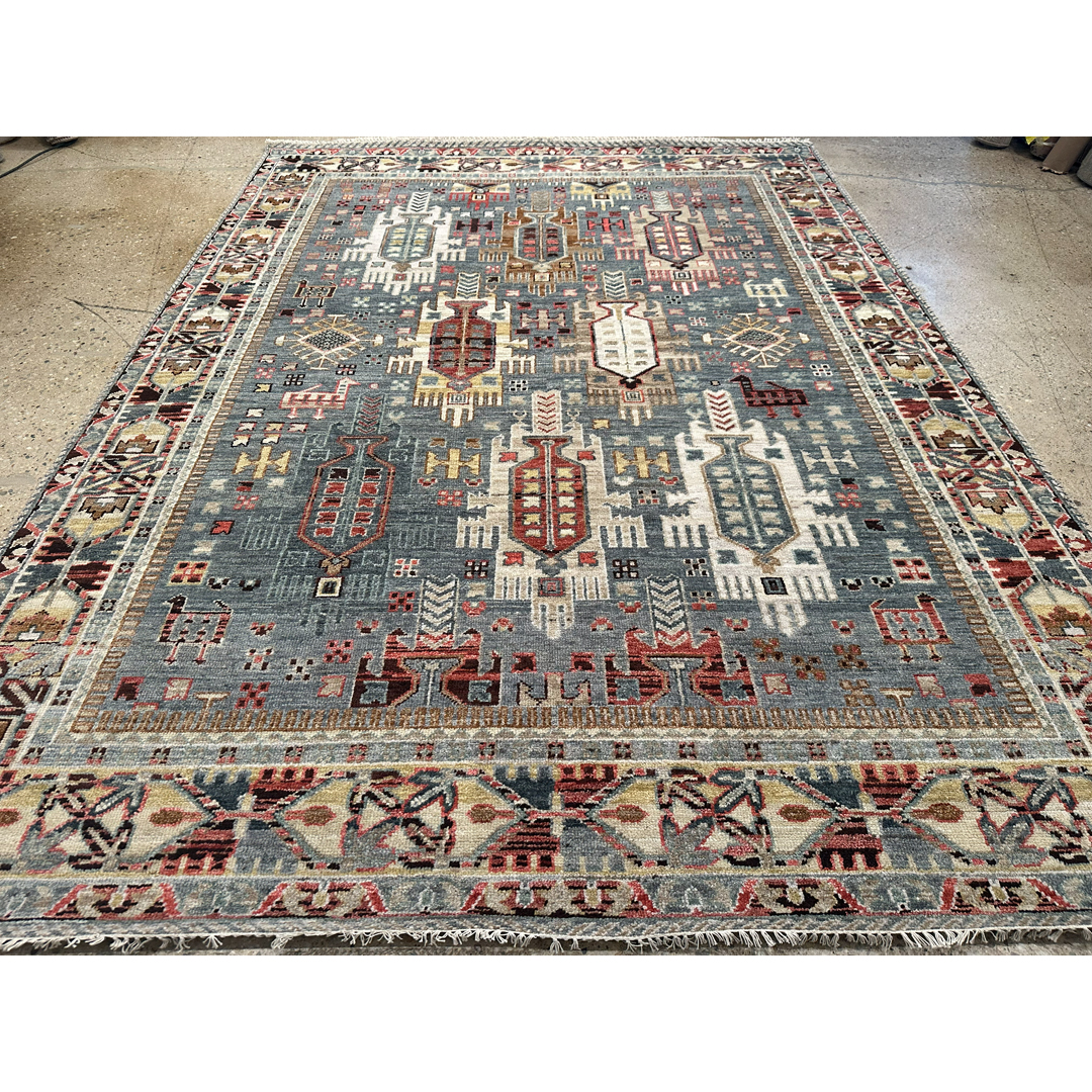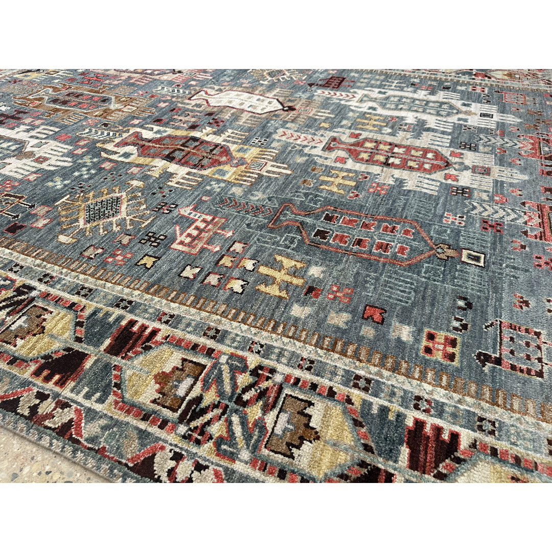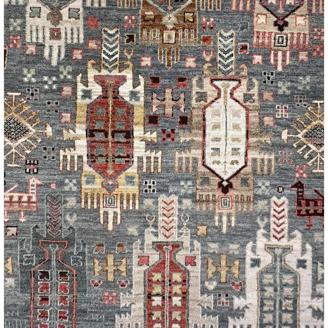 A perfect marriage of rustic design and refined color, this 9×12 carpet reimagines traditional tribal aesthetics for the sophisticated Evanston interior. The rug features a cool, steel-grey field that instantly modernizes the look, moving away from the heavy reds often found in tribal weavings.