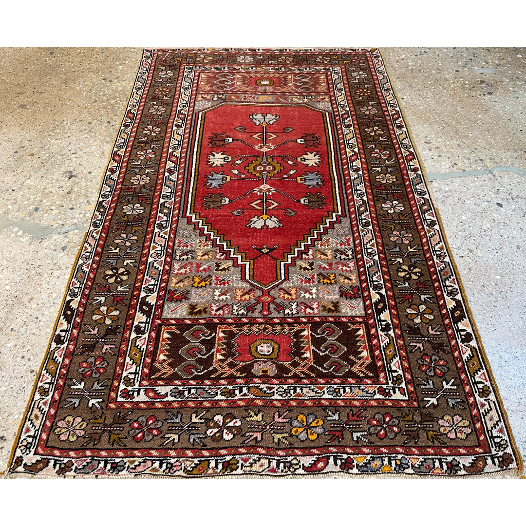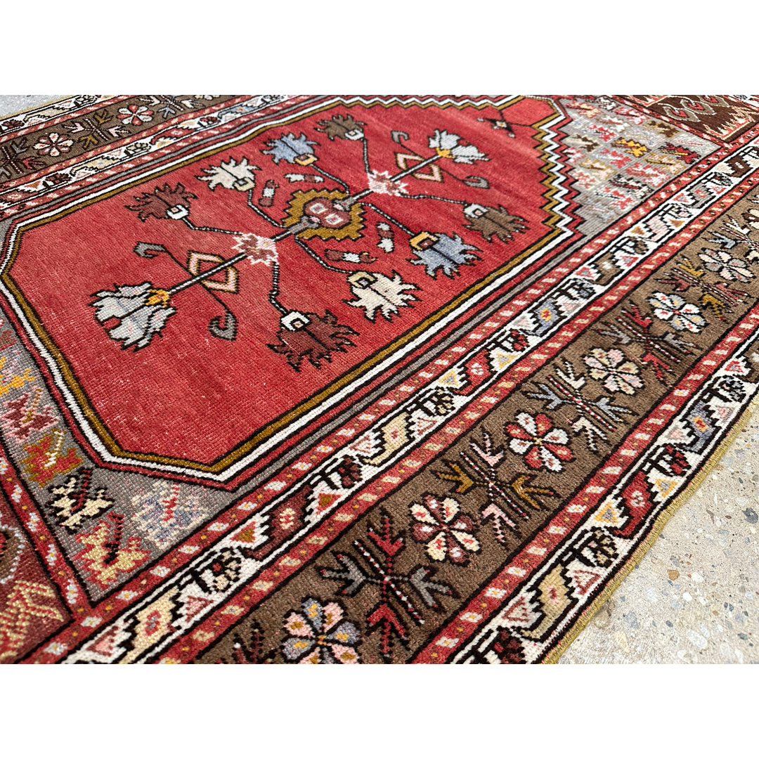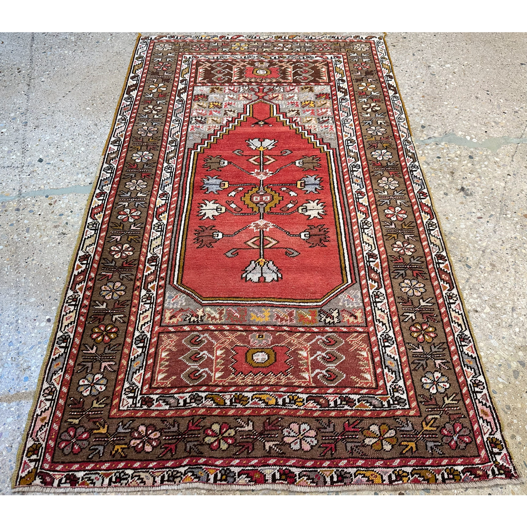 Create a focal point of warmth and tradition with this terrific 3’3″ x 5’6″ ft. antique Turkish Oushak rug. A genuine hand-knotted piece from the 1940s, this rug features a classic prayer or Mihrab design, centered around a vibrant rust-red arch that symbolizes a gateway to the divine. Inside the arch, a stylized Tree of Life motif blooms with geometric flowers in shades of ivory, slate blue, and taupe. Framed by a rich chocolate brown border adorned with repeating floral rosettes, this durable and culturally significant rug is perfect for adding color and historic character to a foyer, reading nook, or as a distinctive wall hanging.