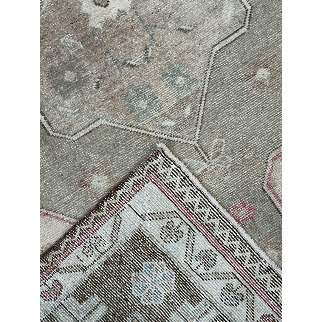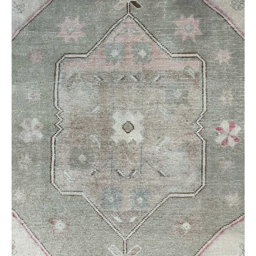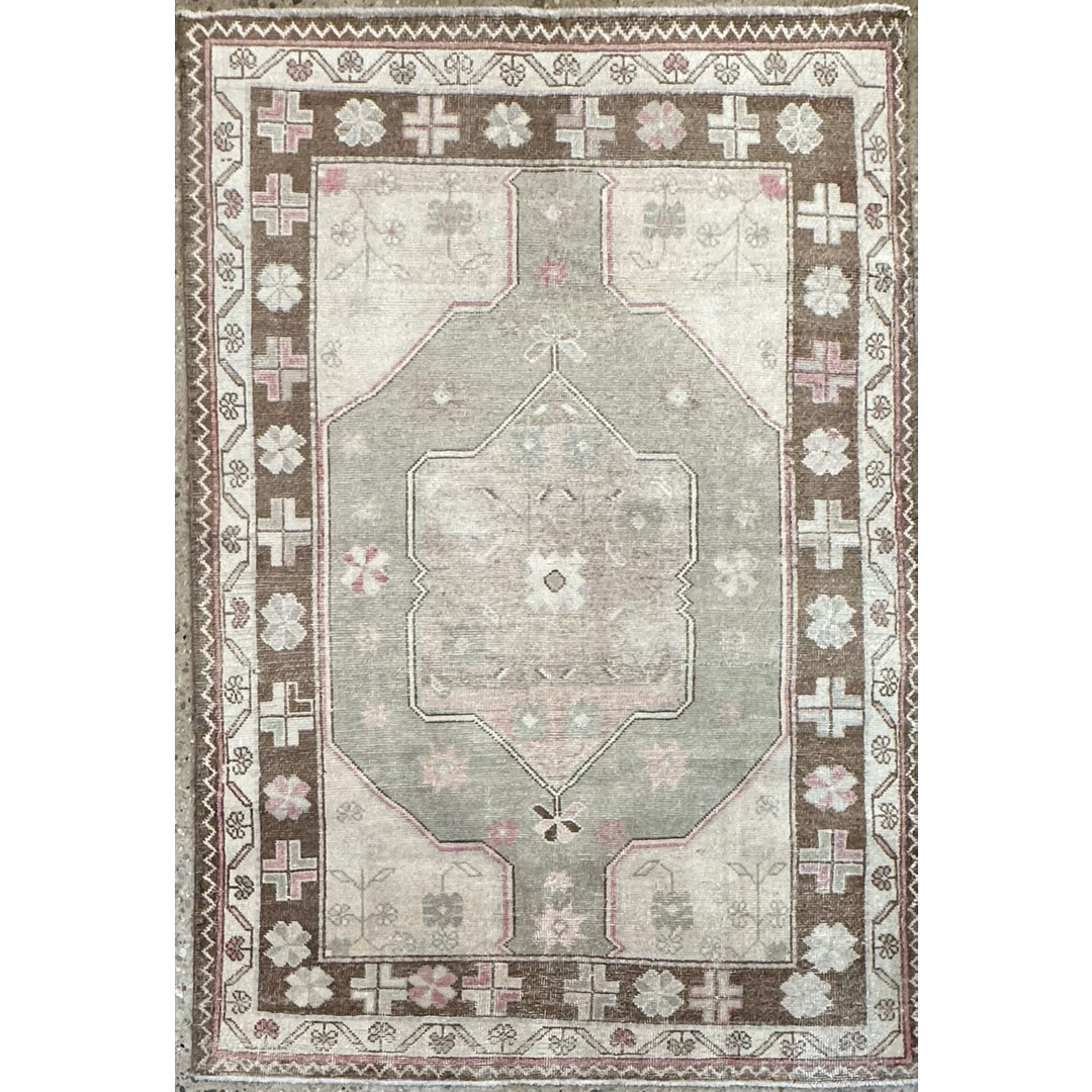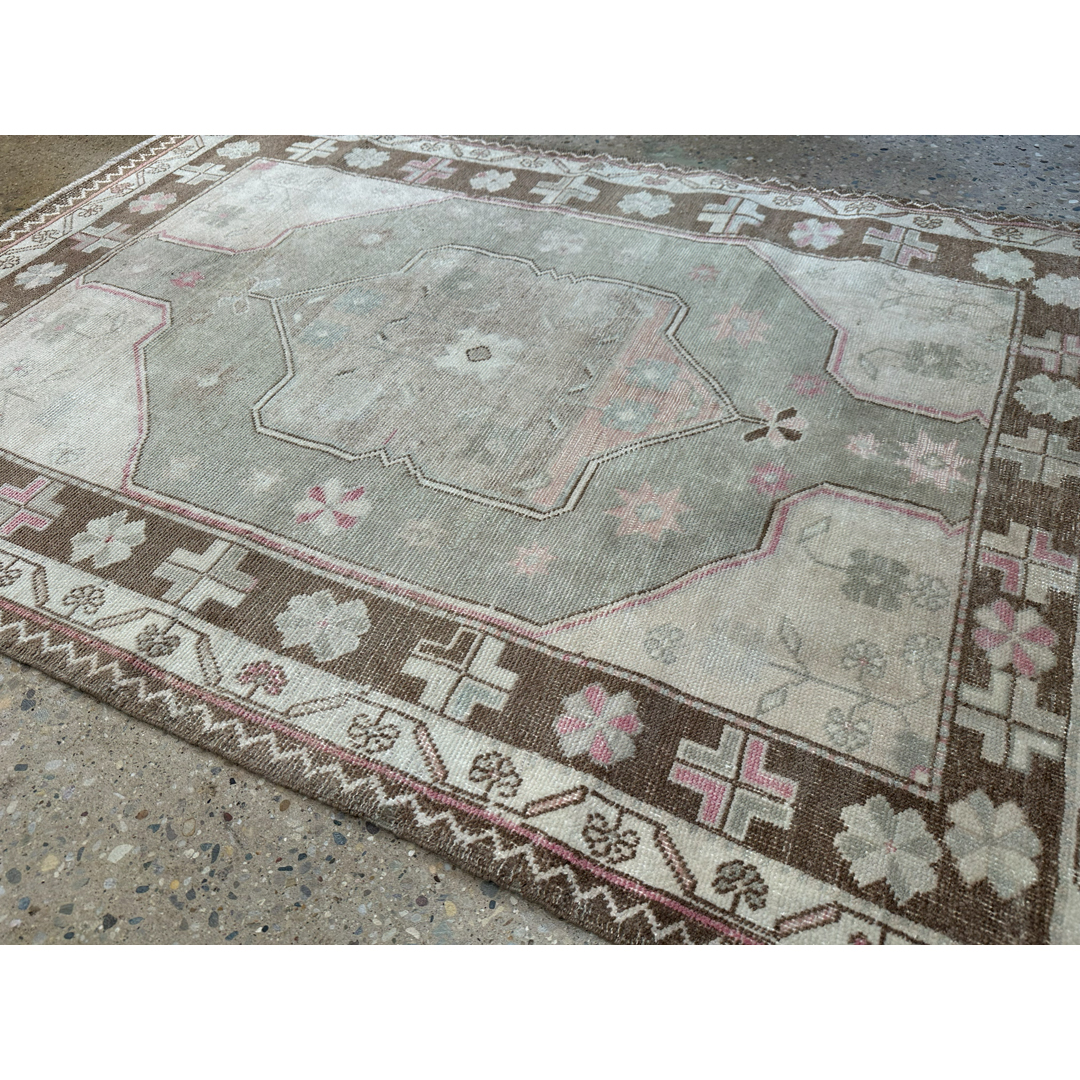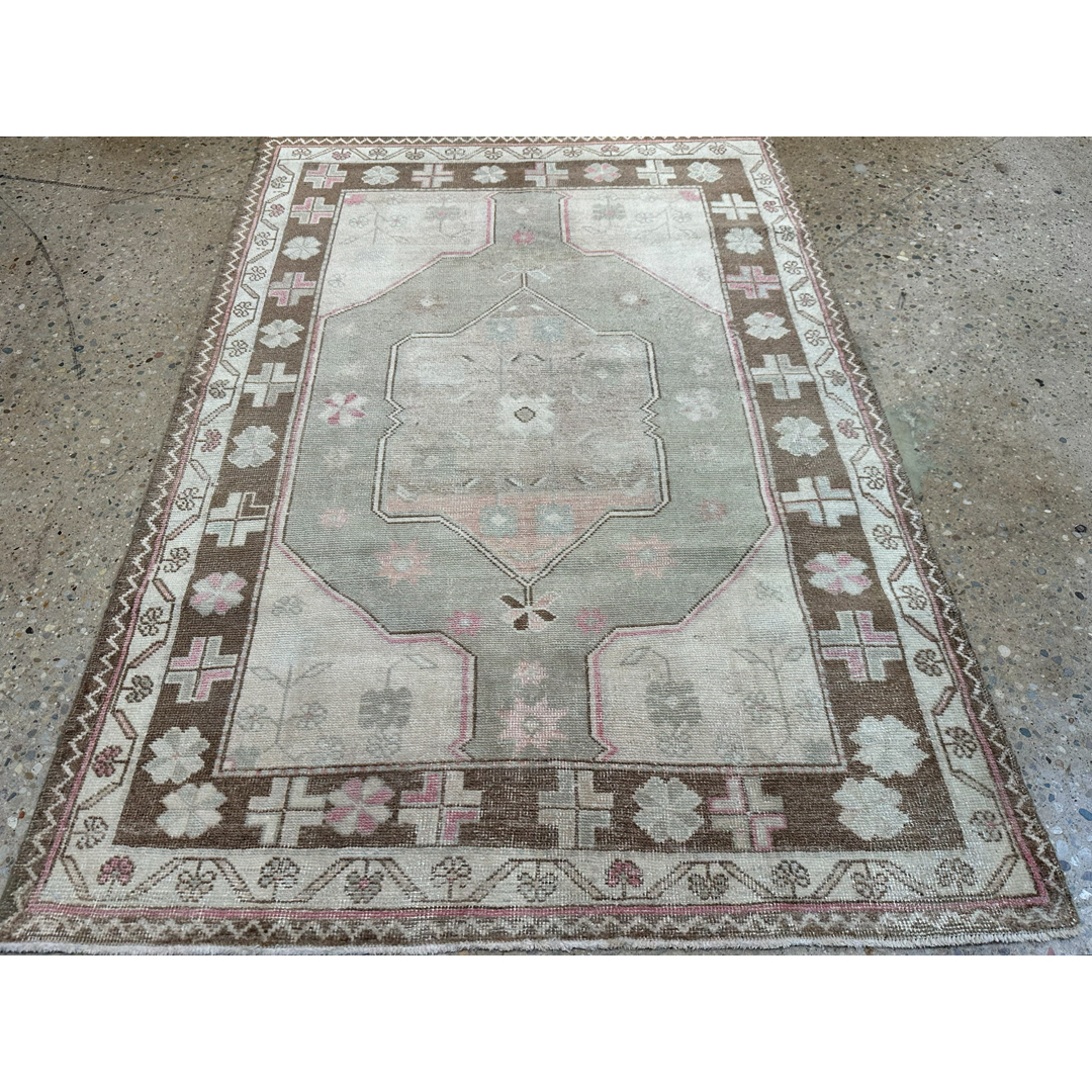 This hand-knotted vintage Oushak rug features a classic Anatolian geometric composition with a large, double-ended central medallion. The medallion is set within a stepped hexagonal field, decorated with stylized floral sprays and geometric motifs in a soft, sun-faded palette of sage green, dusty rose, and taupe. The design is grounded by a wide, earthy-brown primary border featuring alternating floral rosettes and crosses, framed by delicate ivory guard borders.Characteristic of the Oushak tradition, the wool is soft and the pile is sheared low, creating a tactile, lived-in feel that highlights the rug’s antique heritage. Its charming, muted tones and compact dimensions make it a perfect choice for an entryway, a cozy reading nook, or as a sophisticated accent in a bedroom.