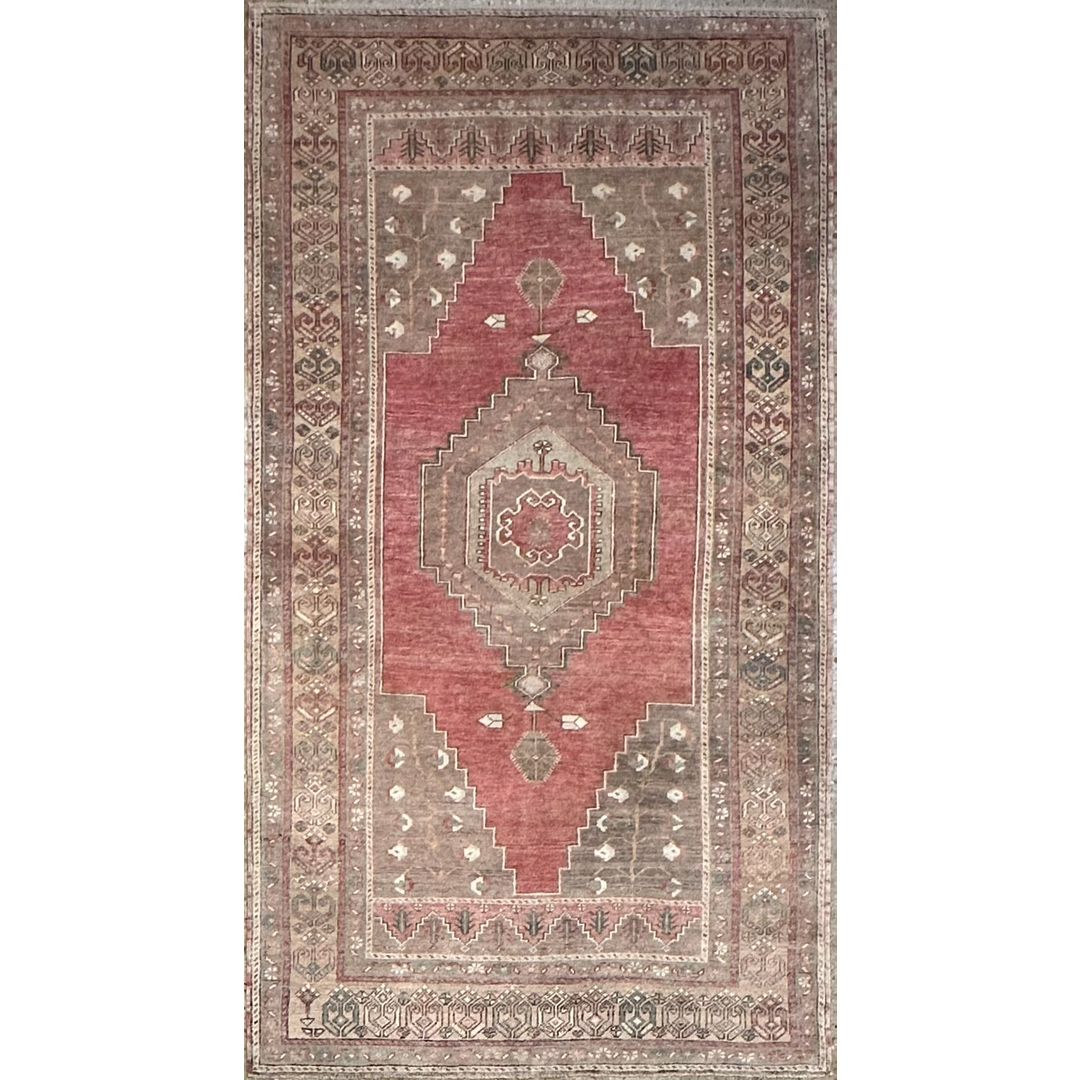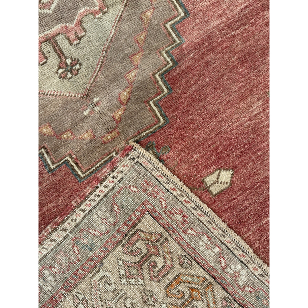 This vintage Anatolian Oushak area rug provides a highly structured, historic foundation for residential projects. The classic tribal layout features a prominent, large-scale stepped central medallion surrounded by sparsely scattered, stylized geometric and botanical motifs. This striking traditional geometry is beautifully softened by a naturally faded, earthy color palette, featuring a muted vintage rose and warm terracotta central field. This vibrant center is sharply contrasted by surrounding spandrels and borders executed in sophisticated shades of soft taupe, khaki, beige, and faint olive. A wide, intricately detailed multi-band border frames the main field, containing the bold interior geometry with repeating tribal patterns. Exhibiting an authentic, even low pile and a natural time-worn patina typical of older Turkish textiles, the rug provides a robust, highly practical surface that effortlessly accommodates regular household foot traffic. By combining a commanding, structured tribal pattern with a gracefully faded color story, this piece achieves a highly adaptable, timeless aesthetic.