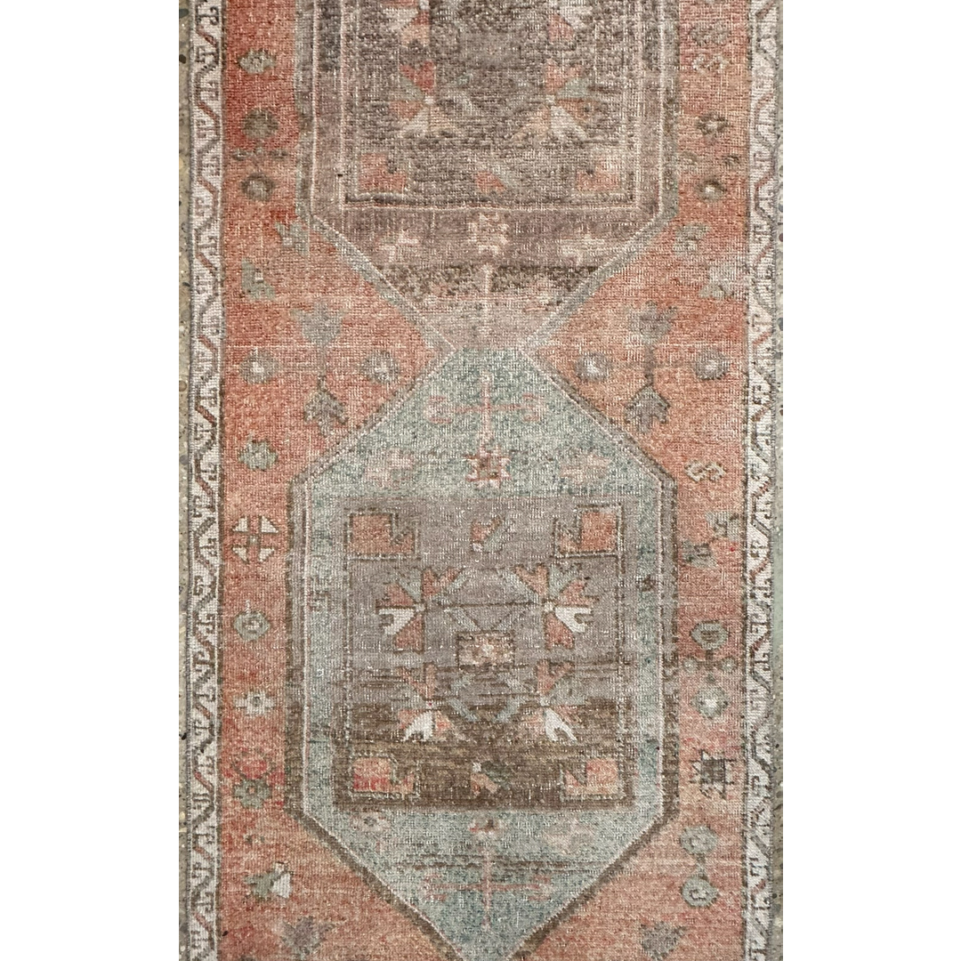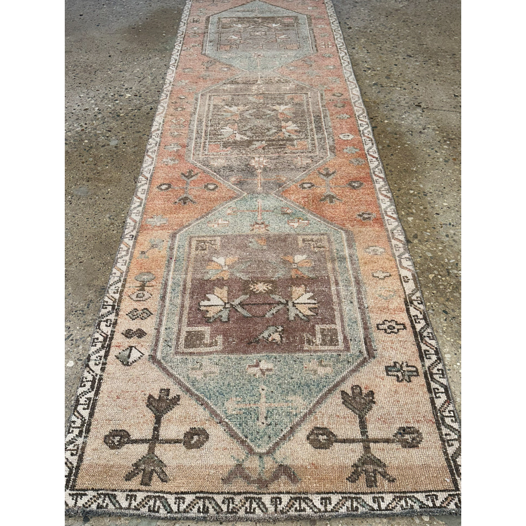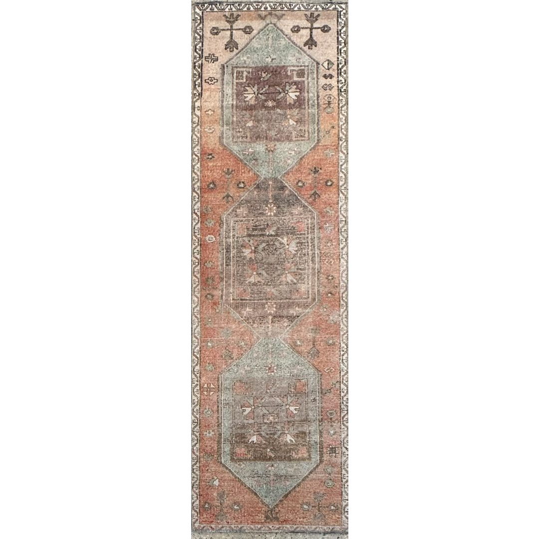 This authentic vintage Oushak runner features a classic “triple medallion” composition, a hallmark of traditional Anatolian tribal weaving. The design is anchored by three vertically aligned, geometric diamond medallions in alternating shades of seafoam green and weathered taupe, each containing intricate tribal florets. Set against a warm, sun-faded terracotta and apricot field, the motifs possess a beautiful soft quality that results from decades of natural aging. Hand-knotted with high-quality wool, the piece displays an exquisite, painterly color variation throughout the field and medallions, lending a sense of history and organic movement to the design. The runner is framed by a narrow, delicate border featuring a repeating geometric pattern in charcoal and ivory. With its slender dimensions and soulful, antique patina, this rug is an ideal choice for a sophisticated hallway, a gallery space, or a transitional entryway seeking a touch of historical character.