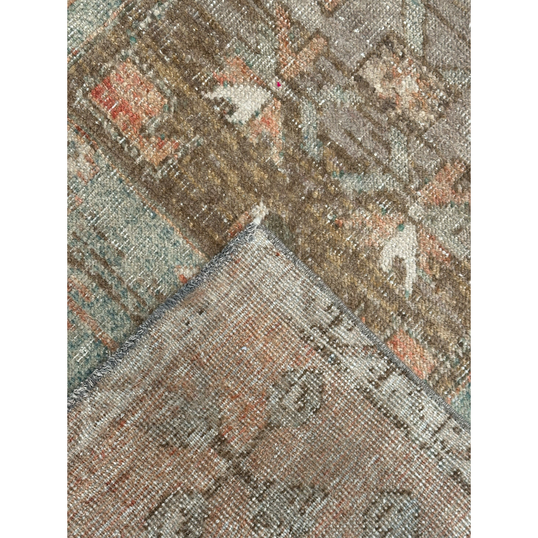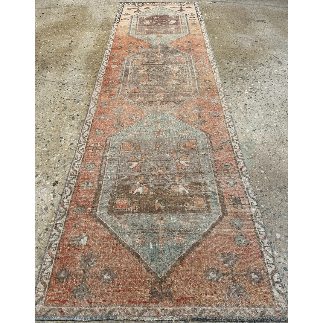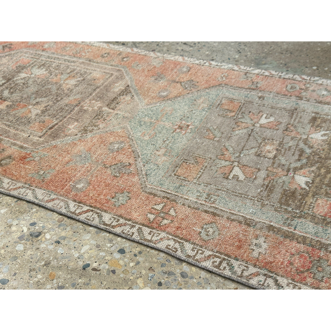 This authentic vintage Oushak runner features a classic “triple medallion” composition, a hallmark of traditional Anatolian tribal weaving. The design is anchored by three vertically aligned, geometric diamond medallions in alternating shades of seafoam green and weathered taupe, each containing intricate tribal florets. Set against a warm, sun-faded terracotta and apricot field, the motifs possess a beautiful soft quality that results from decades of natural aging. Hand-knotted with high-quality wool, the piece displays an exquisite, painterly color variation throughout the field and medallions, lending a sense of history and organic movement to the design. The runner is framed by a narrow, delicate border featuring a repeating geometric pattern in charcoal and ivory. With its slender dimensions and soulful, antique patina, this rug is an ideal choice for a sophisticated hallway, a gallery space, or a transitional entryway seeking a touch of historical character.