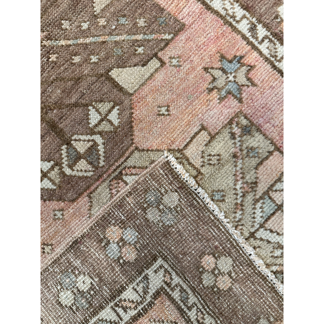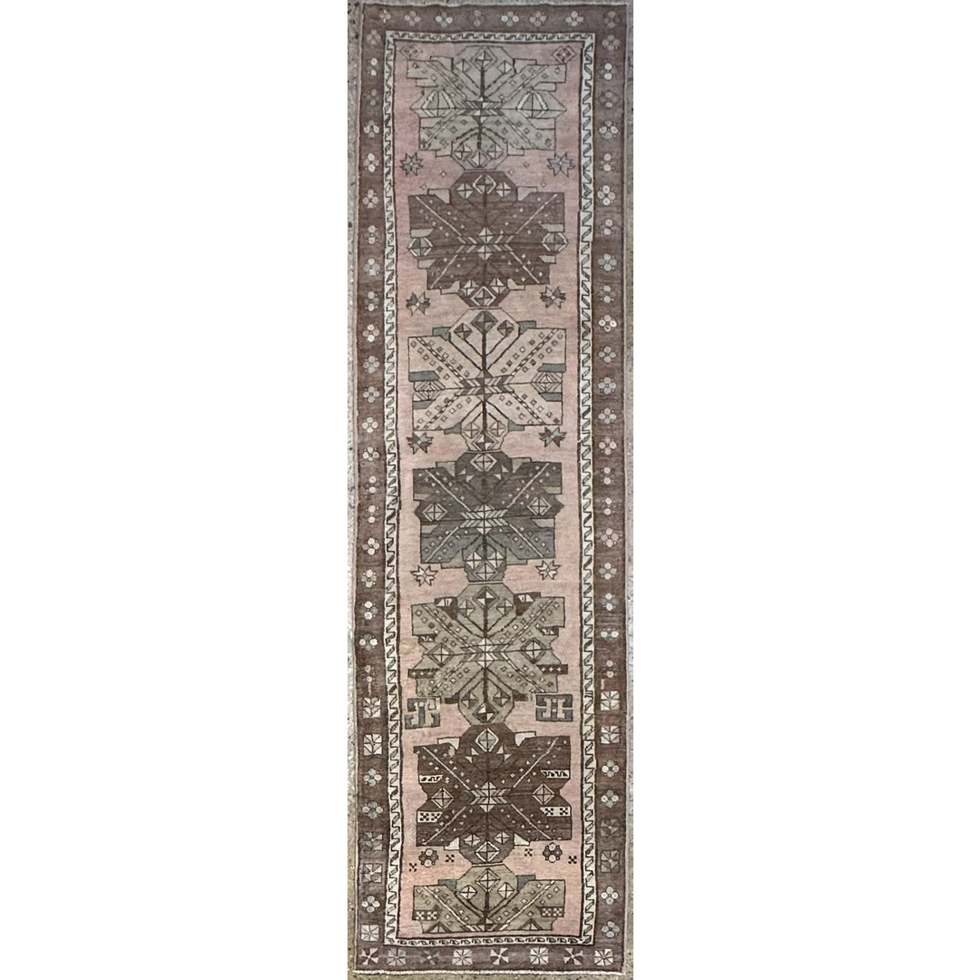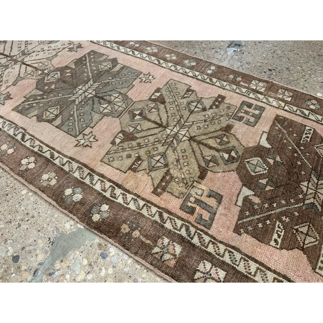 This hand-knotted vintage runner from the Oushak region features a rhythmic series of bold, geometric medallions stretching along a soft, salmon-pink field. The medallions are rendered in sophisticated tones of chocolate brown, sage green, and taupe, each detailed with stylized tribal motifs that exhibit the charm and spontaneous artistry of Anatolian weaving.