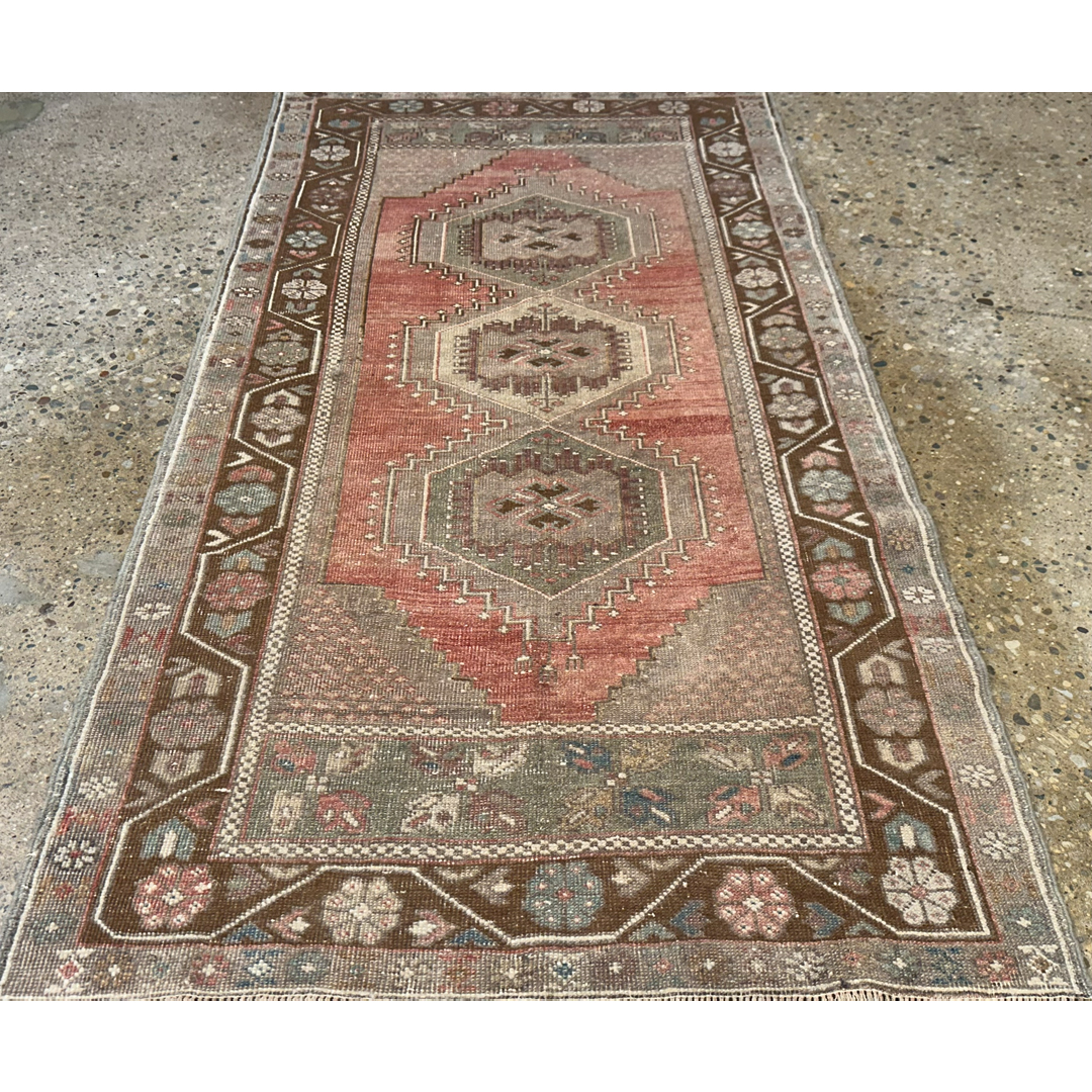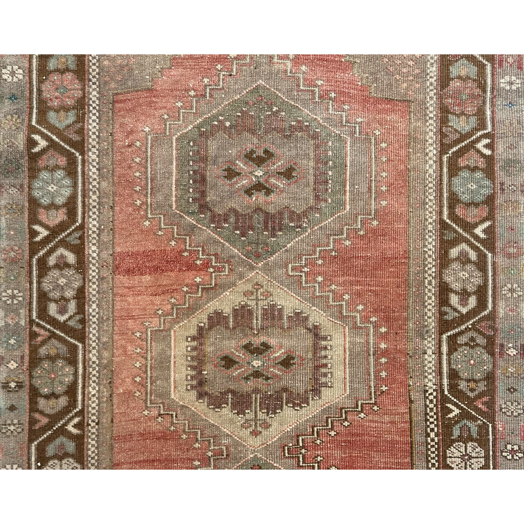 Radiating warmth, this Turkish rug is a beautiful testament to traditional weaving. The design is anchored by a trio of prominent, stepped diamond medallions rendered in soft taupe and espresso, floating elegantly against a beautifully faded terracotta and grey-brown field. The rug is framed by an intricate progression of borders, featuring a dark espresso-brown outer band adorned with delicate, repeating rosette motifs in subtle shades of sage green, dusty blue, and pink. Showcasing a stunning, time-worn patina, this piece offers a soft, lived-in texture that feels instantly like a family heirloom. Sized at approximately 3.5×6.5 feet, it is a lovely choice for adding a layer of sophisticated, organic color to an entryway, a galley kitchen, or alongside a bed.