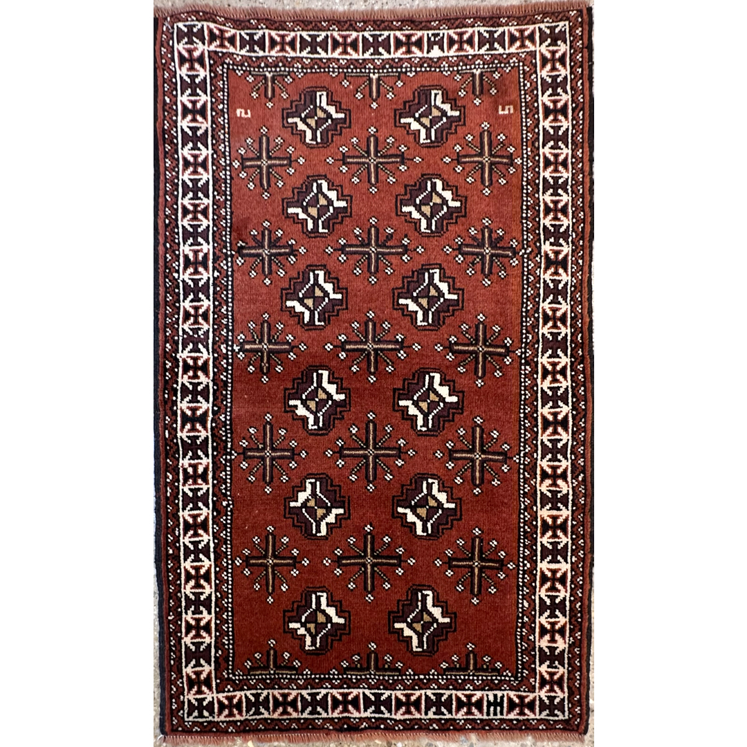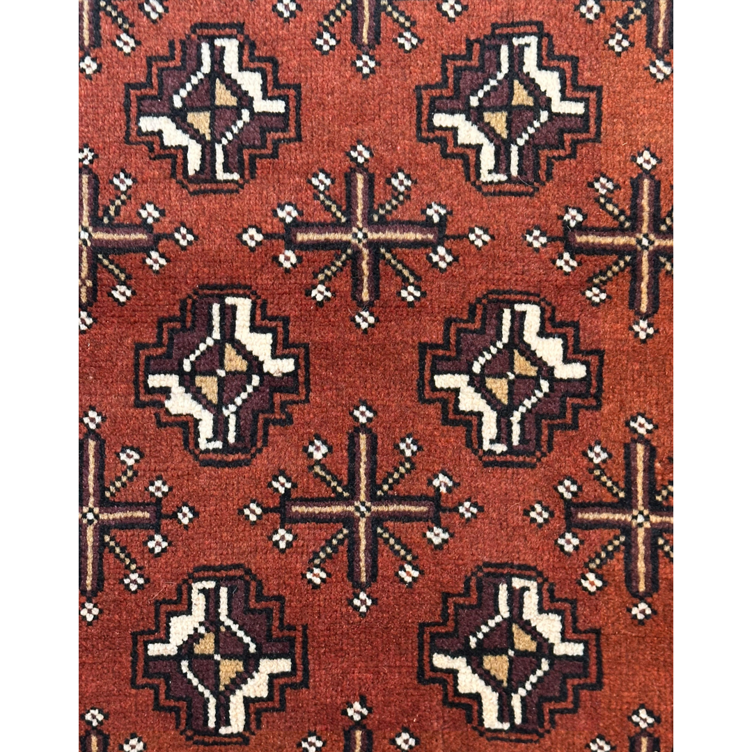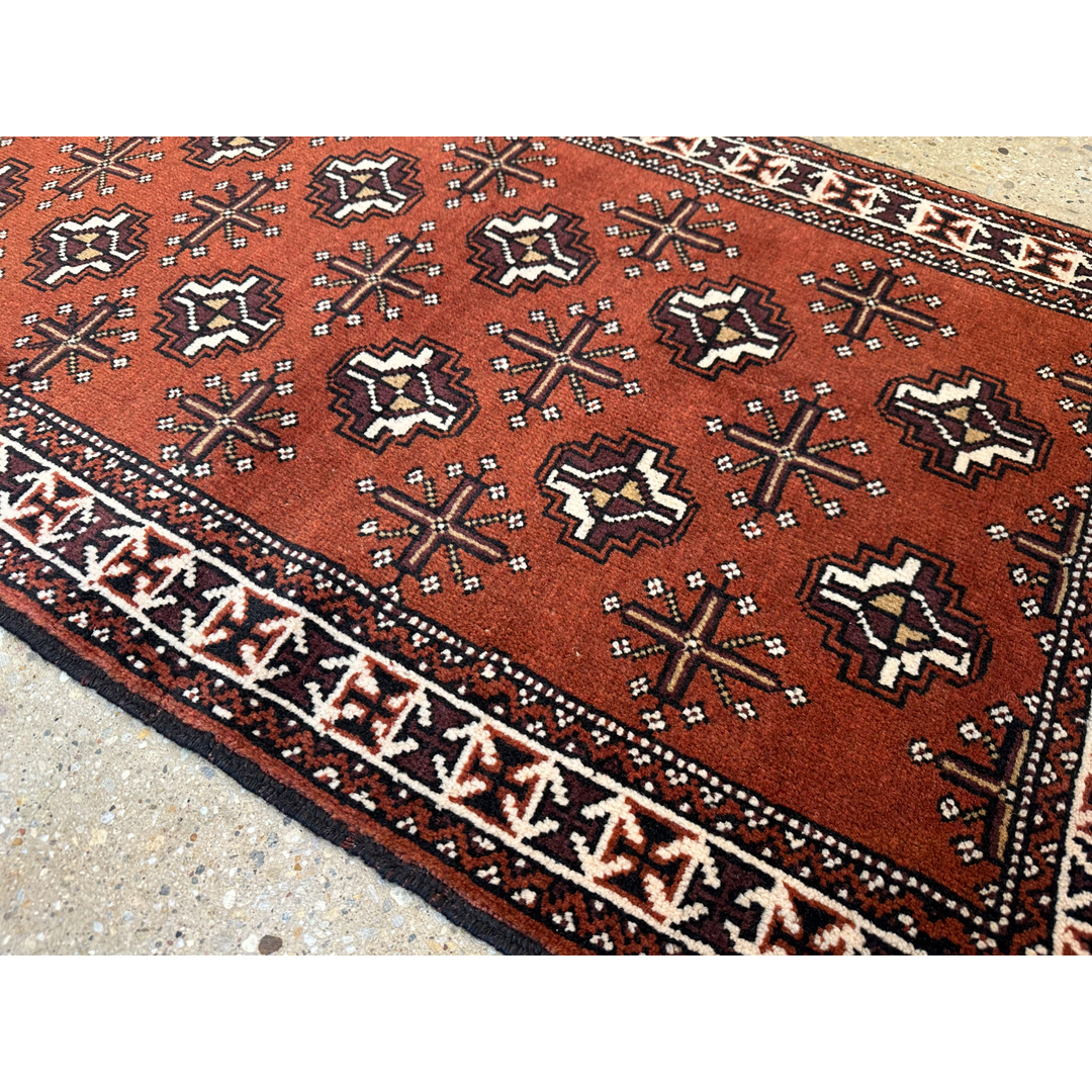 Bring a touch of nomadic tradition to your floor with this terrific 2’8″ x 4’4″ ft. antique tribal Turkmen rug. Woven in the 1960s, this piece features a warm, rust-red field that serves as a vibrant background for a rhythmic geometric pattern. The design consists of alternating rows of stylized cross motifs and hooked diamonds rendered in contrasting shades of ivory and deep espresso. A crisp, bright ivory border filled with a repeating geometric arrow design frames the composition, adding a sharp visual definition to the earthy palette. This durable and authentic village weaving is perfectly sized for adding character to a small entryway, kitchen corner, or bedside area.
