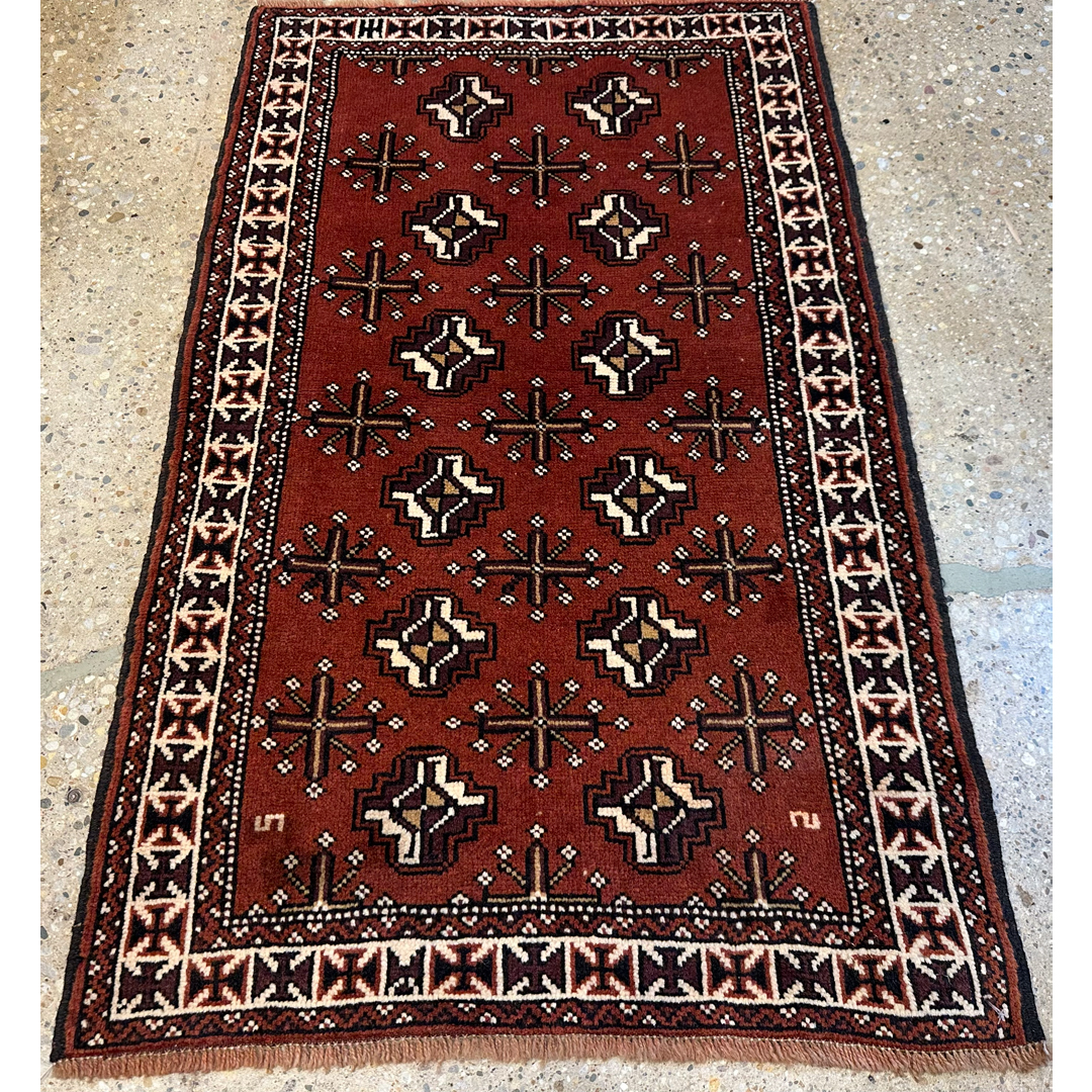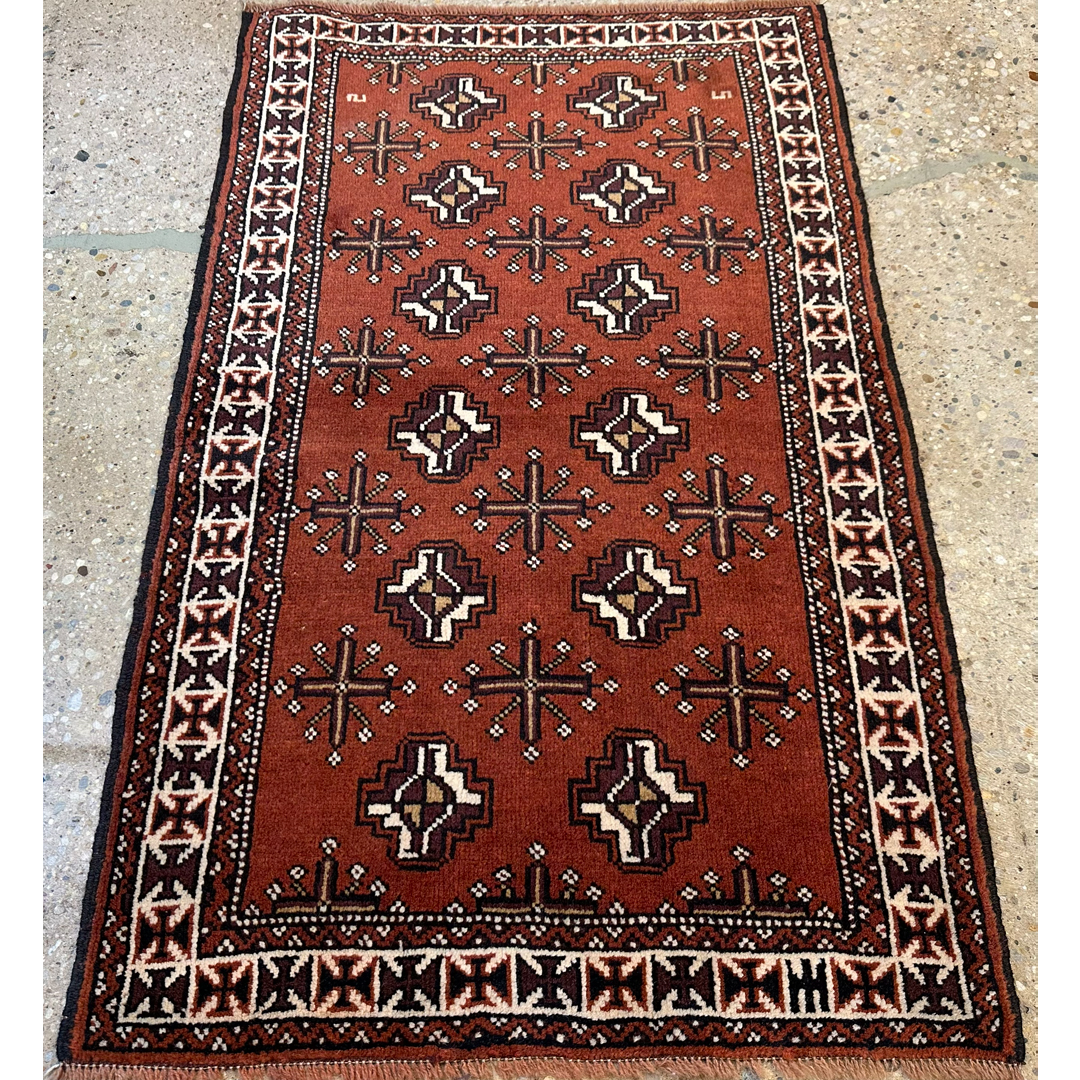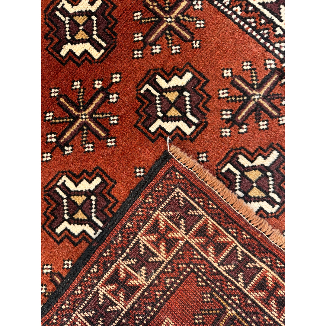 Bring a touch of nomadic tradition to your floor with this terrific 2’8″ x 4’4″ ft. antique tribal Turkmen rug. Woven in the 1960s, this piece features a warm, rust-red field that serves as a vibrant background for a rhythmic geometric pattern. The design consists of alternating rows of stylized cross motifs and hooked diamonds rendered in contrasting shades of ivory and deep espresso. A crisp, bright ivory border filled with a repeating geometric arrow design frames the composition, adding a sharp visual definition to the earthy palette. This durable and authentic village weaving is perfectly sized for adding character to a small entryway, kitchen corner, or bedside area.