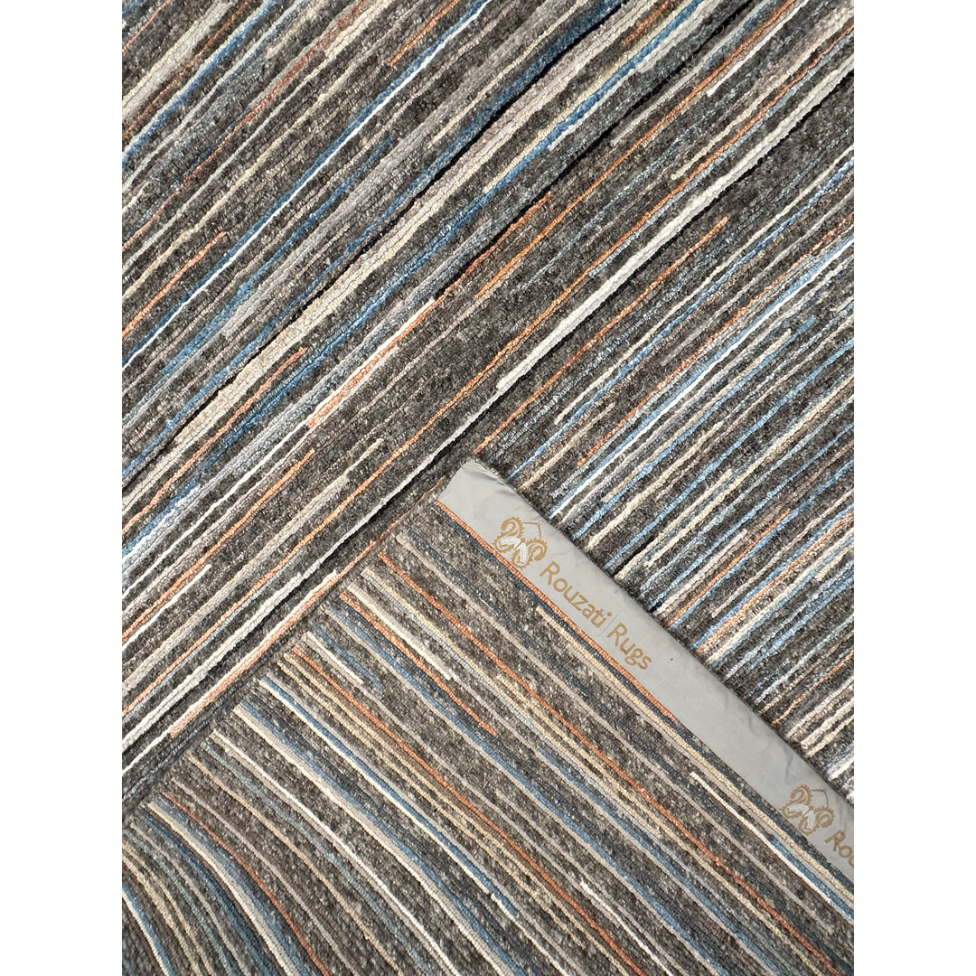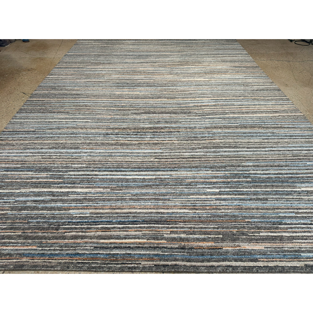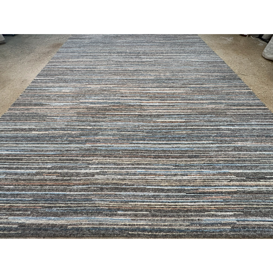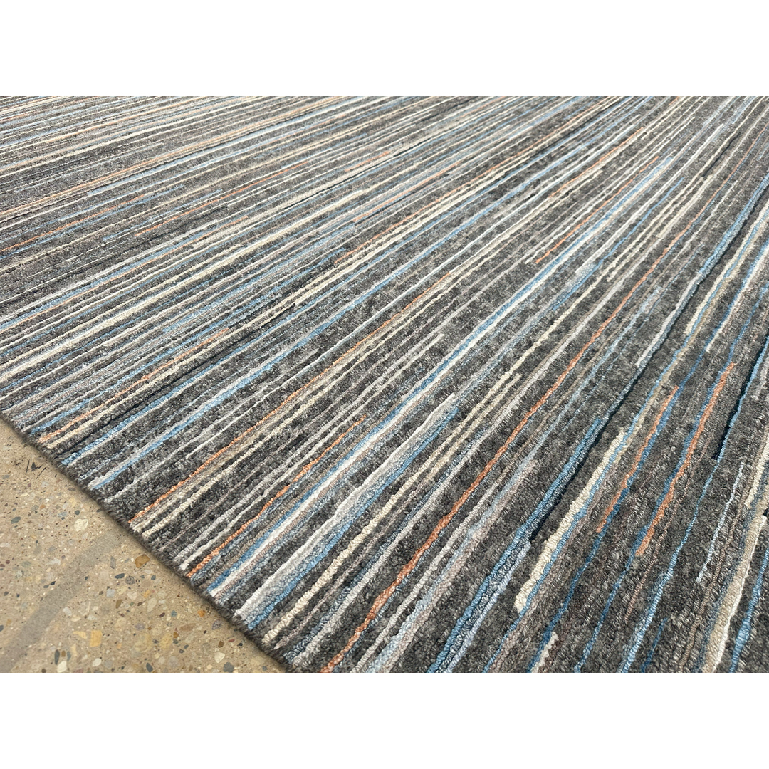 Embrace the sophisticated simplicity of this 10’2″ x 13’11” ft. modern rug. This piece features a captivating all-over pattern of fine horizontal stripes, creating a dynamic, linear effect. The multi-tonal palette artfully blends shades of charcoal gray, warm taupe, soft beige, ivory, and subtle hints of blue, offering a rich, textured look that remains beautifully neutral. Its generous size and versatile, minimalist design make it a perfect foundation for a contemporary living room, dining area, or home office, adding subtle movement and style to your space.