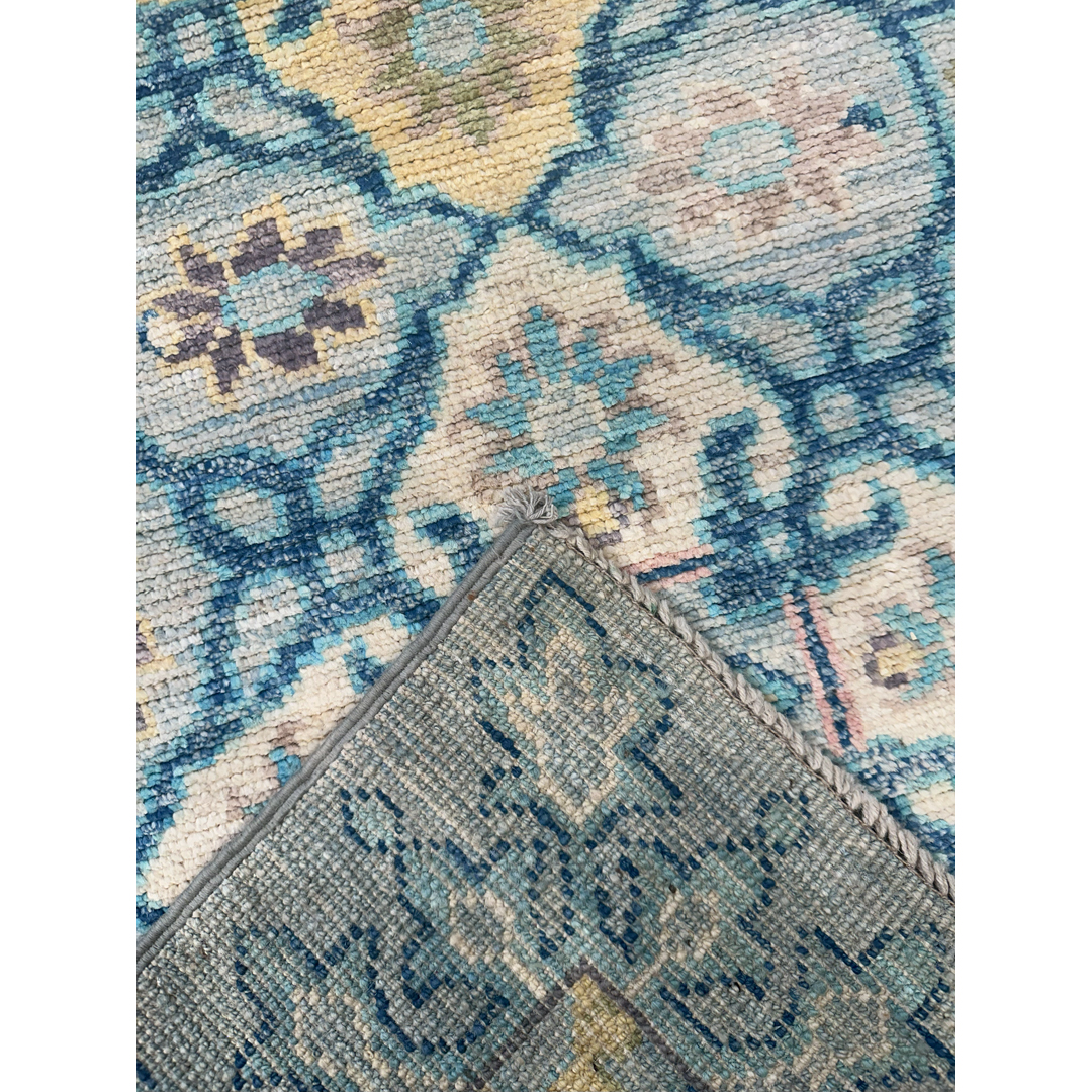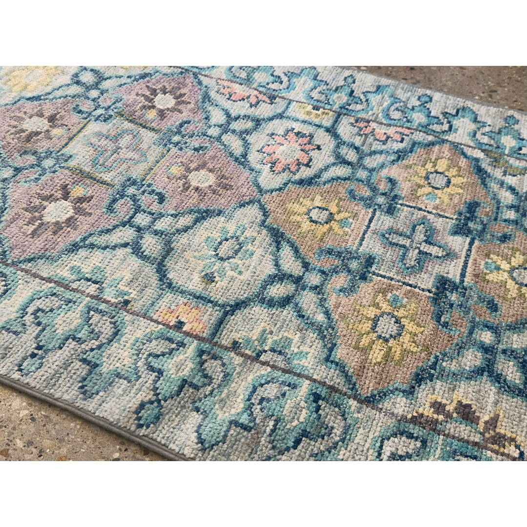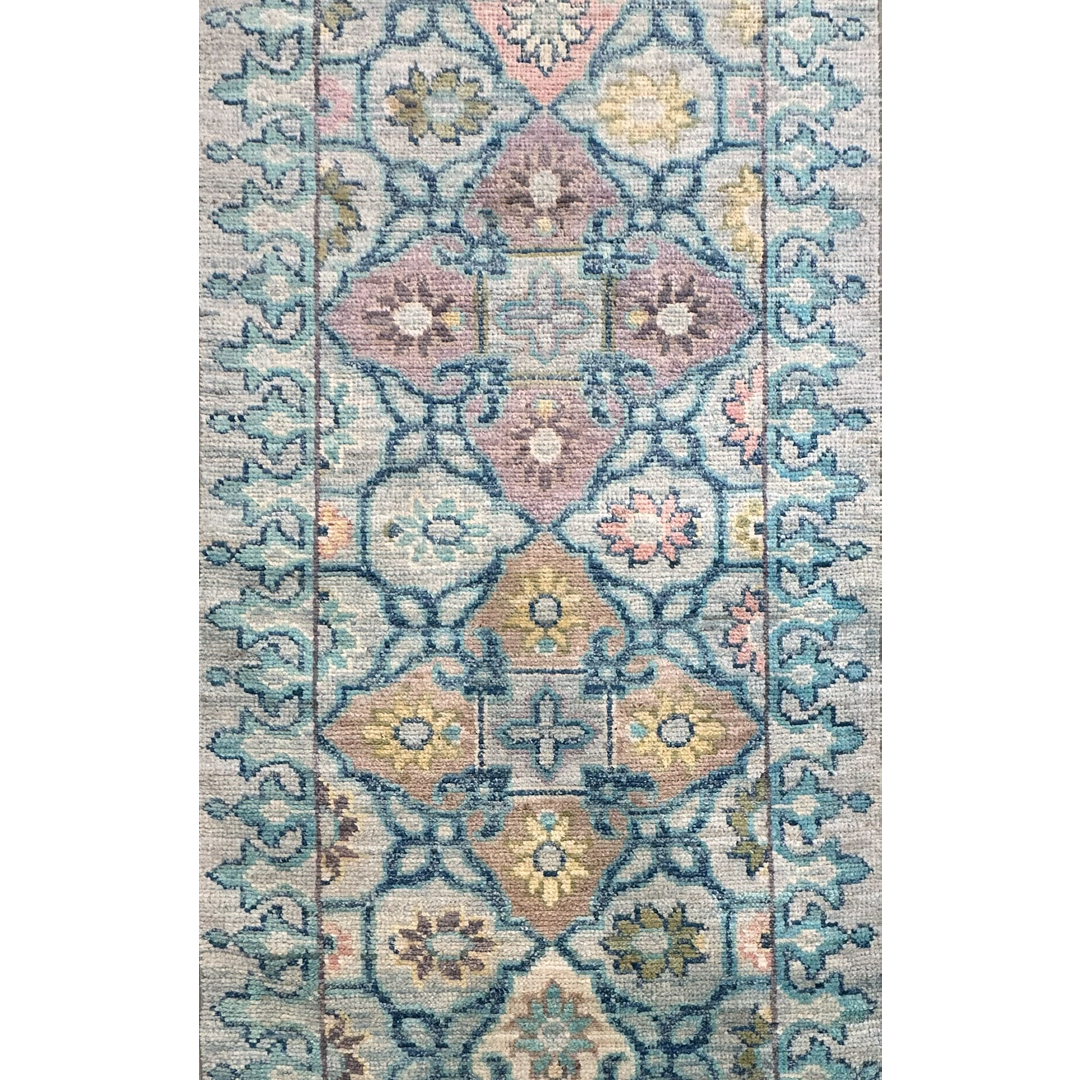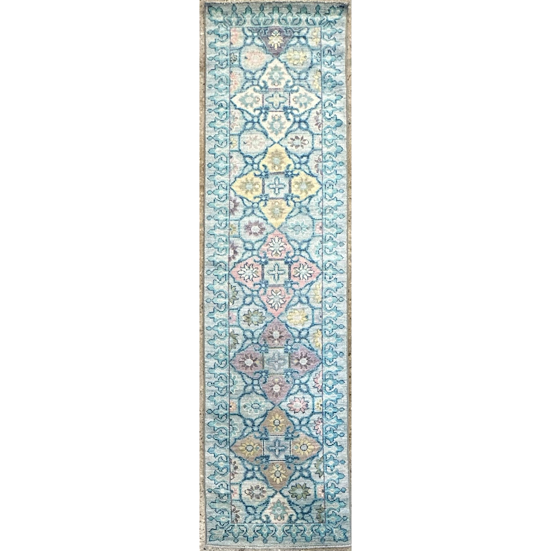 Add a touch of fresh flair to your hallway with this timeless transitional Afghan runner featuring a soft Oushak design. Measuring 2’7″ x 9’10” ft., this hand-knotted piece is defined by its serene and airy color palette, showcasing a luminous sky-blue field that feels fresh and inviting. The design features a vertical column of repeating geometric medallions and stylized floral motifs rendered in delicate pastel shades of blush pink, pale yellow, and lavender. Framed by a matching blue border adorned with a subtle vine pattern, this durable wool runner offers a sophisticated, transitional aesthetic perfect for brightening up a long corridor, kitchen, or coastal-inspired living space.