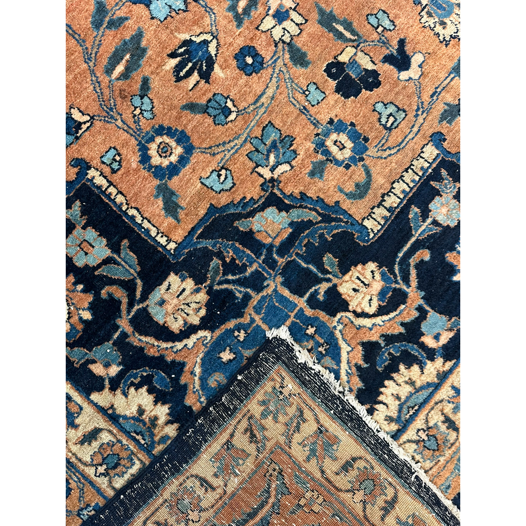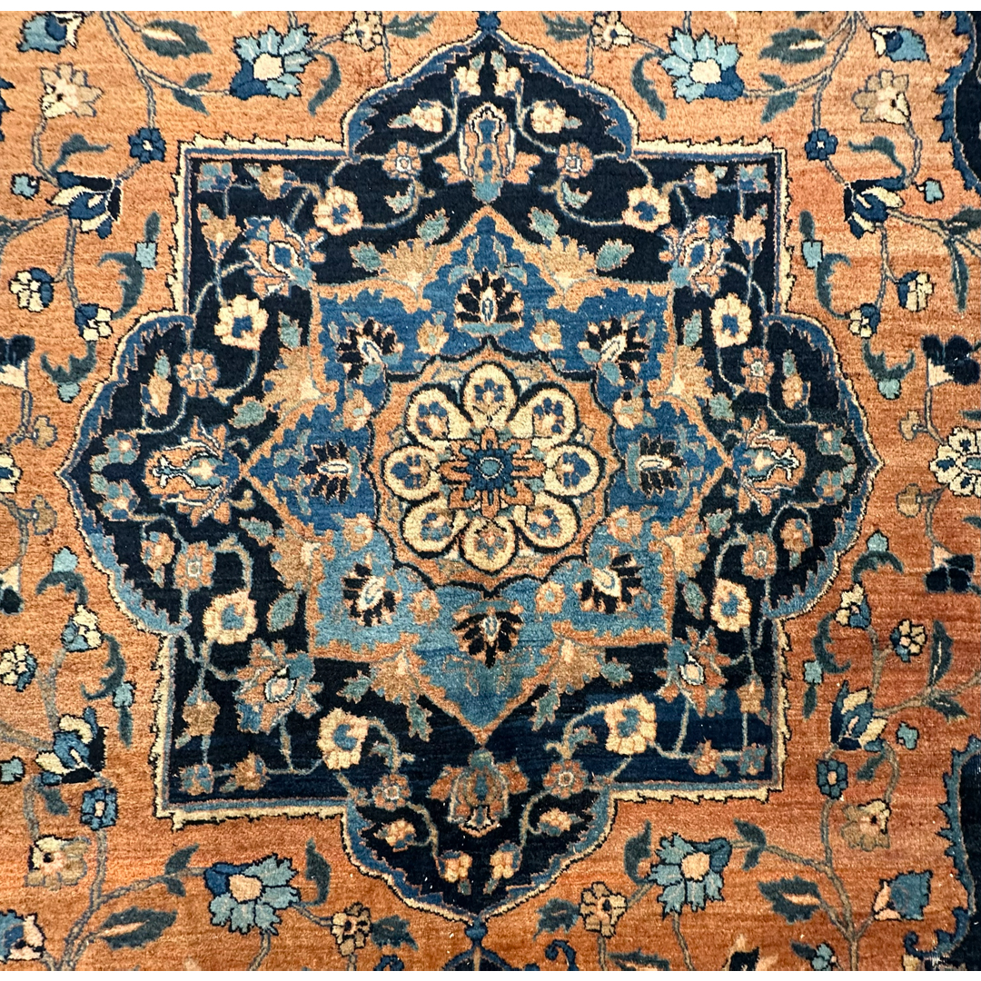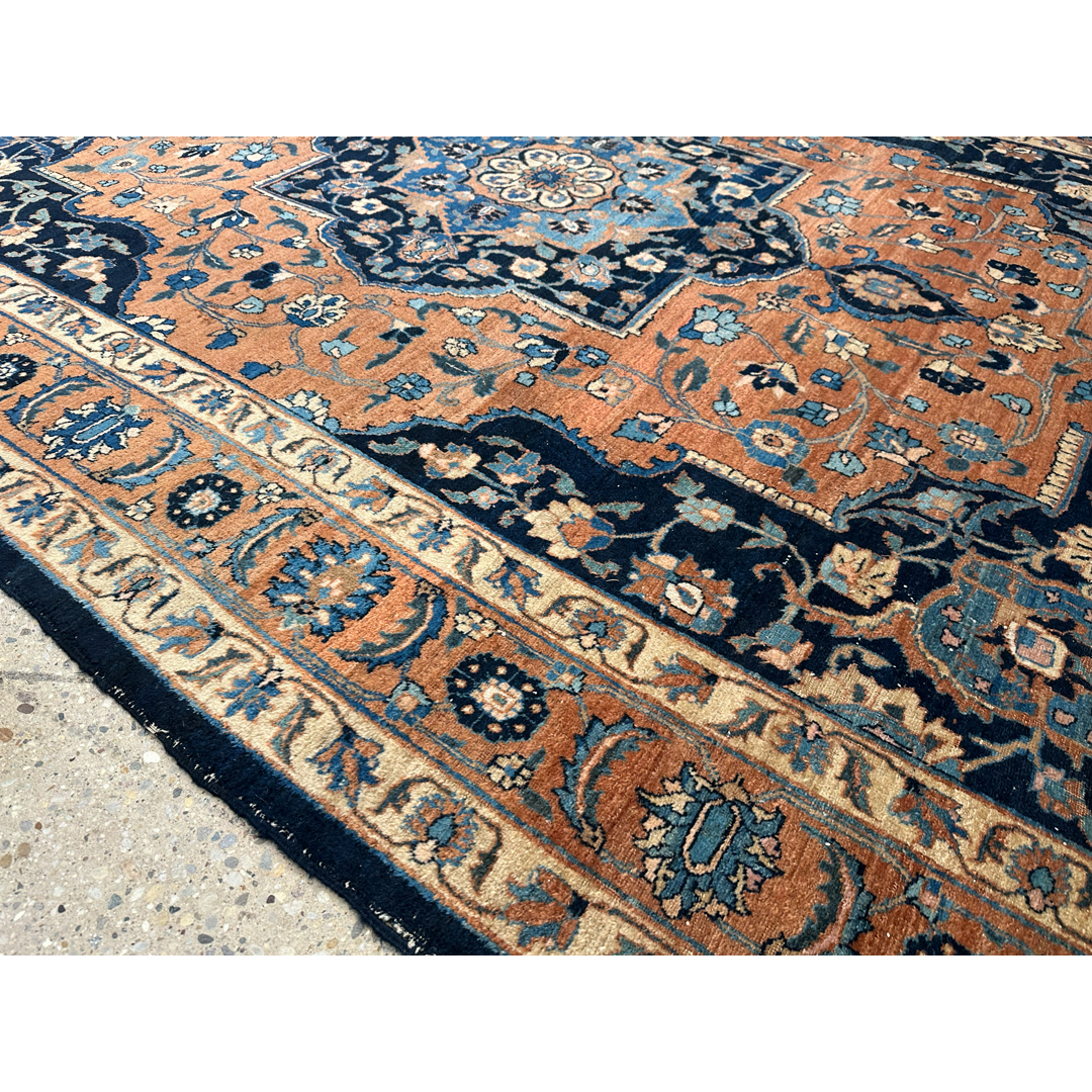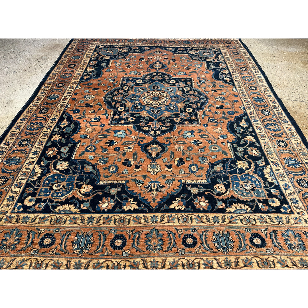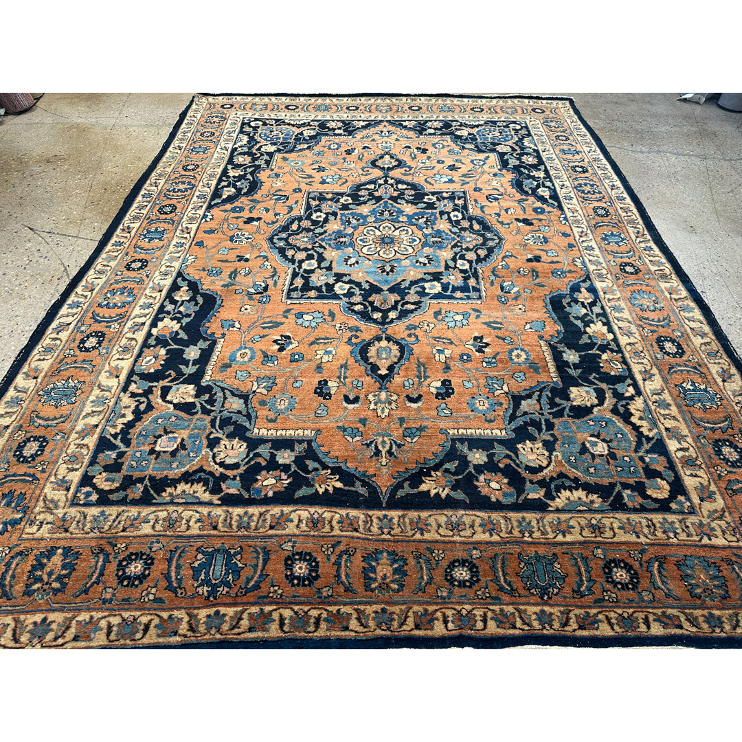 Anchor your formal interior with the warmth and sophisticated contrast of this traditional 9′ x 12’2″ ft. antique Persian Tabriz rug. Hand-knotted in the 1900s, this distinguished piece features a lush field of soft copper apricot, a unique tone that imbues the room with a welcoming glow. The composition is dominated by a grand, lobed central medallion rendered in deep midnight indigo and slate blue, which stands out dramatically against the warm background. Matching dark navy corner spandrels frame the design, while the open areas are densely populated with scrolling vines and Shah Abbas palmettes. A detailed border filled with a classic floral meander completes the look, making this rug an ideal centerpiece for a grand library, dining hall, or executive suite.
