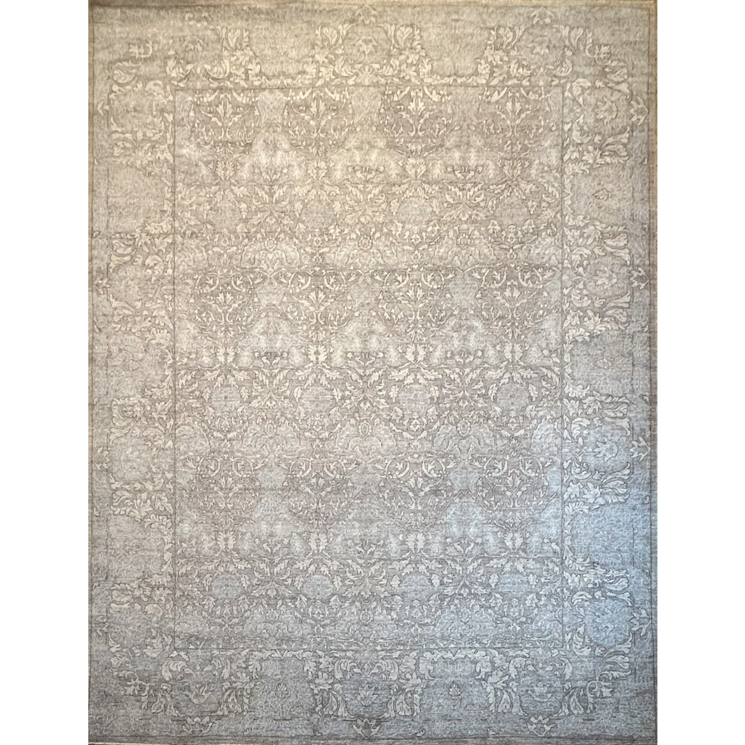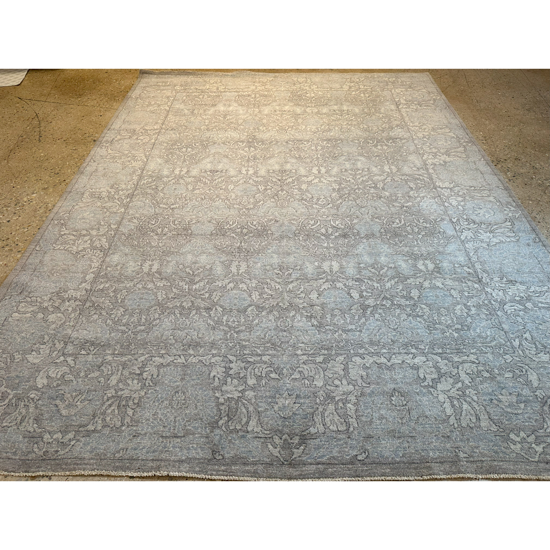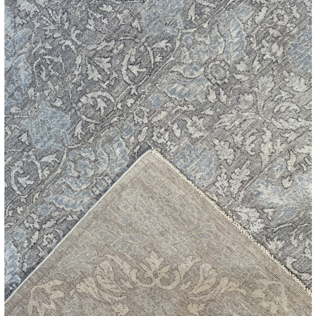This exquisite hand-knotted Afghan Peshawar design rug epitomizes the elegance of tone-on-tone design. The sophisticated, all-over composition features an intricate, continuous network of sweeping botanical vines, scrolling foliage, and classic floral palmettes. Woven in a highly luminous, monochromatic palette of pearl grey, soft blue, and silvery beige, the traditional motifs blend almost seamlessly into the background, creating a serene, textural surface that whispers rather than shouts.