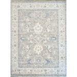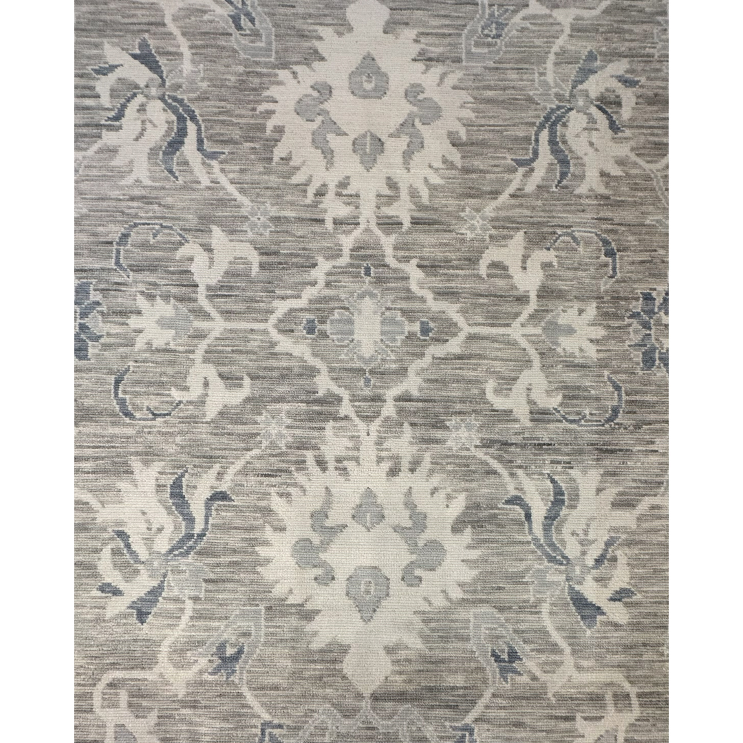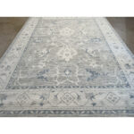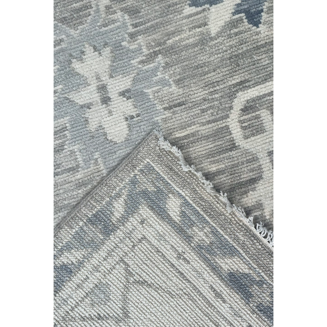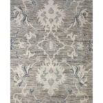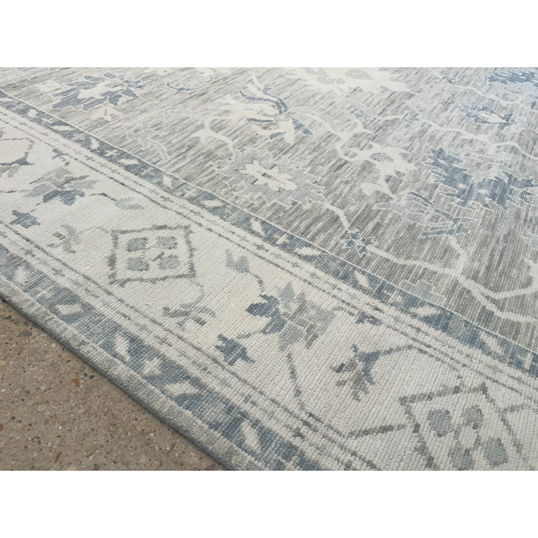 This beautiful hand-knotted Indian rug offers a sophisticated, transitional interpretation of classic Oushak design. The composition features an elegant, airy arrangement of oversized, stylized palmettes and sweeping botanical vines. Rendered in crisp ivory and muted slate blue, these traditional motifs pop beautifully against a highly textural, striated field of soft dove gray. The rug is characterized by a striking horizontal “abrash” effect throughout the cool gray background, giving the dyed wool an organic depth that softens the large-scale pattern and provides a relaxed, lived-in feel. Framed by a wide, luminous ivory border with coordinating geometric floral accents, this piece maintains a beautifully tranquil, low-contrast aesthetic. With its versatile 8’11” x 11’11” ft. dimensions, this carpet is a flawless foundation piece.