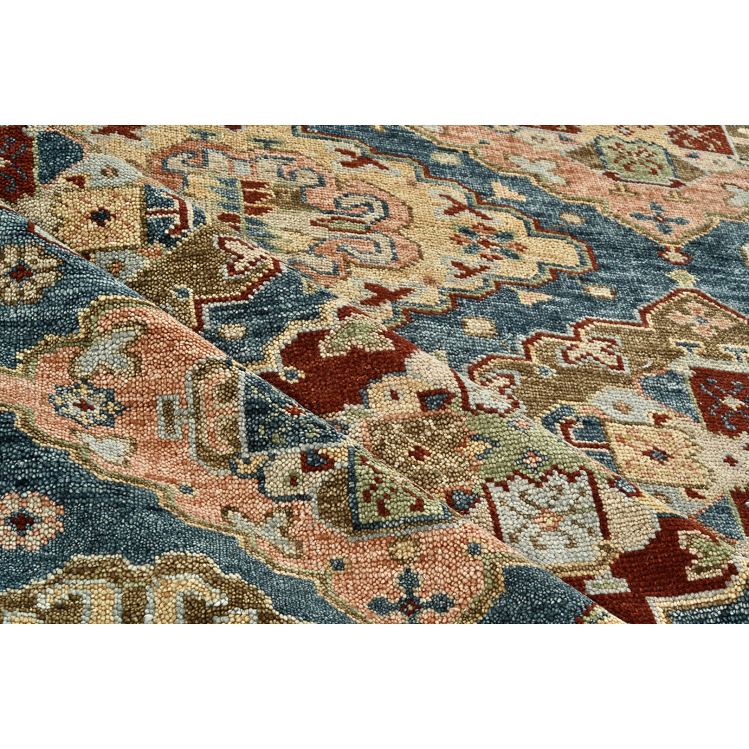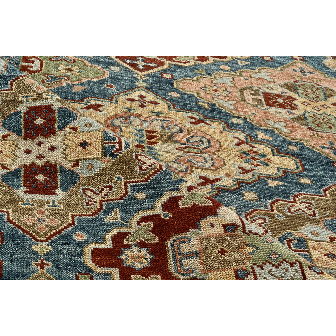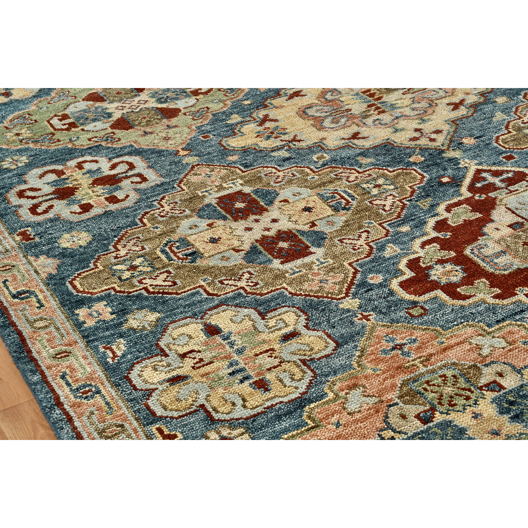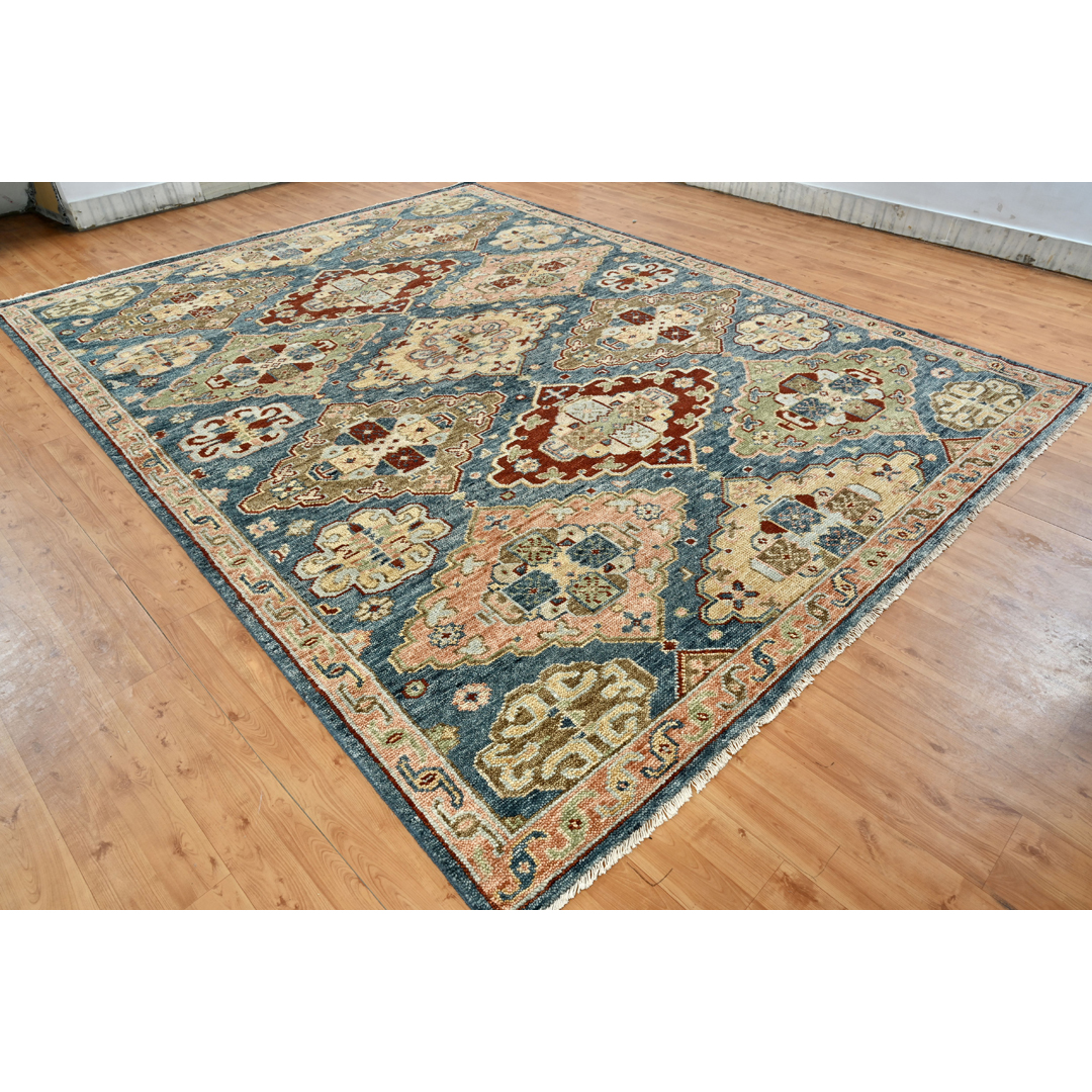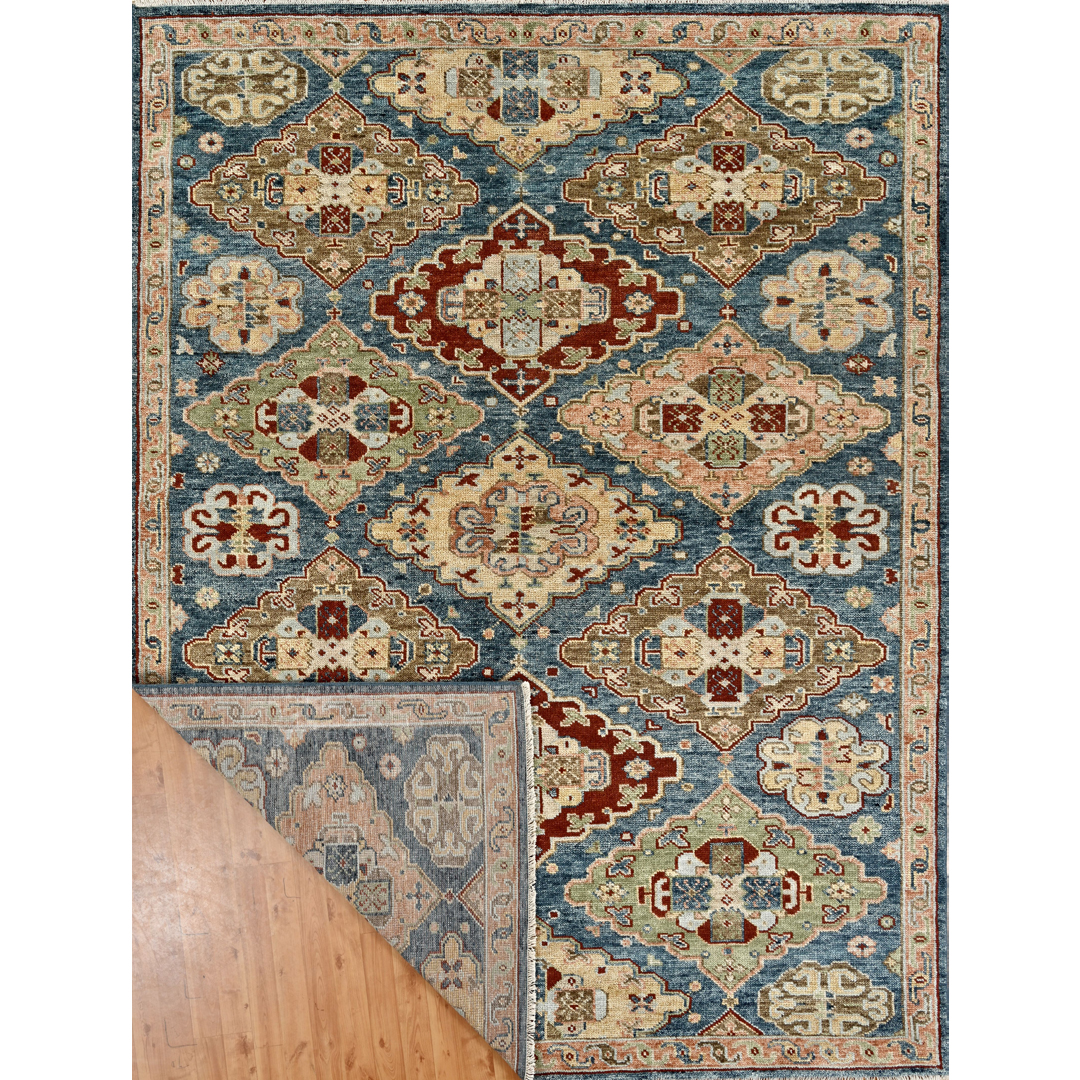 This hand-knotted Indian rug offers a fresh, vibrant take on traditional tribal geometry. The all-over repeating composition features a striking lattice of large, ornate diamond medallions. Each medallion is intricately detailed with classic stepped edges, cruciform centers, and geometric botanical motifs reminiscent of antique Caucasian or Kazak weaving. Rendered in a lively, multi-colored palette of rich rust red, soft sage green, warm gold, pale peach, and crisp ivory, these dramatic geometric figures pop beautifully against a deeply textured, heathered denim-blue field. The rug exhibits a gorgeous horizontal “abrash” effect throughout the blue background, lending a relaxed, beautifully striated depth that perfectly bridges the gap between classic tribal artistry and modern transitional design. Measuring 7’10” x 9’10” ft., this durable, premium wool carpet provides an exceptionally warm and tactile foundation. It is flawlessly scaled to anchor a bustling family room, a cozy study, or a welcoming, eclectic dining space.