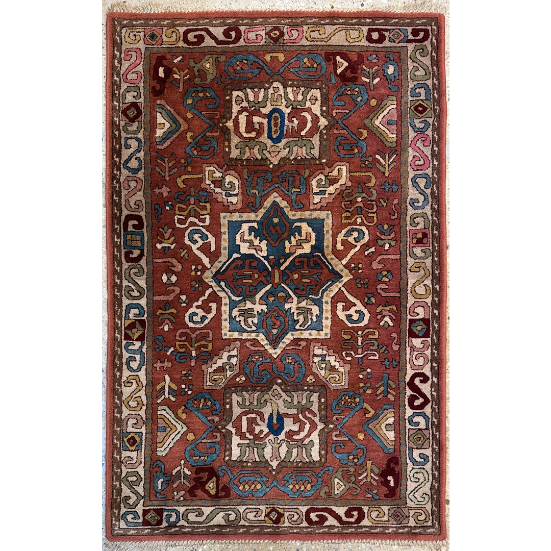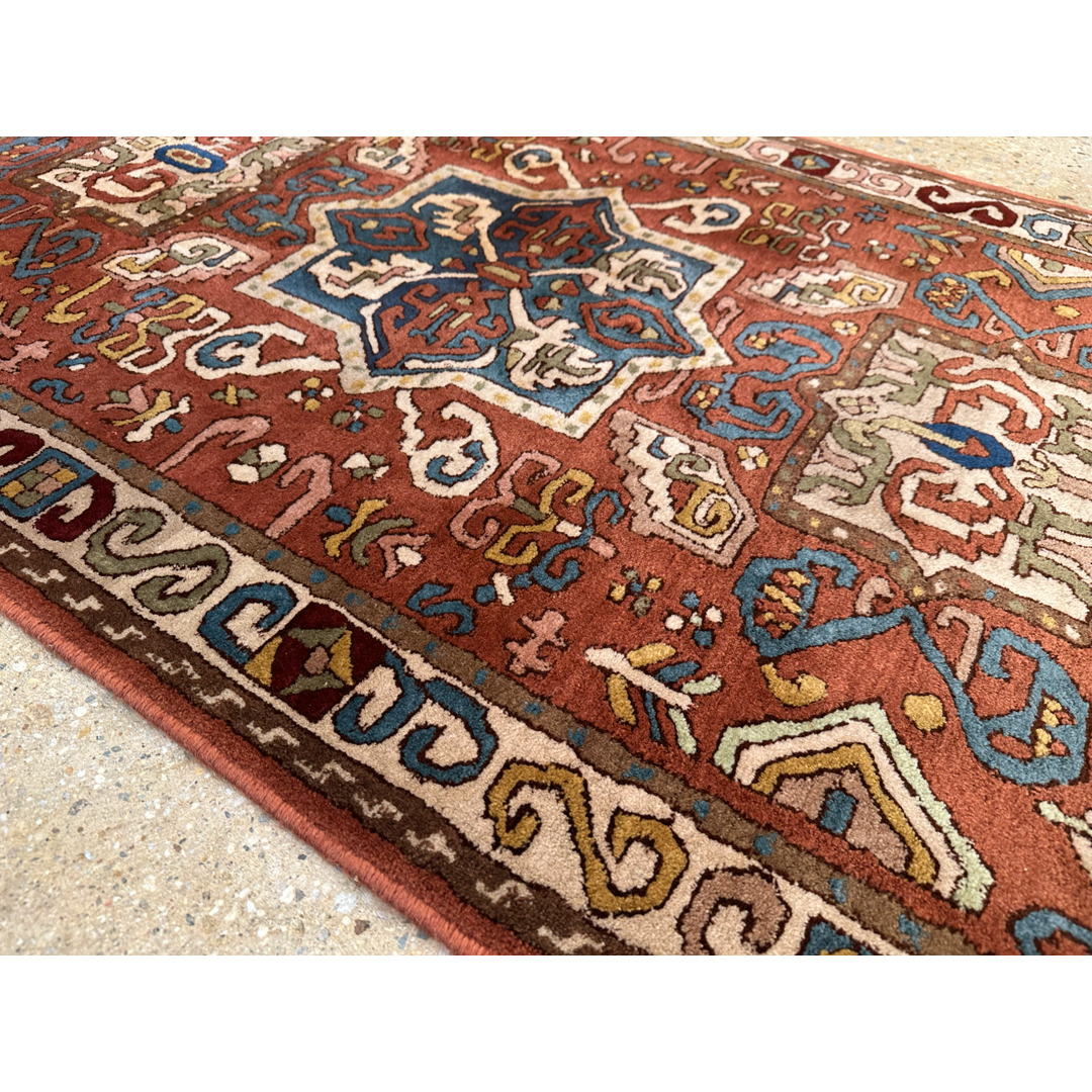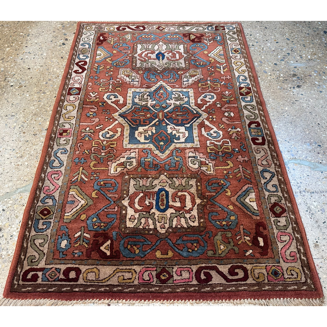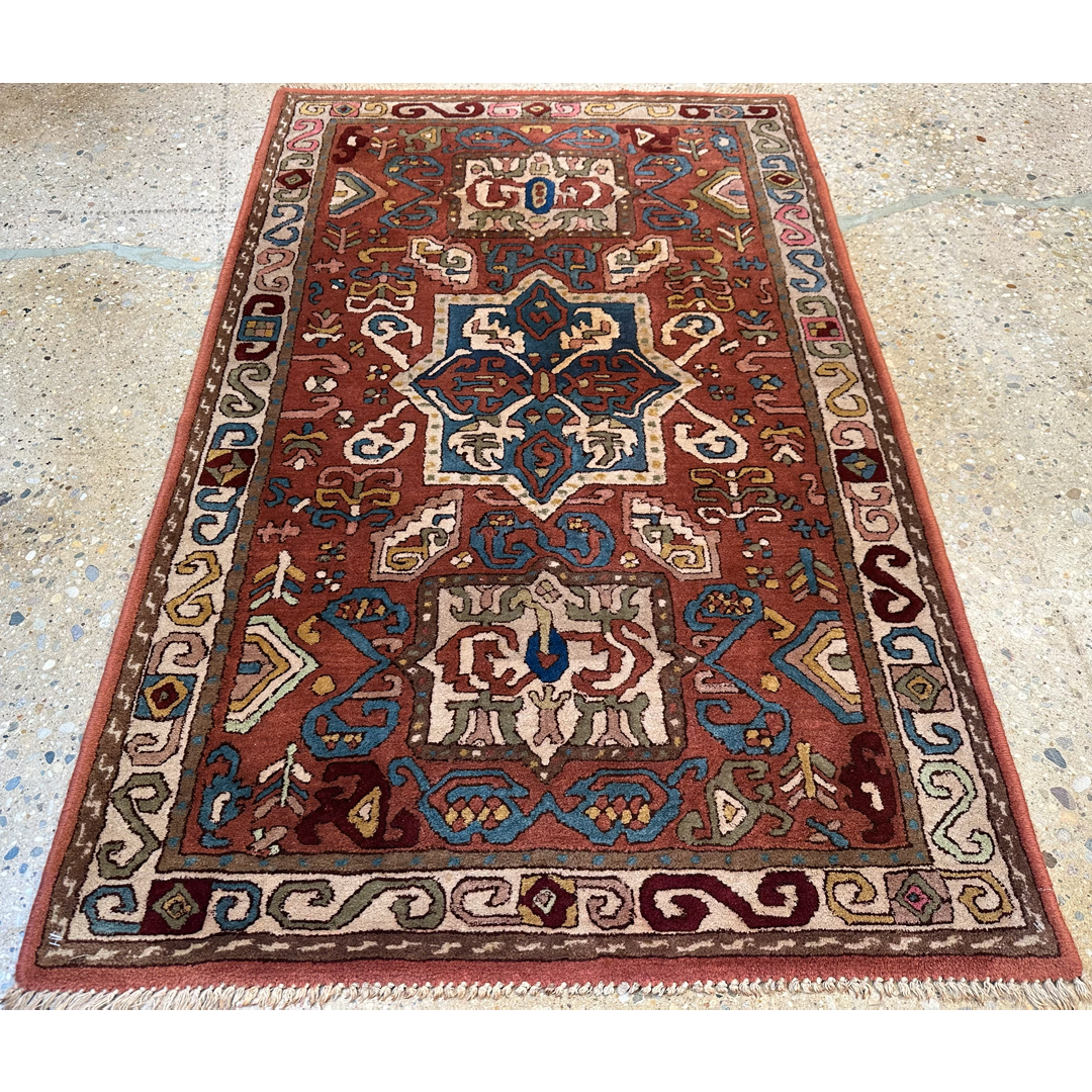This 1930s antique German Tetex rug is a fascinating piece of textile history, expertly mimicking the bold aesthetic of Caucasian tribal weaving with European precision. The design features a striking central starburst medallion in deep indigo and ivory, set against a rich, rusty terracotta field. Surrounding the center are stylized geometric motifs and abstract figures rendered in vibrant accents of mustard yellow, sage green, and soft pink. A classic running-dog border frames the composition, adding dynamic movement to the structured layout. Known for their incredible durability and dense, heavy pile, Tetex rugs were engineered to last generations. Measuring 3’2″ x 5′ ft., this rug brings substantial presence and warmth to a foyer, kitchen, or reading nook, offering the look of a rare tribal antique with the robust construction of German craftsmanship.