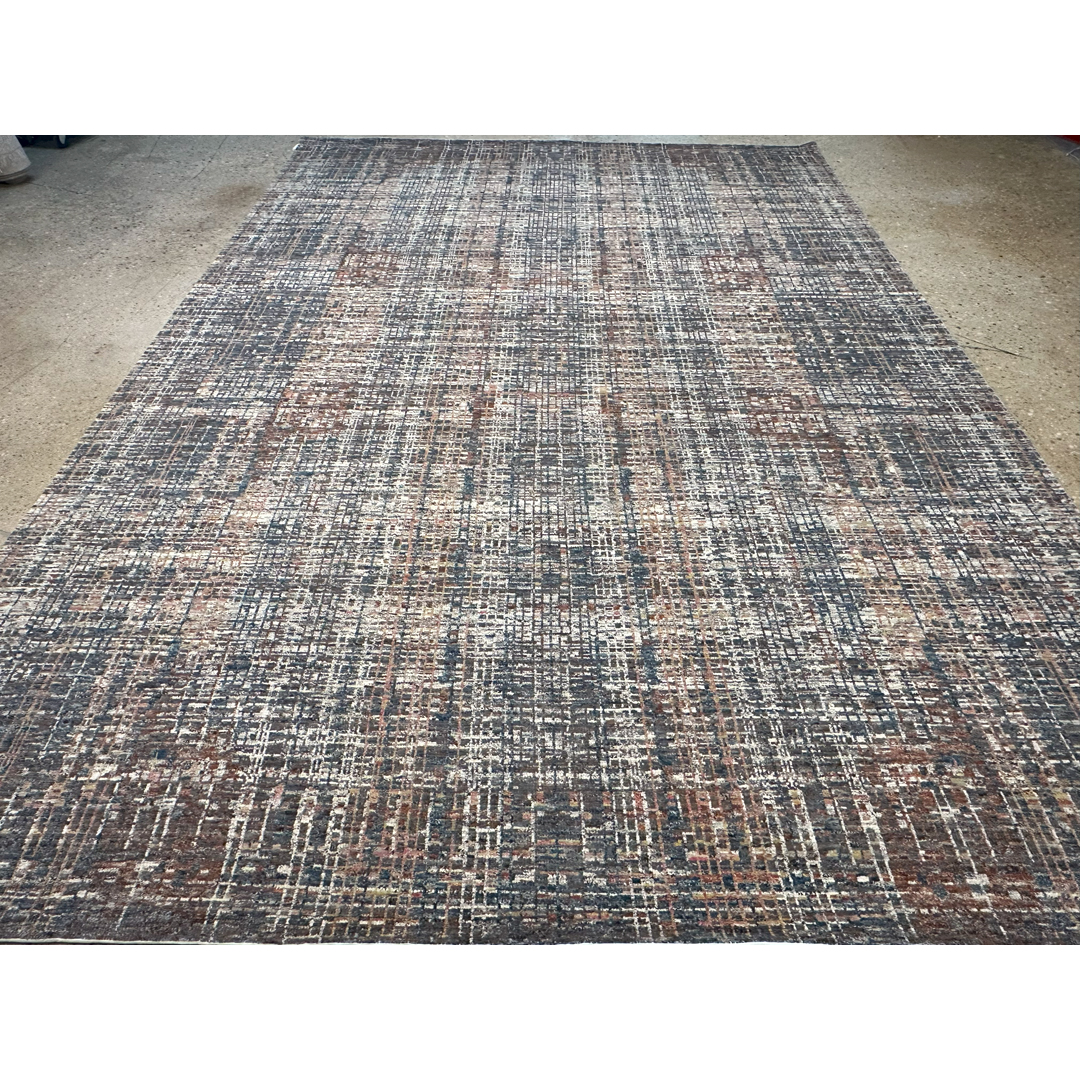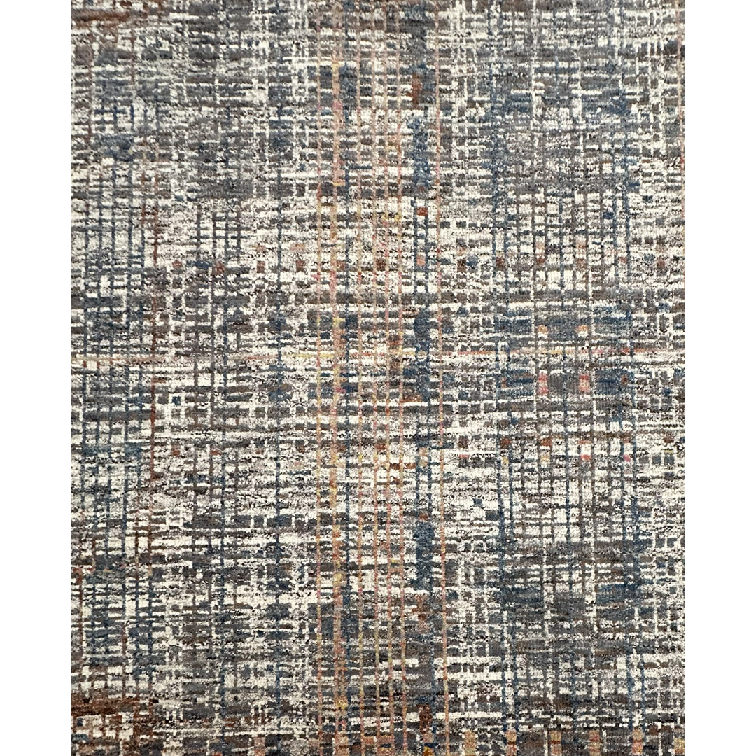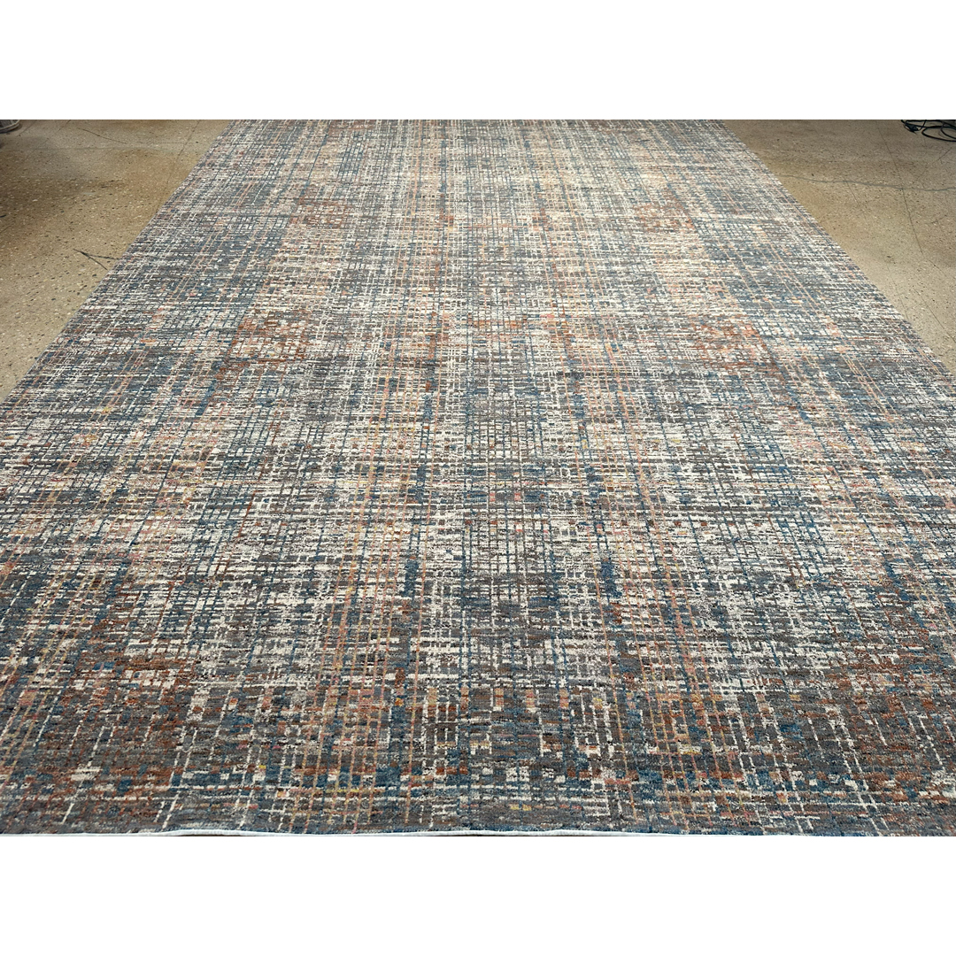 Urban Grid – Modern Abstract Rug in Gray, Blue & Rust – 9’11” x 14’1″ ft.