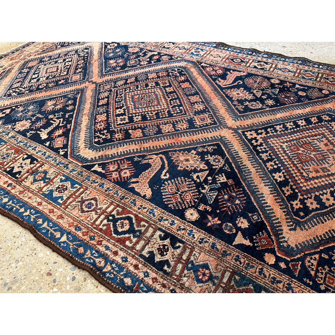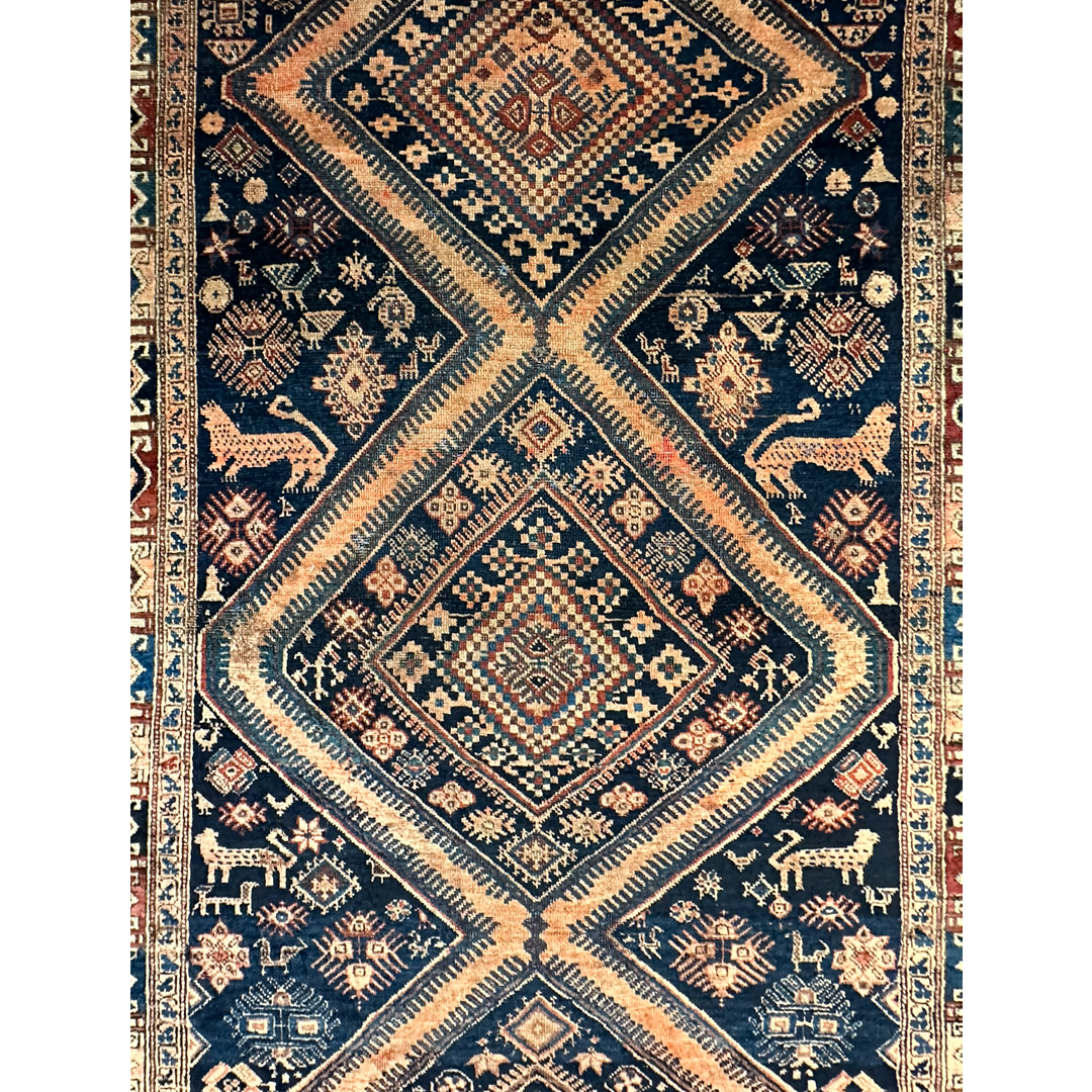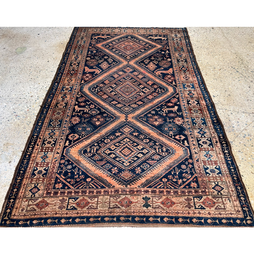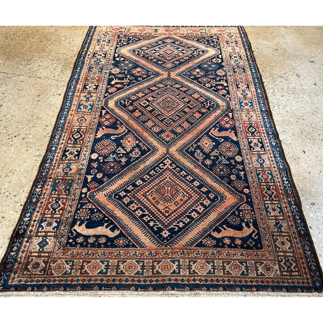 This Valuable Viss rug is a striking 1930s Antique Persian Tribal piece measuring 4’7″ x 7’10” ft., celebrated for its bold geometry and commanding presence. Anchored by a deep, midnight indigo field, the design features a dramatic central pole consisting of three large, concentric diamond medallions rendered in warm terracotta and rust hues. This contrasting color palette creates a vibrant visual energy typical of the Hamadan region’s village weavings. The dark blue background of this hand-knotted rug is densely populated with whimsical tribal motifs, including stylized animal figures—likely lions or guard dogs—scattered among geometric stars and amulets. Framed by a complex, multi-layered border featuring classic rosette and vine patterns, this antique artifact offers a robust, historic charm that serves as a captivating focal point for any hallway, entry, or intimate study.