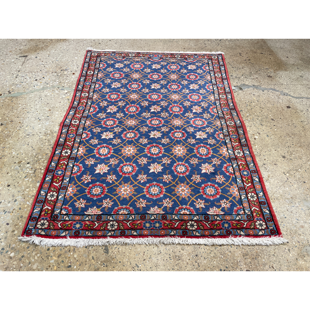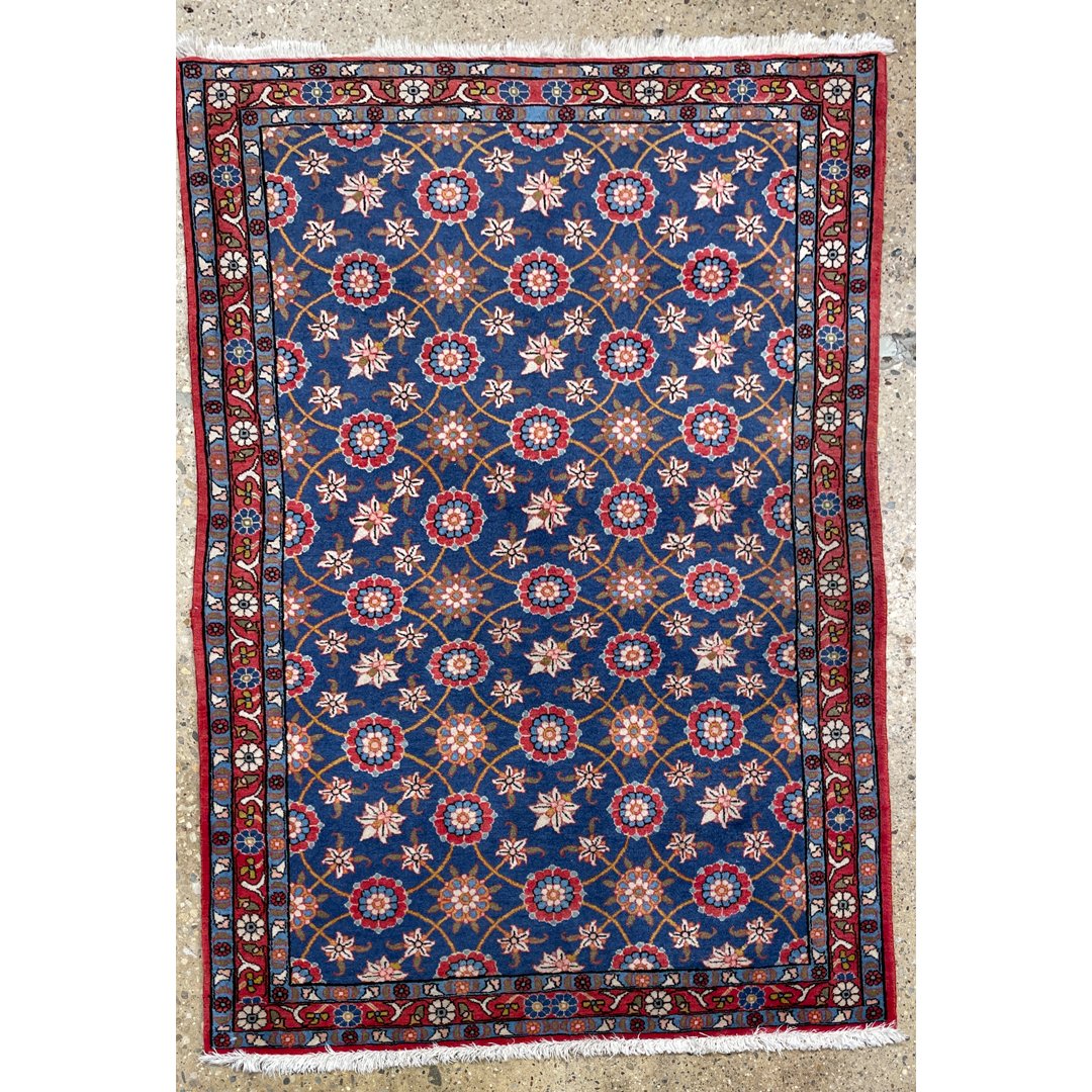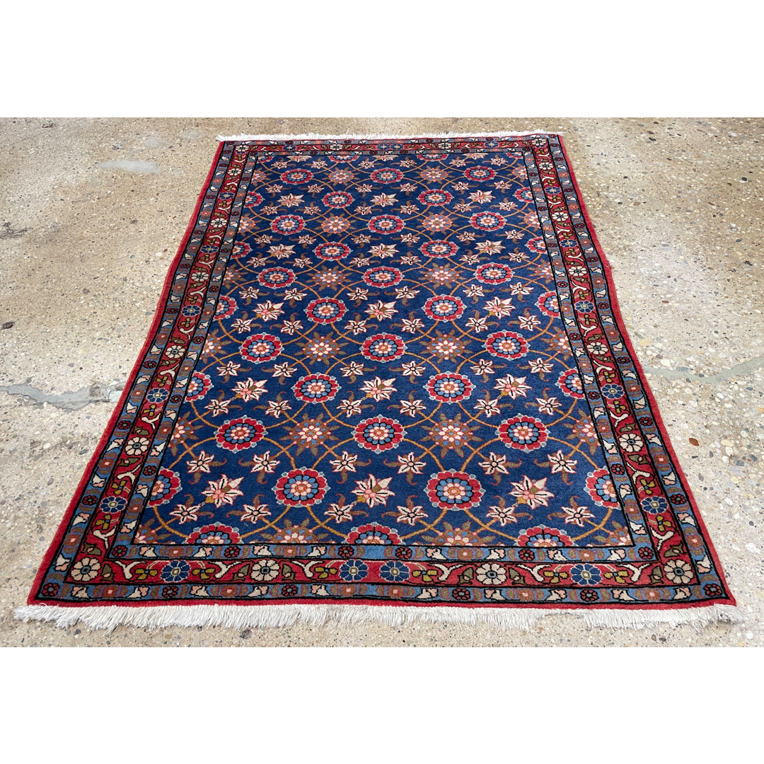Add a splash of color and sophistication to your home with this vibrant 3’4″ x 4’10” ft. antique Persian Varamin rug. A genuine hand-knotted treasure from the 1930s, this piece features the classic Mina Khani design, renowned for its intricate all-over lattice of blooming rosettes and daisy-like flowers. The vivid motifs in shades of rust-red, ivory, and soft blue pop beautifully against the rich, deep indigo blue field. Framed by a complementary red border adorned with a winding floral vine, this durable and elegant rug is an excellent choice for adding a refined, traditional touch to an entryway, study, or bedroom.