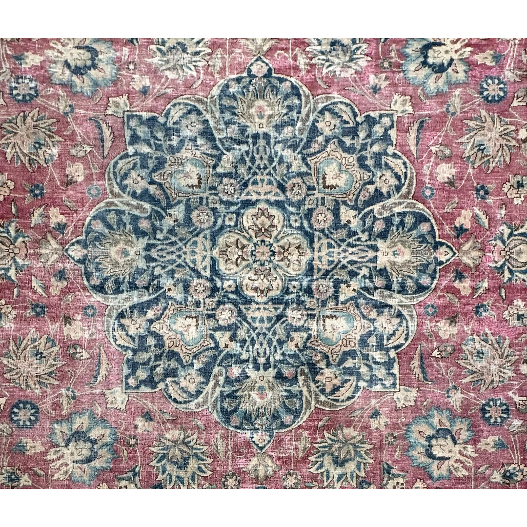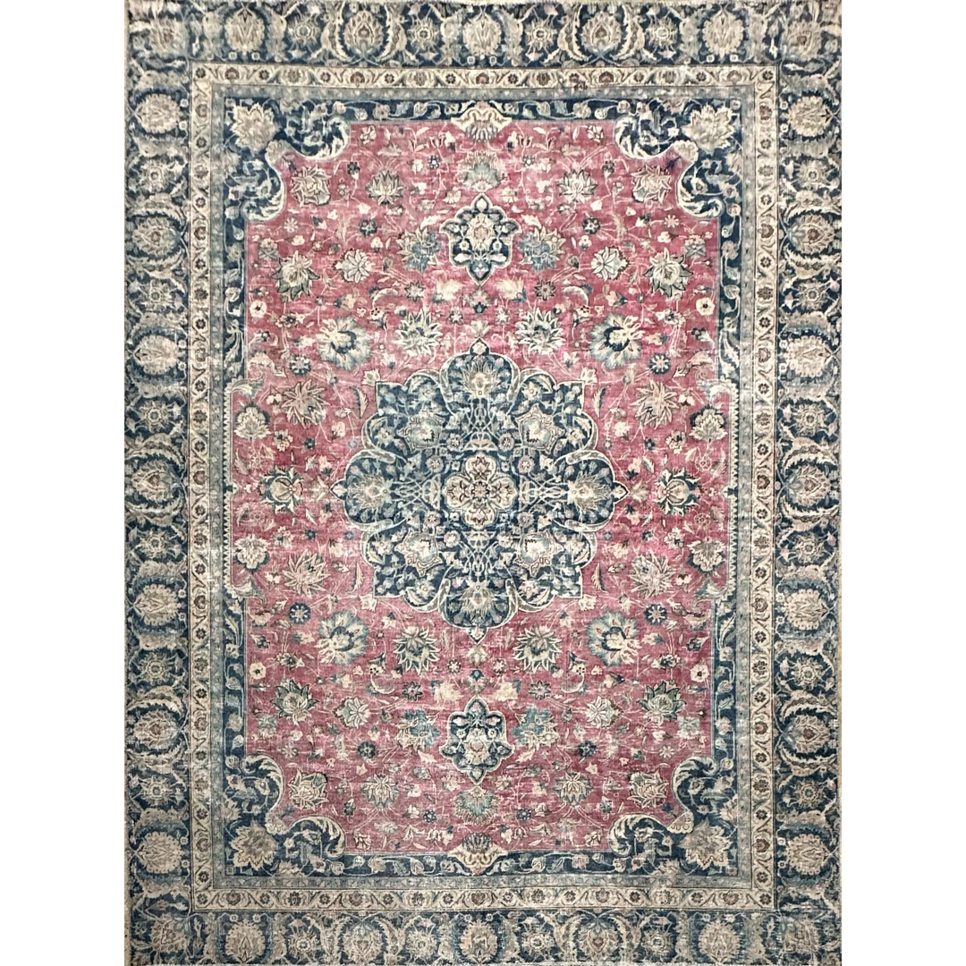 Reimagining traditional hand-knotted motifs with a beautifully whimsical approach, this delightfully distressed vintage Persian rug transforms historic weaving into a vibrant, textural masterpiece. The classic central medallion design has been expertly worn to a chic, low-profile finish, allowing the rich, captivating navy blue and faded pink dyes to soften into an inviting, lived-in aesthetic. This meticulous process leaves behind a beautifully crisp version of the rug’s original intricate geometry. The result is a highly versatile, brilliantly energetic foundation that serves as the perfect statement piece for bringing a luxurious, joyful, and historically rich atmosphere to your interior.