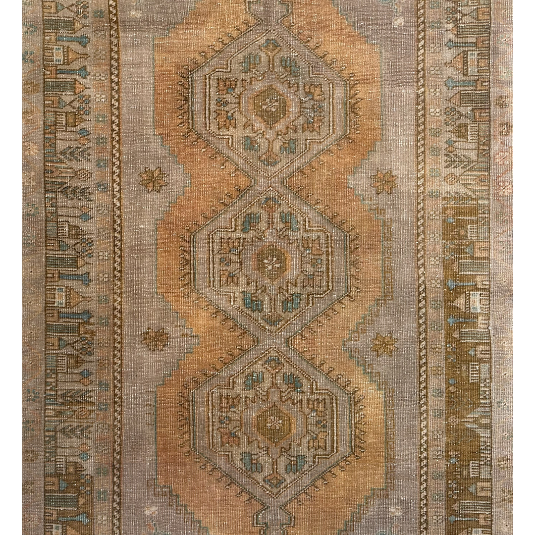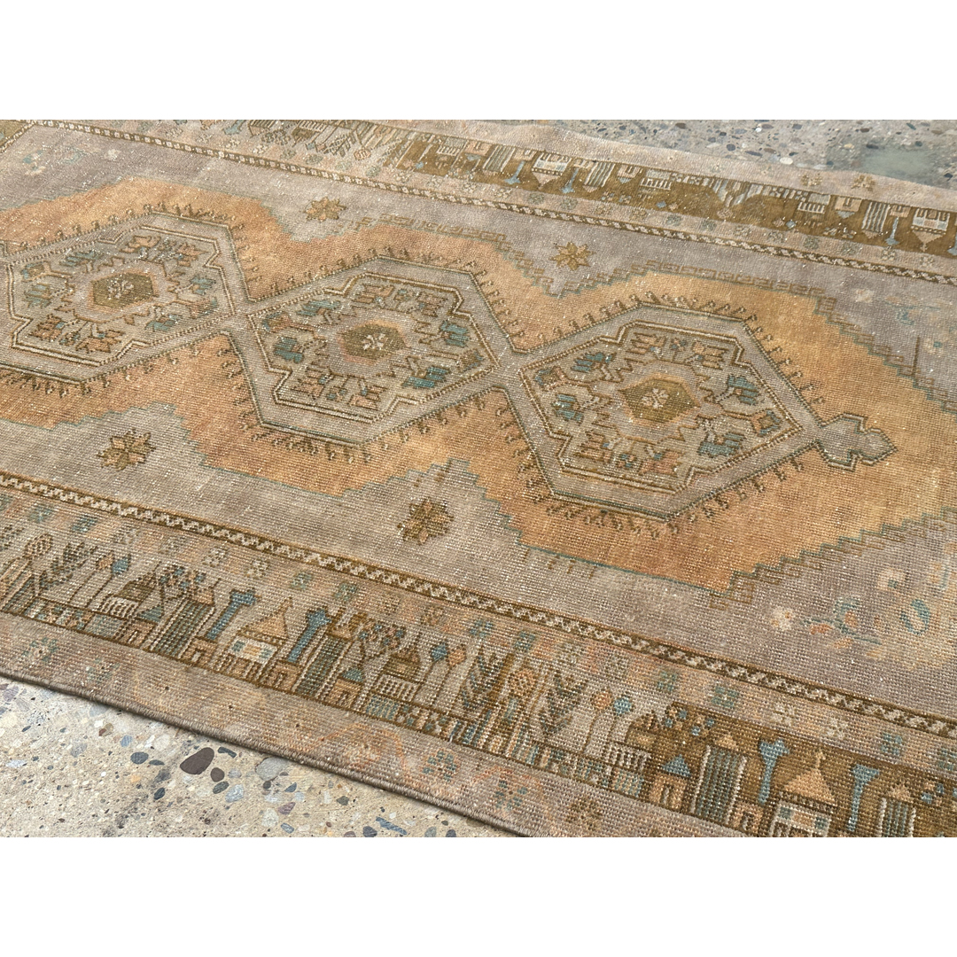 This ~3×6 vintage Anatolian carpet is a brilliant study in understated tribal geometry. The central composition is defined by a trio of interlocking diamond medallions that gently anchor the gold and gray field without visually dominating the space. Particularly noteworthy is the rug’s intricate border, which features unique, stylized architectural and village motifs rendered in whispers of faded sage and taupe.